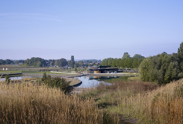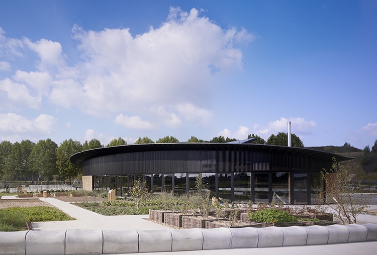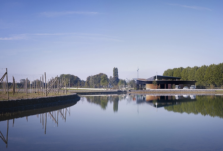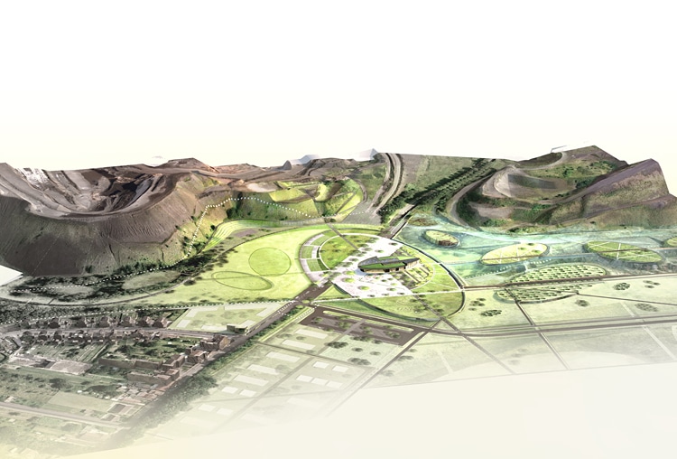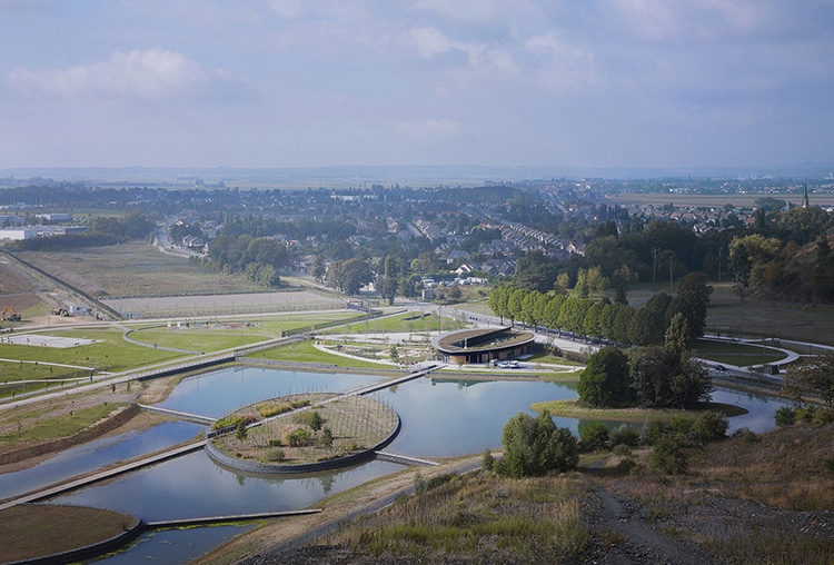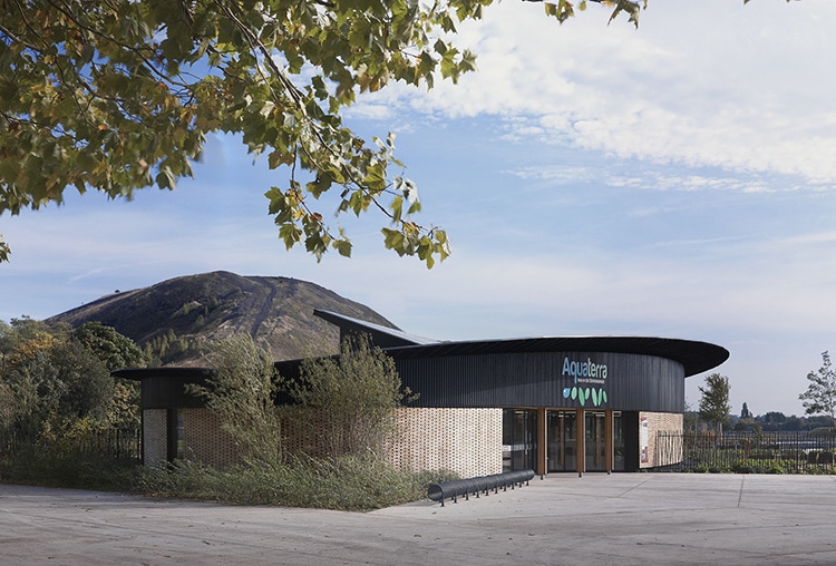 L’ensemble des aménagements a été rapidement démoli pour ne garder qu’une grande plateforme et des terrils. Le sol, marqué et pollué, et les terrils, montagnes et collines formées de masses inertes mais emblématiques dans ce plat pays, constituent les seuls reliefs visibles au lointain. Aujourd’hui, architectes et paysagistes ont un devoir de mémoire et de restitution, sans accroches physiques avec les anciennes activités. Pour échapper à la muséification, ce territoire doit retrouver une nouvelle vocation. C’est l’écologie qui est convoquée pour réconcilier les habitants avec un lieu tombé en désamour. Bâtiment outil, Aquaterra a la vocation de sensibiliser ses visiteurs aux questions environnementales.