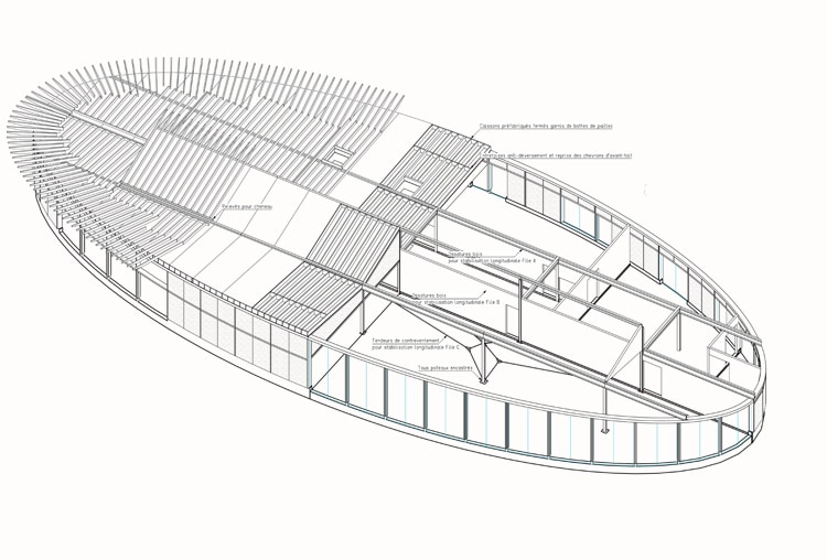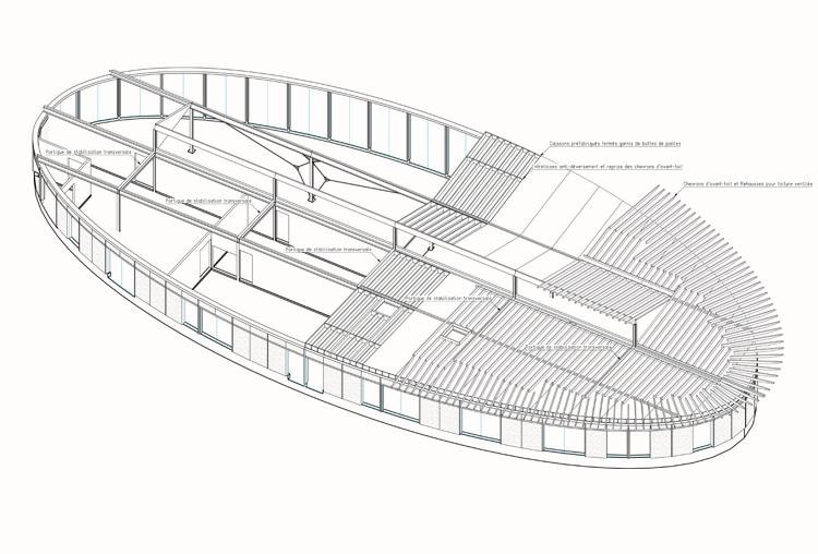 Du point de vue constructif, le bâtiment est conçu entièrement en filière sèche, collaborative mixte bois-métal, et s’inspire d’éléments existants sur le site : les grands portiques déployés sur de longues lignes qui formaient la structure du paysage industriel. Inspiré par cette disposition, le projet est bâti à partir de trois lignes de portiques métalliques constitués de profils industriels standards. La structure secondaire est formée par des caissons bois, garnis et isolés en bottes de paille, pour les façades et la toiture. La volonté d’utiliser des matériaux bio-sourcés a conduit logiquement à privilégier le bois (pour la structure, les finitions intérieures et les habillages de façades), associé à un isolant d’origine végétale, produit en circuit court. La forme ovale est construite sans éléments courbes, trop coûteux, mais avec une succession de petits éléments plats réglés sur des trames de faibles dimensions. L’habillage des façades est réalisé avec un matériau inédit qui renvoie à la mémoire collective : la brique de bois. Les briques sont fixées sur une armature de tiges métalliques. Le bois est un douglas rétifié et stabilisé.
