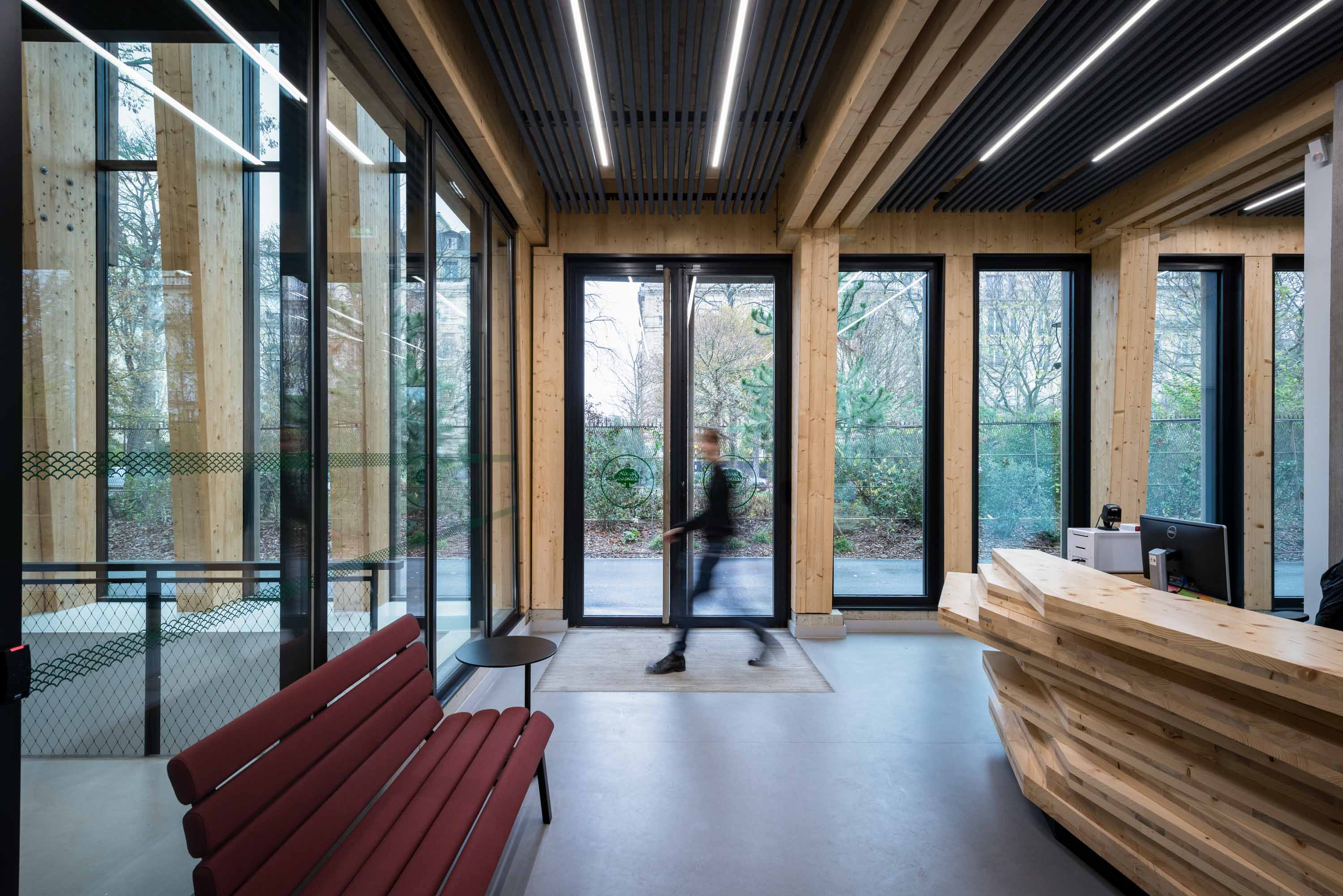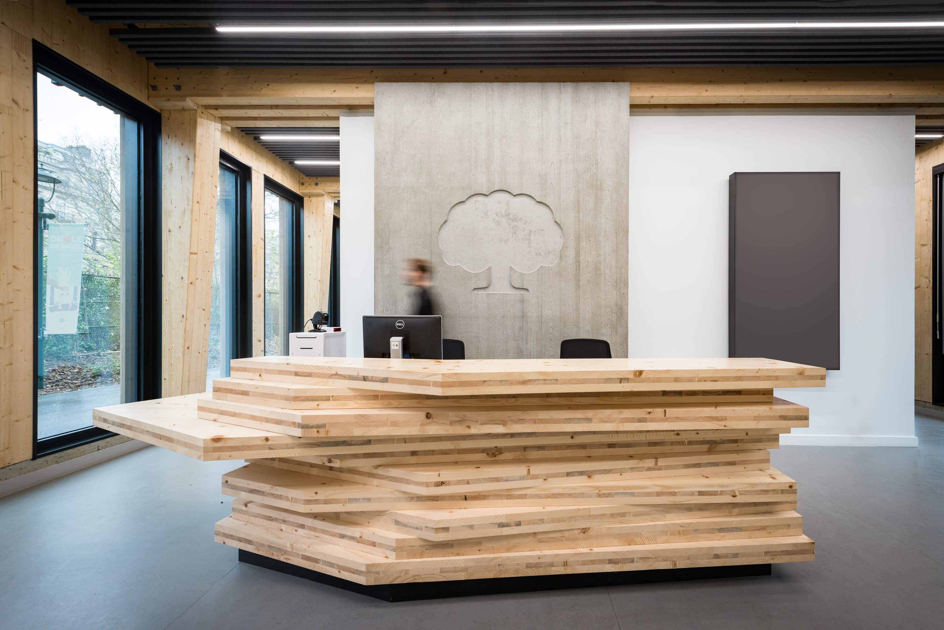 L’utilisation du bois est poursuivie dans les espaces intérieurs, les panneaux muraux sont ainsi en CLT. On notera le réemploi de matériau avec un banque d’accueil fabriquée à partir des chutes de bois de la charpente.