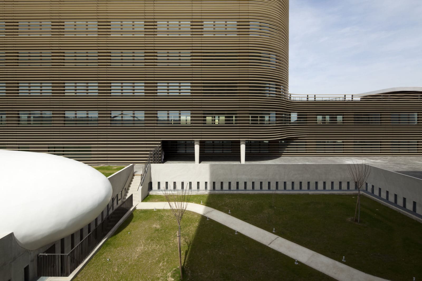Les pare-soleil s’interrompent afin d’offrir des accès en cas d’incendie. Le voile qui commence à la verticale avec la notation « Le Galilée » où il constitue un voile porteur se vrille à la manière d’une hélice d’avion pour finalement se poser trente mètres plus loin sur le second bâtiment de manière horizontale. Il repose sur des plots afin d’autoriser la dilatation du voile. La construction a nécessité un outil spécial pour le coulage, illustré par la vidéo ci-dessous. On notera que le voile est précontraint.