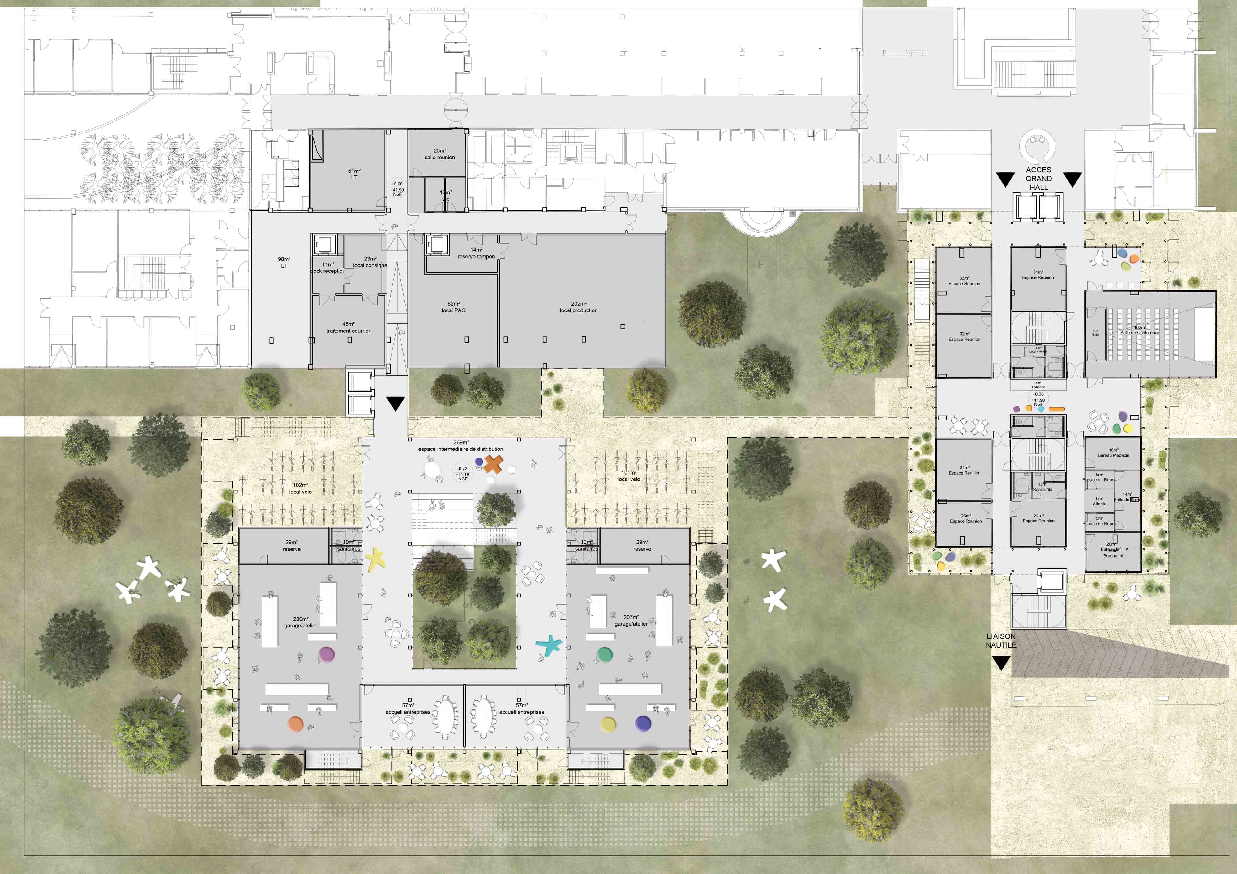 Si au début des années 2000, les écoles se sont dotées de fablab, d’espace de coworking, elles intègrent désormais des espaces pour le bien-être de leurs étudiants. Ainsi, le campus de l’ESSEC va abriter un « Sports and Recreation Center » en lieu et place de l’actuel gymnase. Les espaces tertiaires sont quant à eux marqués par l’entrée du végétal au sein des bâtiments. Le projet prévoit notamment une requalification paysagère menée par la paysagiste Ana Marti-Baron.