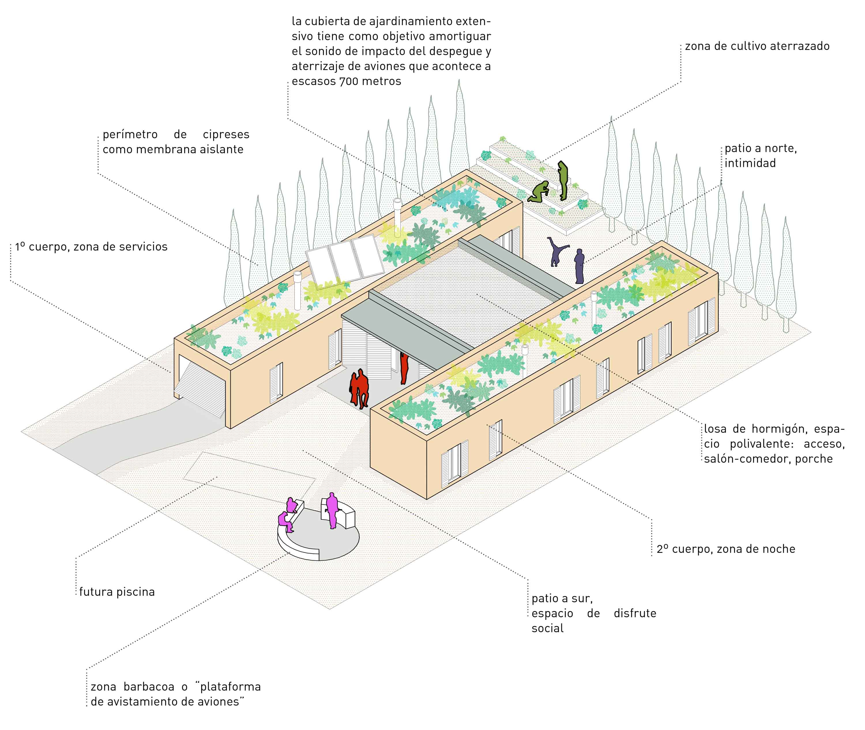 La maison s’installe à Majorque, dans les îles Baléares. Située à quelques pas de la plage, dans la ville de Can Pastilla. À cet instant, vous vous dites que la maison se situe dans un endroit paradisiaque, non ? Il y a toutefois un petit détail à préciser, le lotissement en question est bordé par les pistes de l’aéroport de Palma de Majorque avec ses 26 millions de passagers annuels, une fréquentation similaire à l’aéroport d’Orly. Bien entendu, cet équipement est accompagné d’une autoroute qui le distribue qui se situe au nord de la maison. Il y a donc un enjeu acoustique fort pour cette maison.