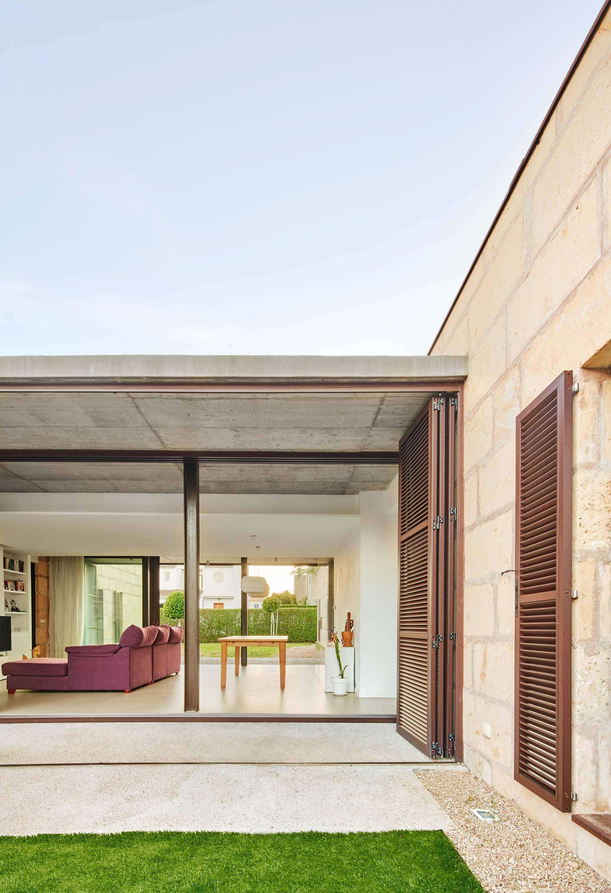 Toutefois, si l’organisation spatiale est intéressante, ce qui peut le premier nous interpeller est le traitement de ses façades. Oublier les fameux enduits, les architectes ont porté leur choix sur de la pierre, plus précisément de la pierre de Marès que l’on trouve dans les îles des Baléares. Les architectes de Miel Arquitectos expliquent avoir cherché « à ce que l’utilisation austère des matériaux génère une richesse formelle ». Ces derniers ont également veillé à n’utiliser que des matériaux locaux. Ainsi cette pierre est à la fois utilisée à l’extérieur mais aussi à l’intérieur, la pierre est de 8 cm d’épaisseur en façade et de 14 cm à l’intérieur, la rendant porteuse.