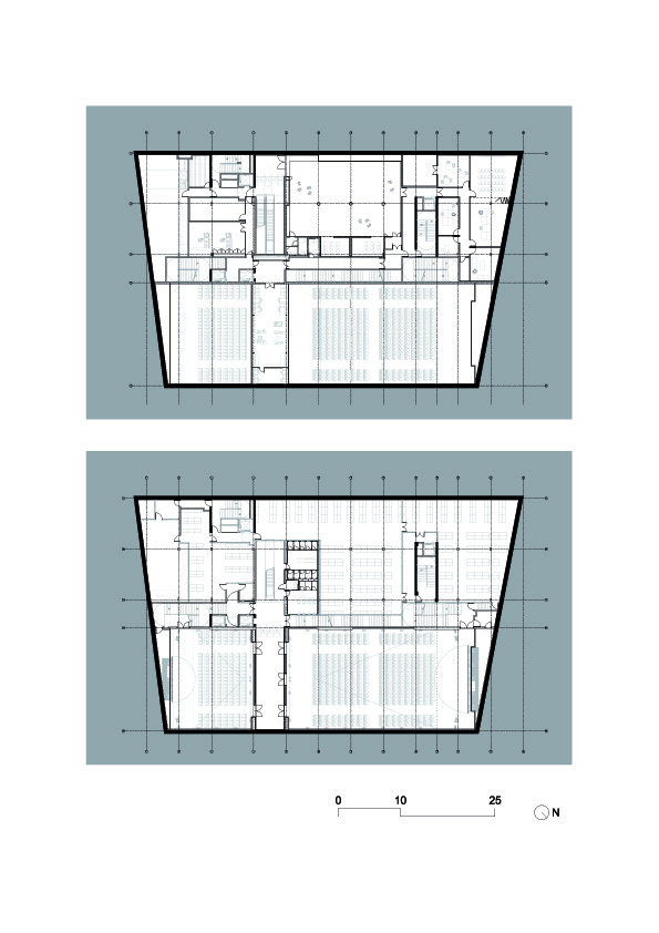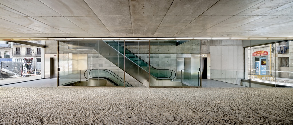 Les deux salles de cinéma se situent au sous-sol et plus précisément sous la place. Il ne faudra donc pas être surpris d’emprunter les escaliers roulants dans le sens descendant pour voir un film. Compte-tenu du programme et de la volonté de ne pas créer un bloc imposant dans le paysage urbain, ce sont donc les salles obscures qui ont été naturellement positionnées en sous-sol. Celui-ci se développe sur trois niveaux, il renferme les archives du centre.