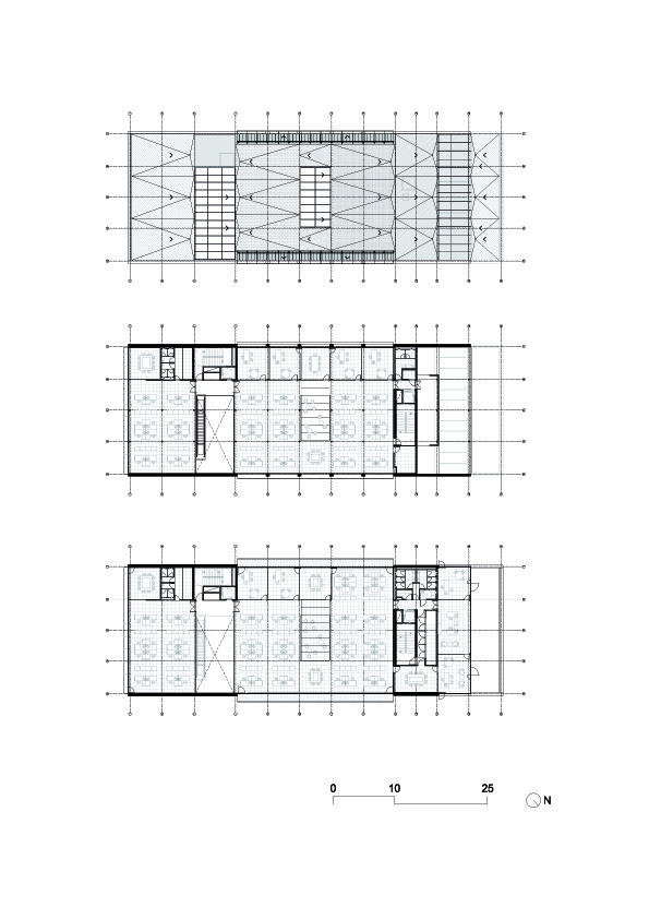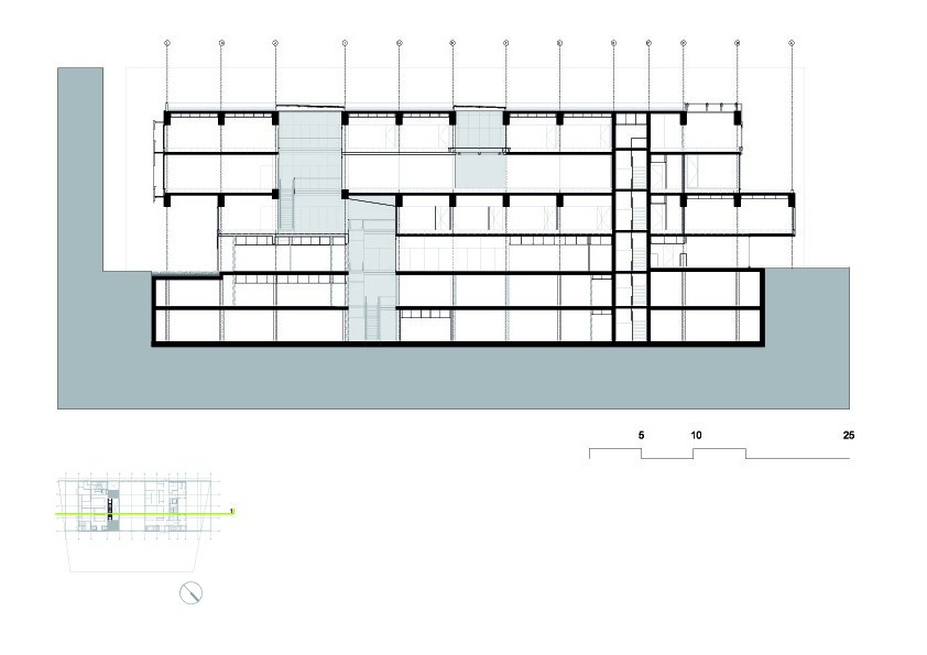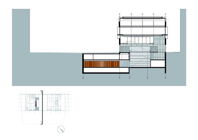 Un puits central permet la distribution verticale des espaces accessibles par le public. L’escalier roulant enveloppé de feuilles d’inox est en adéquation avec l’aspect brut des niveaux auxquels ils traversent.