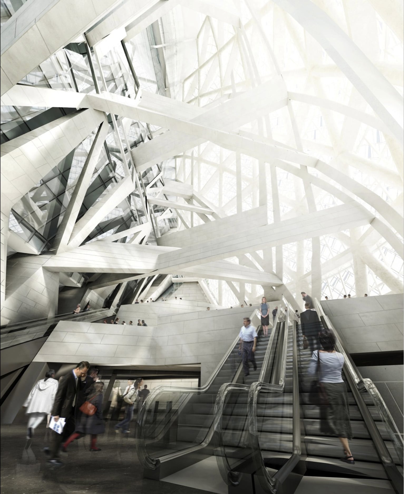 Il ne faudra que deux minutes pour accéder au 70ième niveau de la tour. Cette performance a été possible grâce au recours des ascenseurs double-pont, c’est-à-dire que chaque ascenseur est superposé à un autre afin de desservir deux niveaux en même temps. Rappelons que ce système a été inventé par Ottis lors de la construction de la tour Petronas. Des escaliers dits de convivialité ont pour objectif de réduire le nombre de voyage en ascenseur.Thom Mayne a soigné l’esthétique de son oeuvre. Élancée, souple, féminine, libre, autant de mot pour qualifier ce travail. La silhouette de la tour change à chaque point de vue. Sur certains elle peut s’avérer imposante par rapport à ses voisines. La tour sera terminée par un lobby de quelques 75 mètres permettant de prendre des vues sur la ville de Paris. Au sommet, en clin d’oeil à la culture française, un restaurant. Les élancées des 9 000 écailles d’acier et de verre troubleront l’oeil de l’observateur qui ne saura déterminer la réelle fin de la tour.