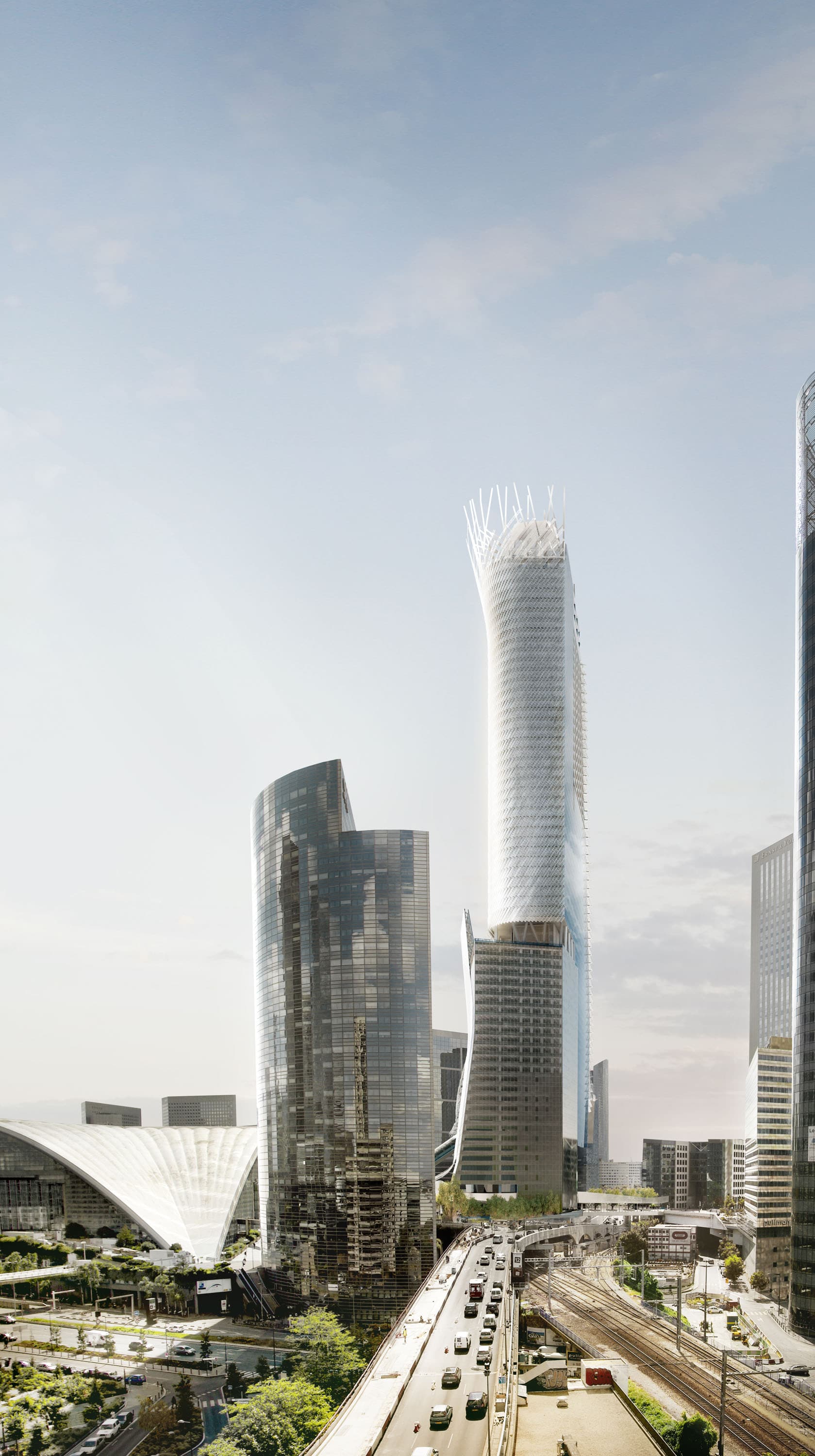 Cette tour mixte l’acier et le béton. Reposant sur un sol calcaire à 20 mètres en dessous du sol, comme ses voisines, une autre partie de ses fondations repose sur des piliers qui traversent les voies de la gare SNCF souterraine. La nouveauté technique de la tour est son fin noyau béton qui est combiné à un diagrid métallique, ce dernier agit comme une « canne » sur le noyau de béton. Cette technique permet de diminuer l’effet d’oscillation, elle a été retenue après 17 modèles de calculs. Au niveau du chantier, la réalisation des sous-sols s’opérera en même temps que l’élévation des étages. Pour le bien des habitants de Puteaux et de Courbevoies, Unibail-Rodamco construira une passerelle temporaire pour pallier la démolition de la passerelle Carpeaux.
