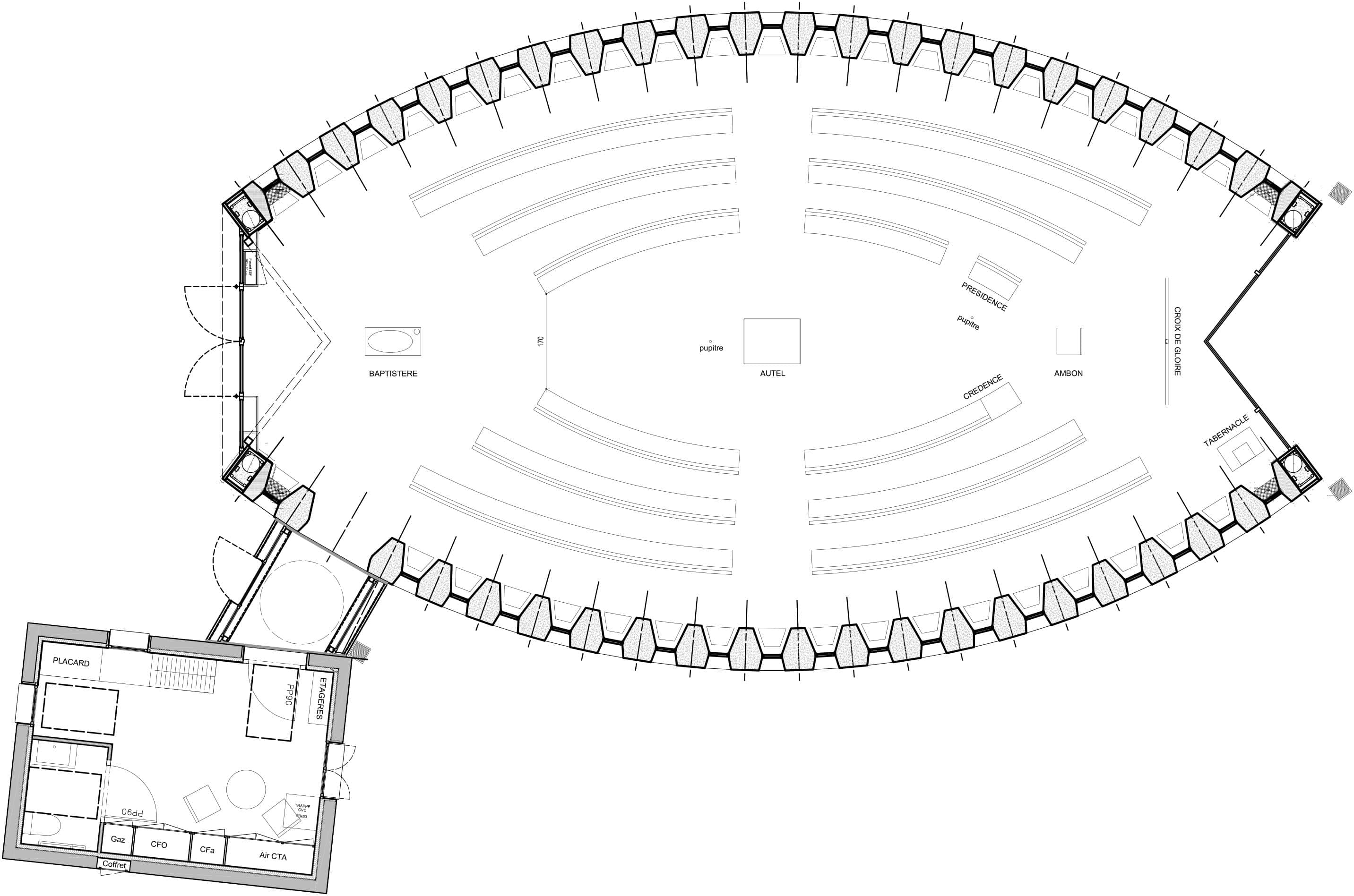 C’est donc de cette idée qu’est né la forme en mandorle (forme d’ovale) de la chapelle. Il s’agit de recevoir les fidèles dans un édifice qui crée un seul corps avec Dieu. Ainsi, l’édifice s’organise suivant l’axe longitudinal de la nef. L’autel, table de l’Eucharistie se positionne au centre de l’édifice, tandis que le baptistère vient s’enraciné à l’entrée de la chapelle, l’ambon (où le curé prêche) s’installe à l’opposé, devant l’échancrure vitrée qui met en lumière la croix de Gloire symbolisant la résurrection de Jésus Chris. La sacristie est ensuite reliée par un court couloir afin de respecter l’échelle du projet.