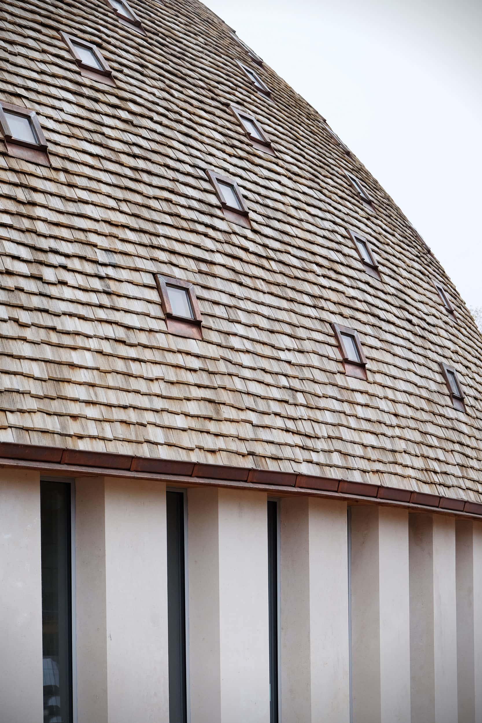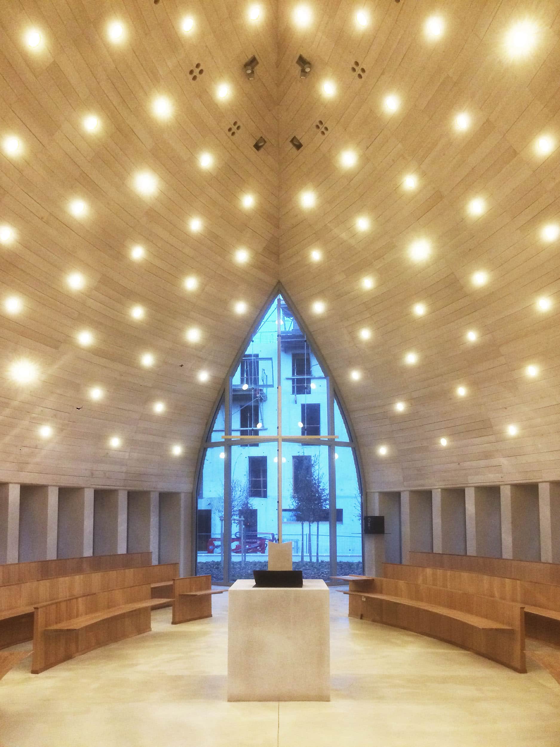 La couverture est animée de 164 fenêtres de toits, derrière ces petits vitrages carrés, se cache des tubes de lumière qui viennent scintiller à l’intérieur de la chapelle. Des leds ont été intégrées à ces tubes afin de conserver ce scintillement la nuit.