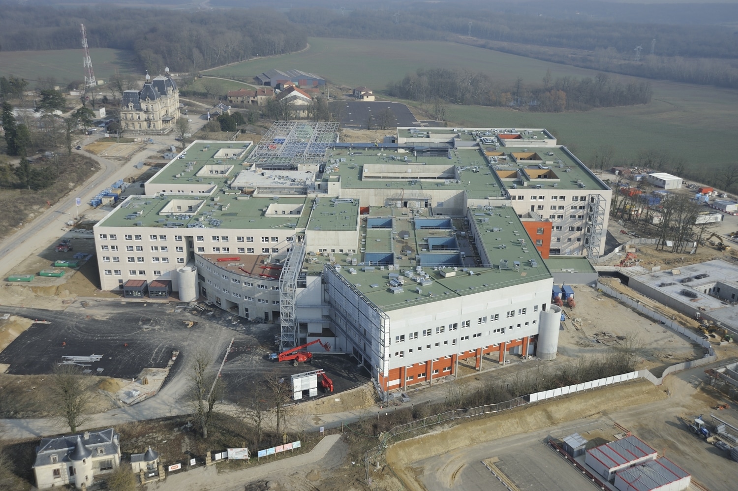 Le projet se situe sur le domaine du château de Mercy, au sud de la ville de Metz, dans un terrain en pente. L’hôpital est organisé en plot, au centre se concentre le plateau technique, puis chaque pôle médical vient se greffer autour de ce dernier. L’hôpital en compte cinq : Chirurgie, neurologie, néphrologie, oncologie, et autres spécialités. Chaque plot est divisé en deux avec des services communs. Les salles de consultations se localisent au rez-de-chaussée tandis que les 640 lits sont hébergés aux niveaux supérieurs.