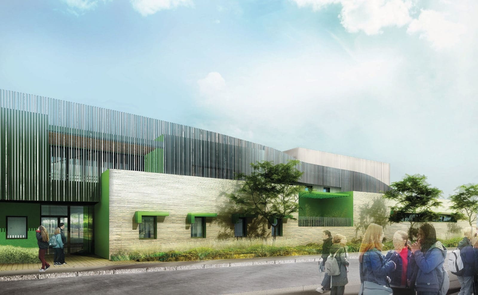 Les architectes introduisent leurs réflexions par une citation de Saint-Exupéry : « Le véritable enseignement n’est point de te parler, mais de te construire ». L’accès s’effectue par la rue du progrès, le bâtiment administratif est en retrait afin de mettre en avant l’entrée depuis le rond-point.