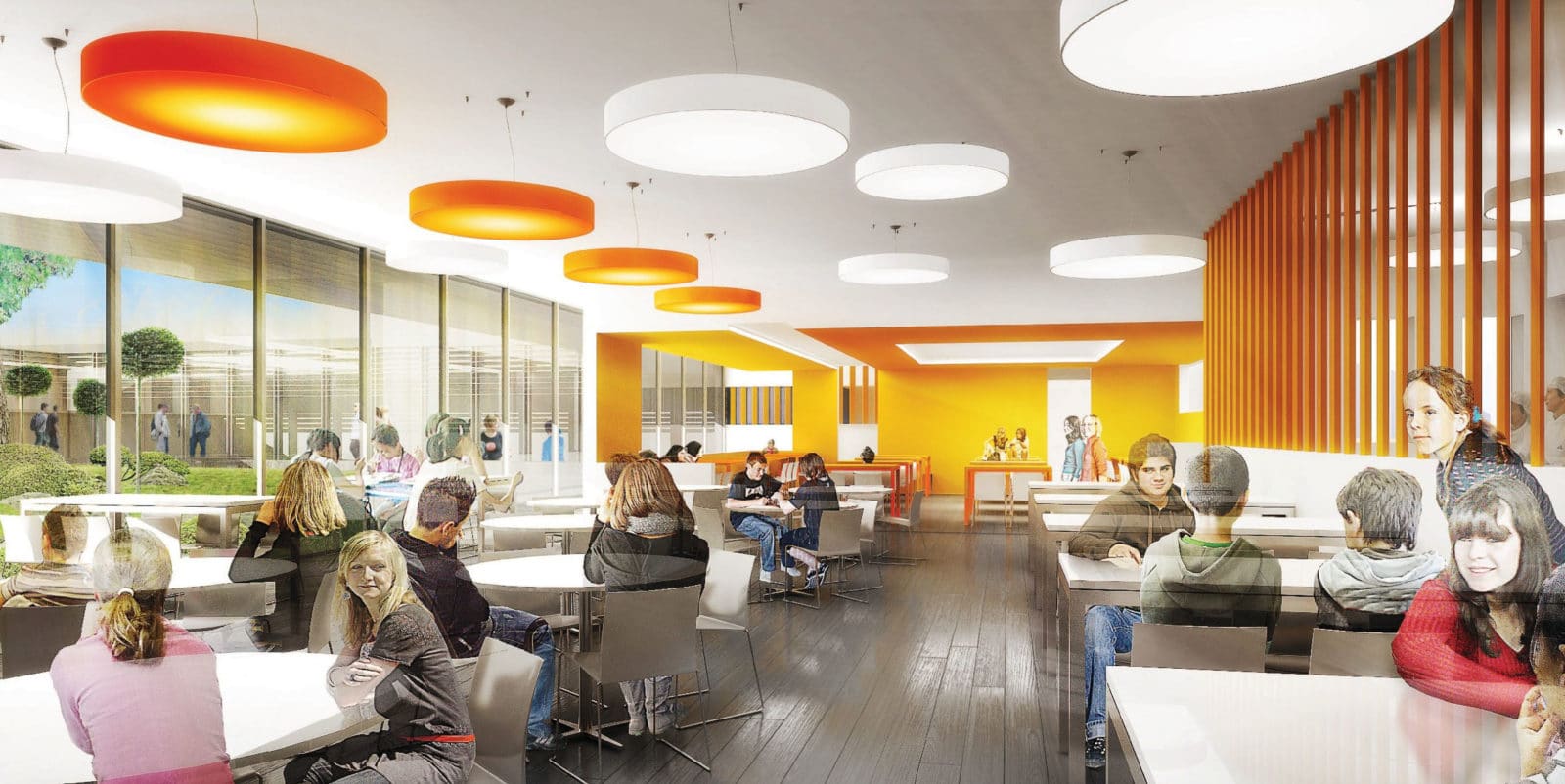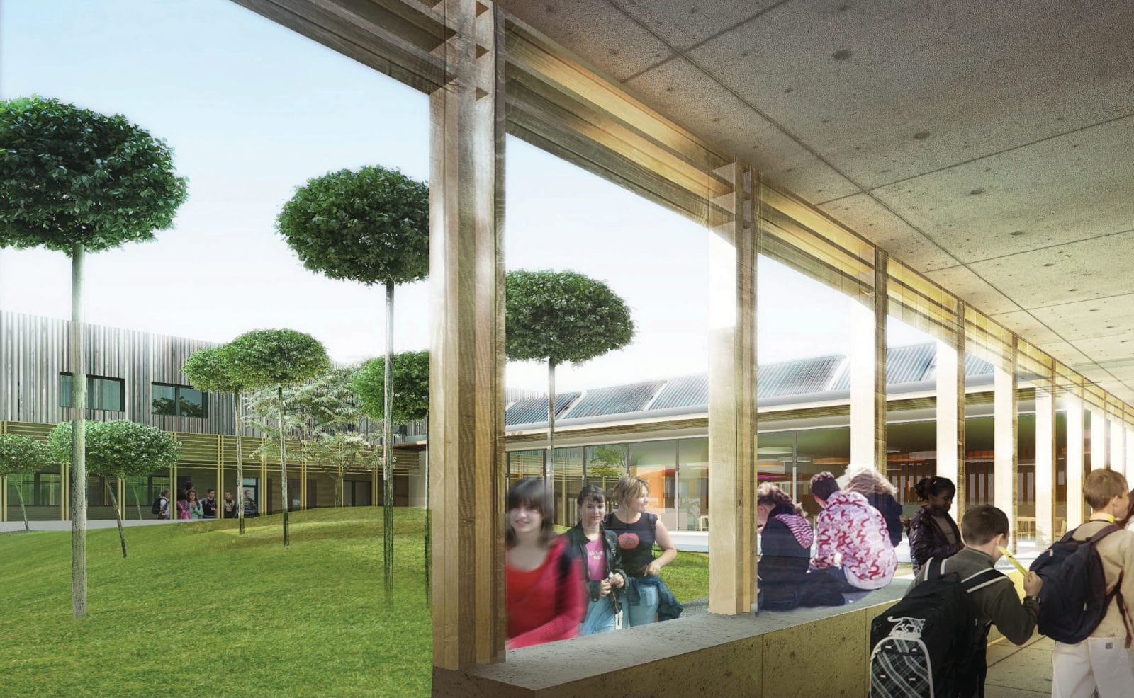 Du point de vue thermique, le projet affiche une perméabilité à l’air de l’enveloppe inférieur à 0,5 m3/h/m² de façade. La ventilation est assurée par un système double-flux. Un système Heliopac est installé en toiture de la demi-pension alimentant le circuit d’ECS. Au sujet de l‘acoustique des salles, elle est atténuée par des baffles acoustiques.