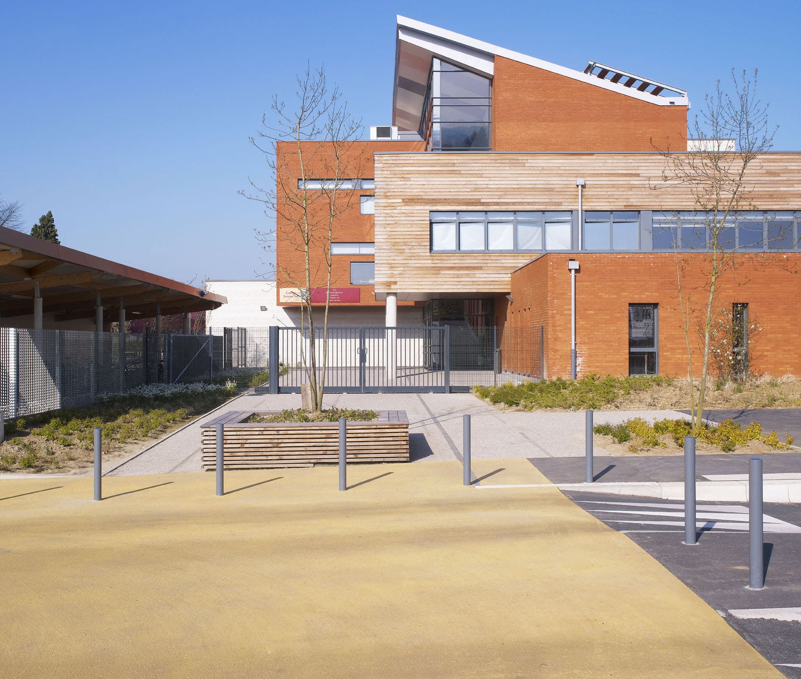 Les architectes ont recherchés à concevoir un collège lisible et rationnel. Le bâtiment s’ouvre sur l’extérieur sans nuire à la sécurité des élèves. Un jardin paysager s’installe entre les locaux de l’administration et le restaurant. La façade de l’externat ouverte sur la cour se caractérise par son habillage en carreau de terre cuite. Ces derniers sont maintenus par des rails métalliques à fleur de voile de couleur jaune et espacé de manière régulière afin de créer une trame. Ils servent également de garde-corps. Ce dispositif a tendance à réduire l’impact des ouvertures sur la façade. La présence des rails sur la façade partagera certainement les avis.