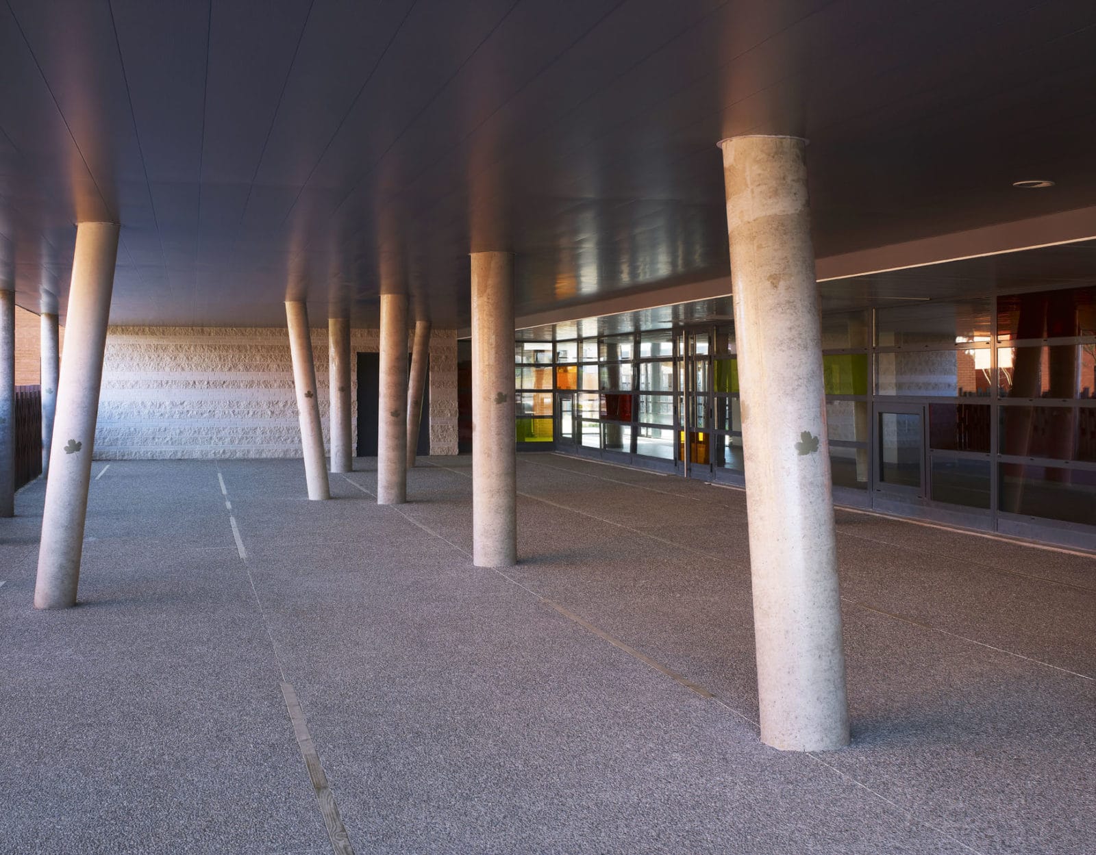 Quelques verres teintés viennent colorés le corridor du bâtiment d’enseignement. Des feuilles d’arbres sont incrustées dans les poteaux obliques, mémoires du passé ? On les retrouve également sur le sol, à une échelle plus importante. Le restaurant est agréablement sobre, à travers les hautes baies, c’est le cadre paysager qui anime l’espace. La coloration du verre et la position des montants marquent la frontière entre l’intérieur et l’extérieur.