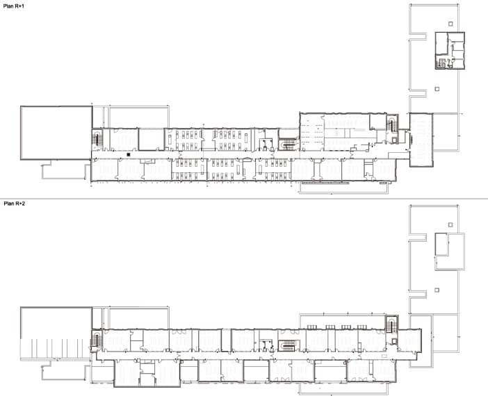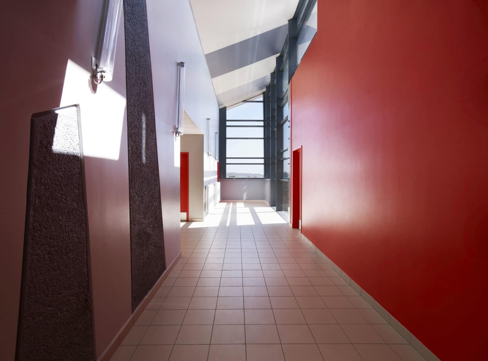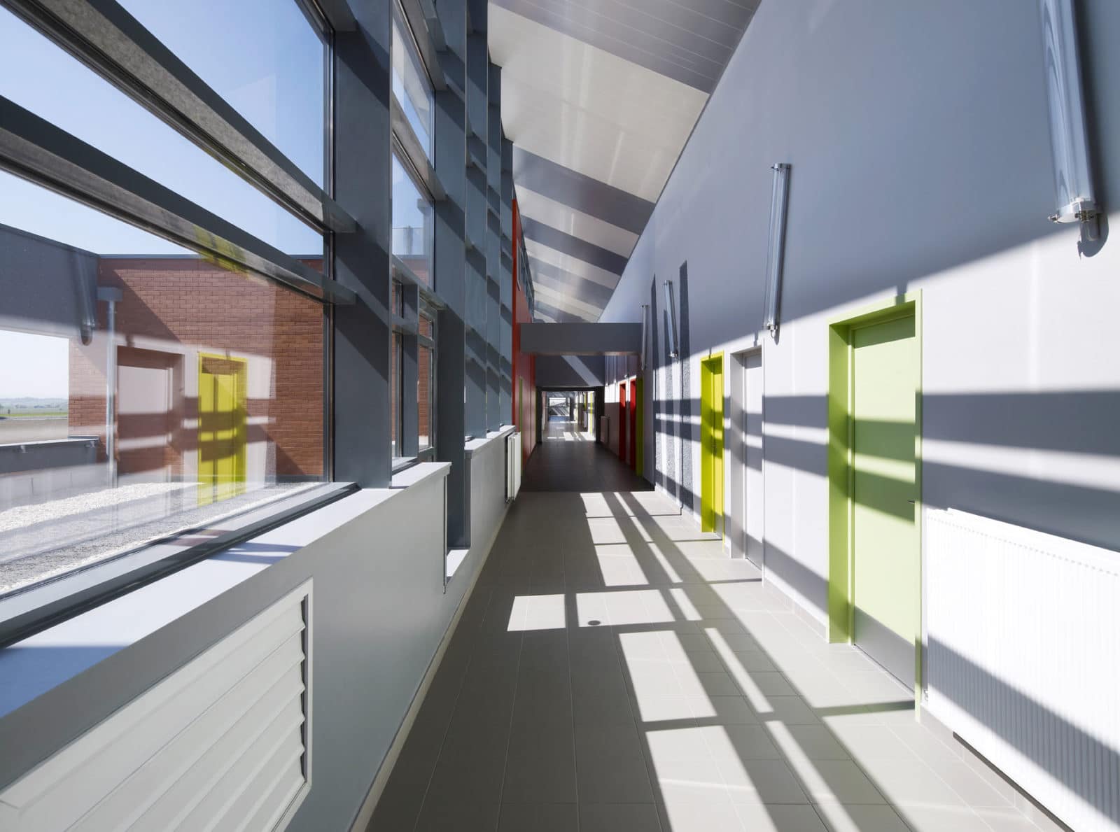 Les couloirs sont régulièrement percés par de grandes baies qui les inondent de lumière naturelle. La structure se dévoile partiellement sur les murs. L’éclairage peu commun s’effectue par des néons fixés au mur en biais.