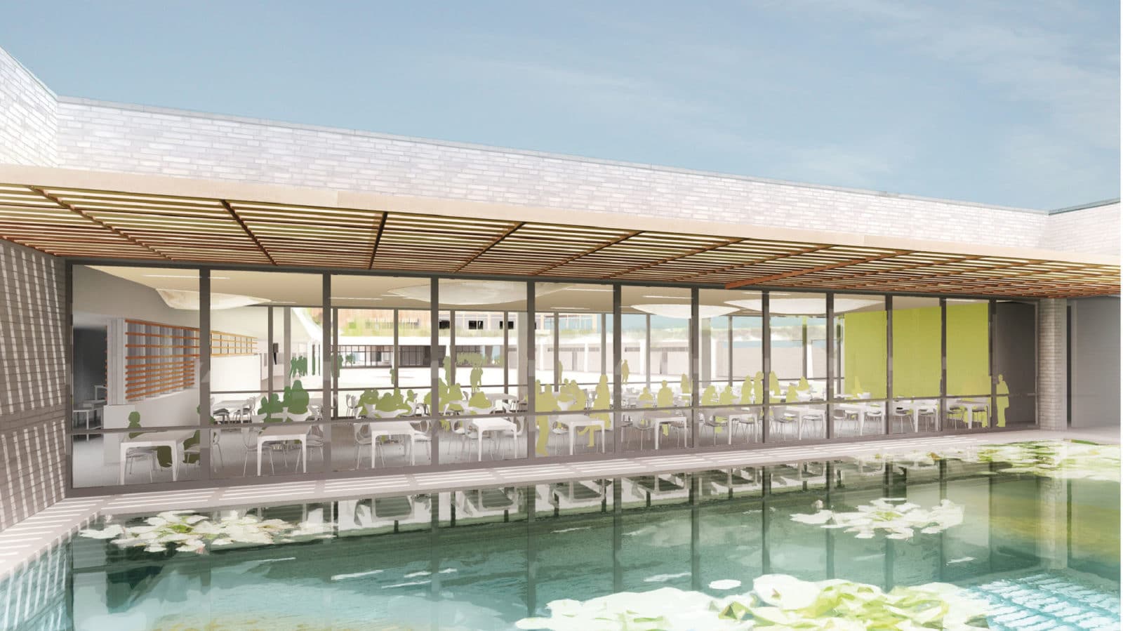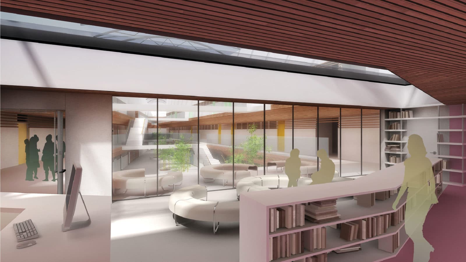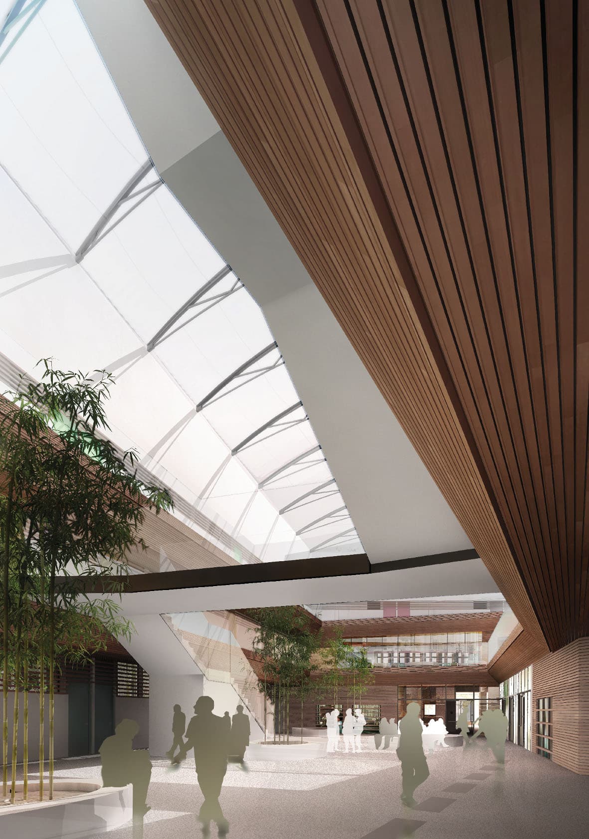 Les salles de classes s’articulent autour d’un atrium en long, sa forme découle du souhait de l’alignement du bâtiment vis-à-vis de ses voisins. L’atrium qui offre une cours supplémentaire couverte au programme a pour objectif de réguler la température et de limiter la surface des murs en contact direct avec l’extérieur. L’air vicié des salles de classes permet à cet atrium de garder une température convenable en hiver, l’air est ensuite rejetée en partie haute. En été, pour éviter que ce volume devienne une serre, les coussins de sa toiture se dégonflent superposant ainsi les damiers. Ces efforts ont conduit l’équipe à afficher une consommation de 34kWhEP/m²SHON/an.