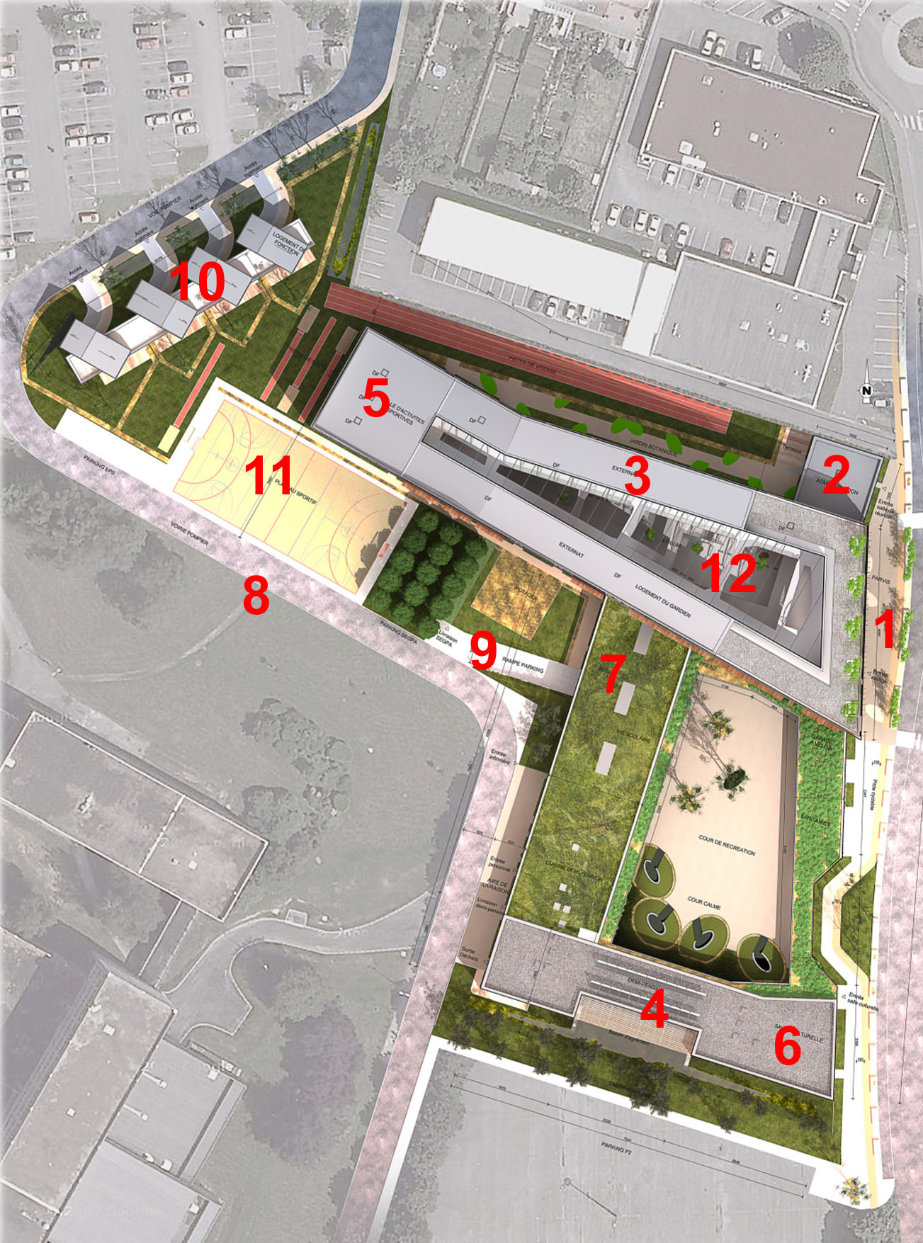 L’atrium est refermé au nord par une salle de sport avec mur d’escalade, un terrain vient s’accrocher à cette dernière au sud. 10 logements de fonction terminent le programme, ils se positionnent en retrait du collège, au nord de la parcelle.