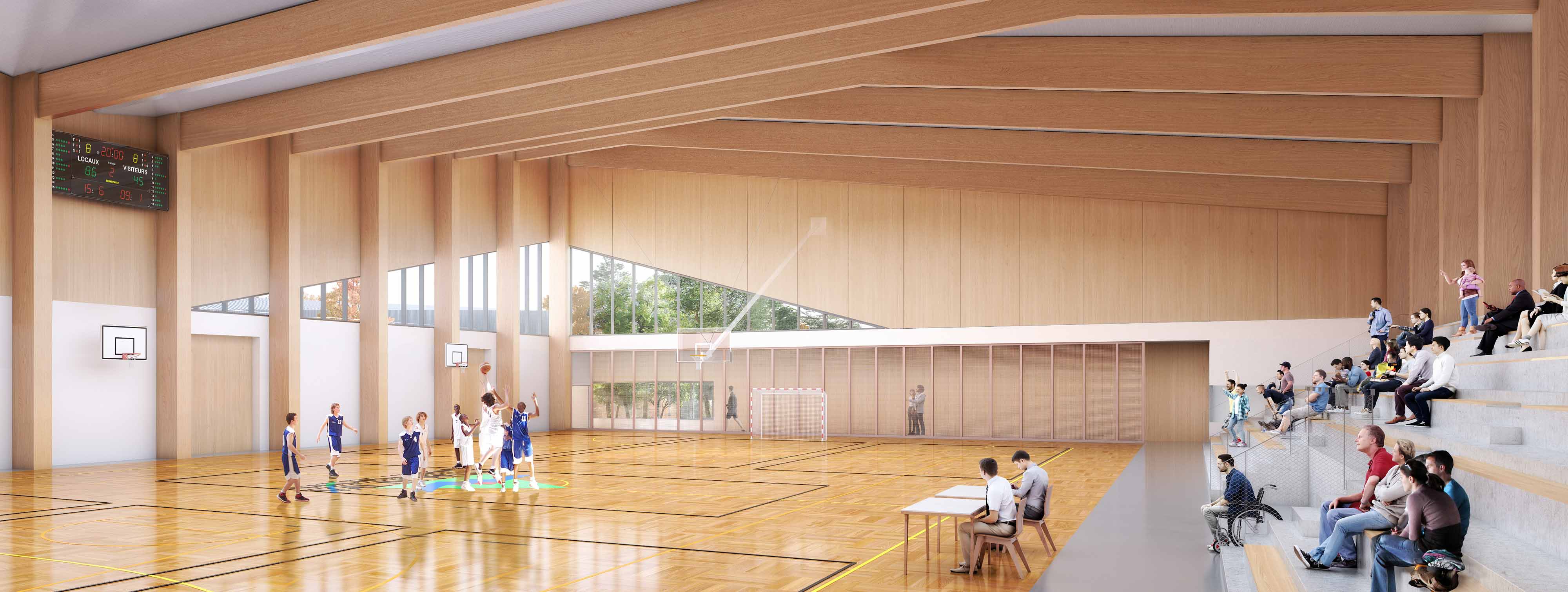 À l’intérieur, la salle omnisports sera revêtue d’un parquet, tandis que le dojo et la salle de combat sera recouverte de tatamis. Les traitements muraux sont quant eux à l‘inverse des façades, bois pour la partie haute et revêtement clair pour la partie basse.