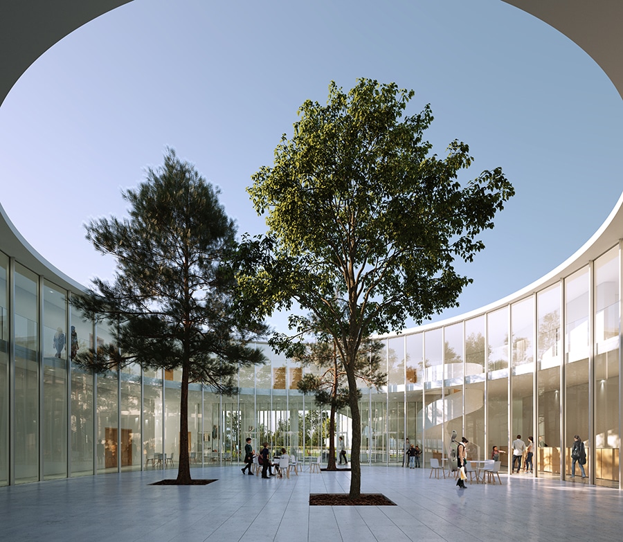 Si la façade en béton blanc d’aspect glacé laisse imaginer un bâtiment sombre. Le passant observateur y entreverra une transparence qui l’invitera à entrer. C’est la résultante du patio central qui permet de baigner les circulations de lumière naturelle. Deux beaux cèdres du Libans, des érables cépées et des merisiers viendront arborer cet espace. Il apportera également le complément du son, le silence.