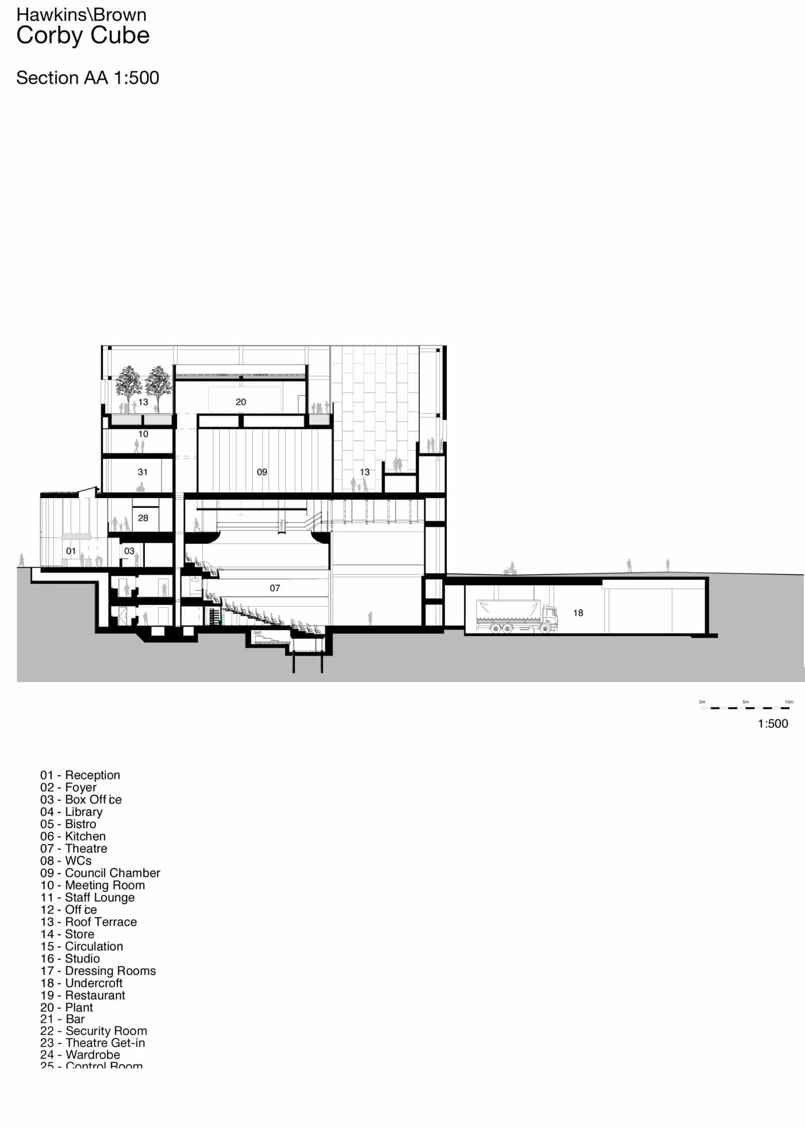 Livré en 2010 par HawkinsBrown, ce nouvel équipement culturel de la ville de Northants bénéficie d’une position centrale au sein du plan de développement de Corby, la nouvelle ville annexée à Northants dont le statut de nouvelle ville a été décrété dans les années 50. La nouvelle place accueillera également une gare ferroviaire ainsi qu’une piscine.