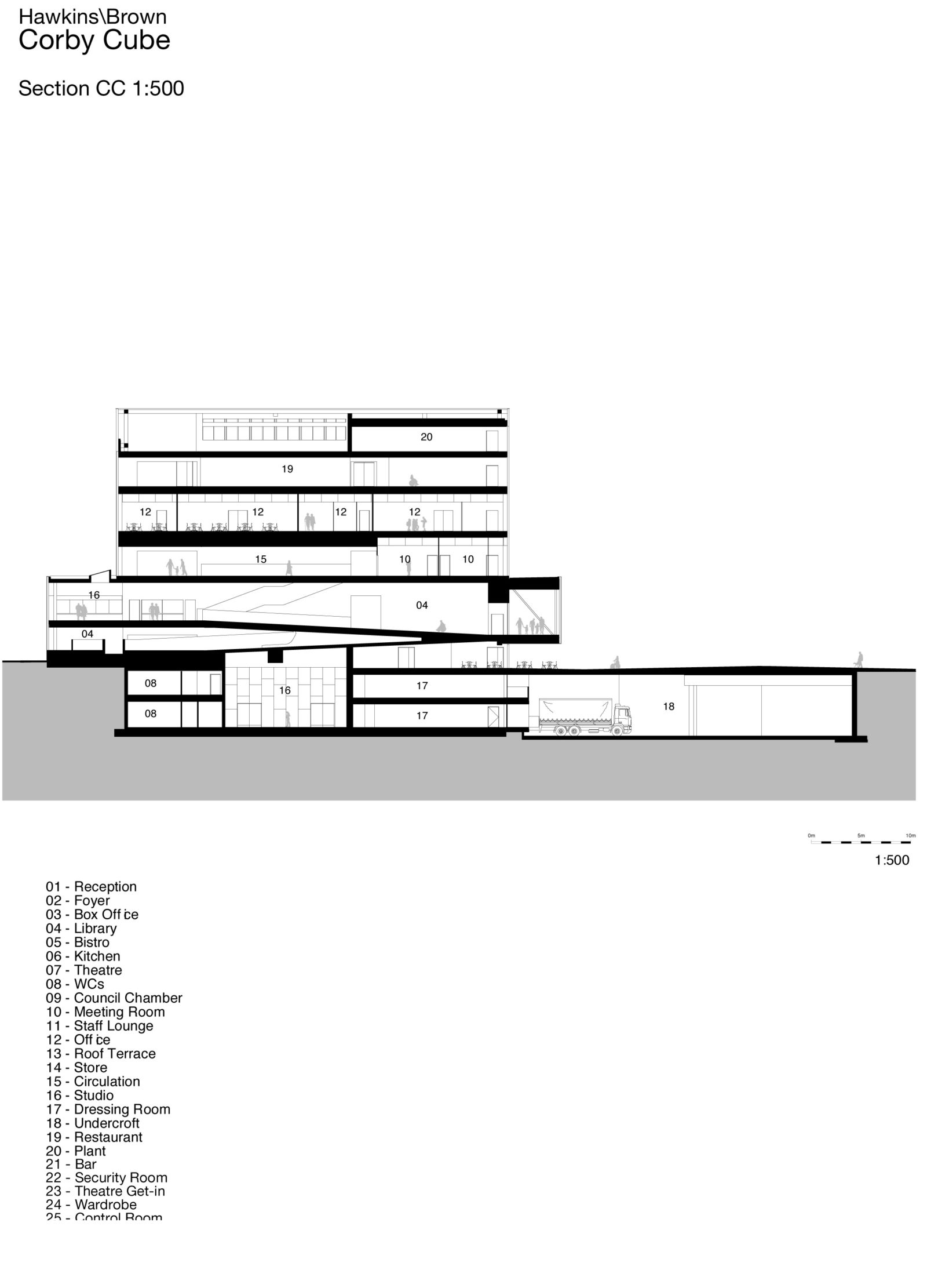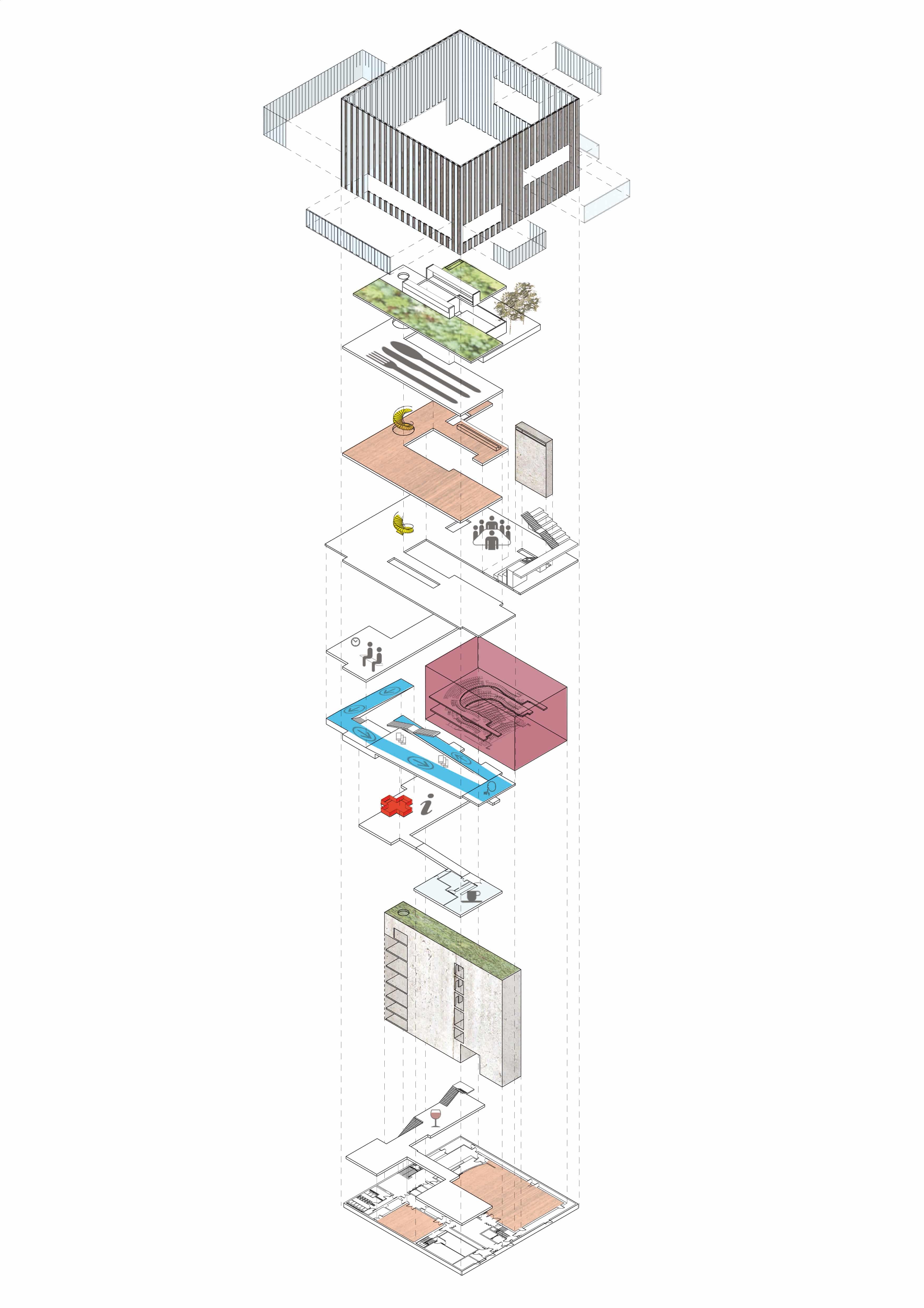 La distribution s’effectue par un noyau longitudinal, légèrement excentré qui est commun pour le public et les employés. L’organisation des programmes calque une horloge lorsque nous regardons la coupe BB : de la bibliothèque le matin, au spectacle du soir en passant par le restaurant du midi et de la réunion de fin d’après-midi.