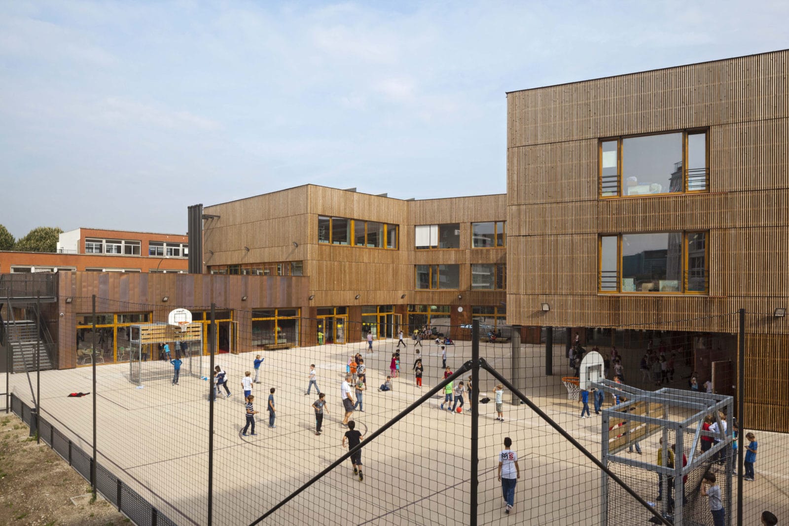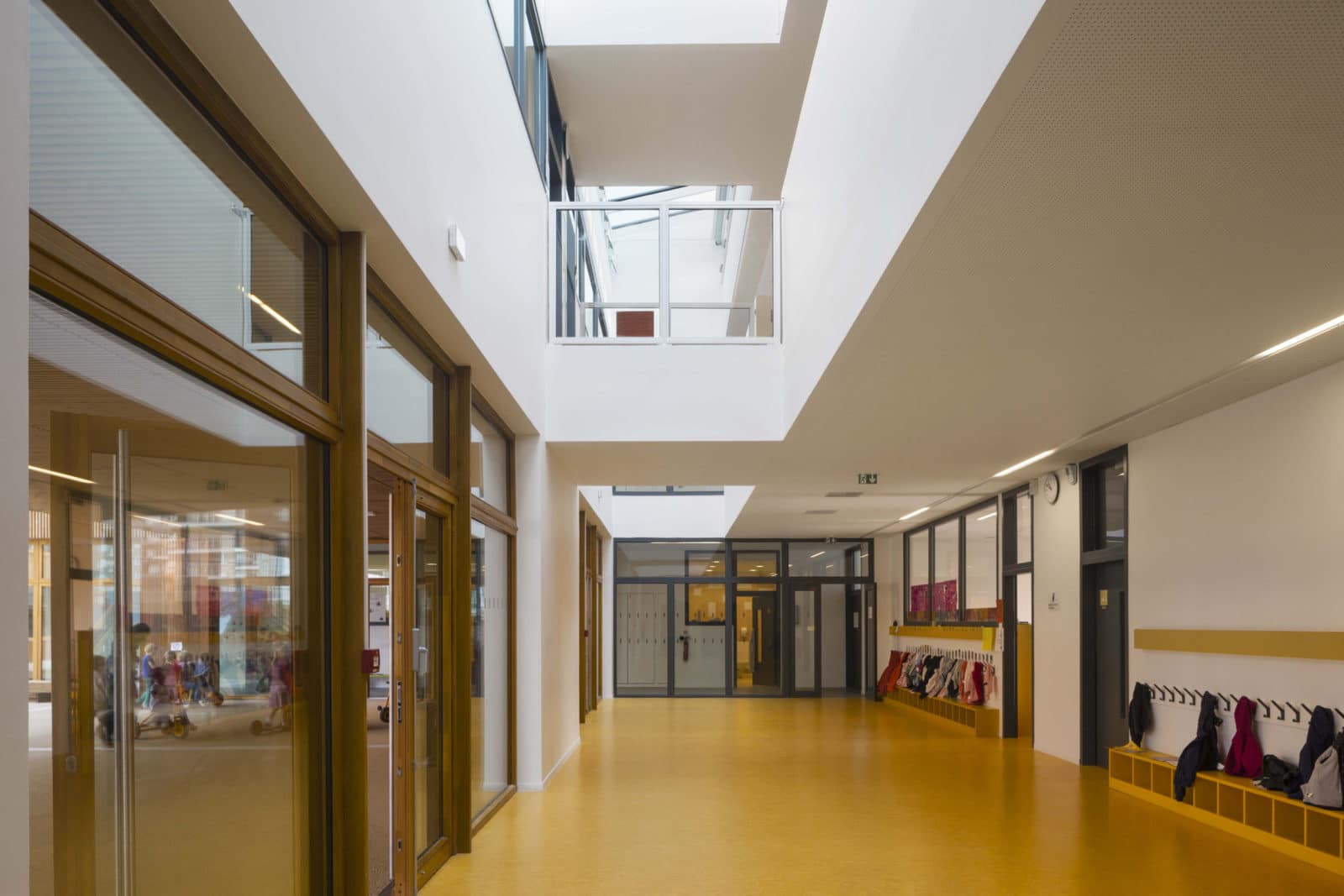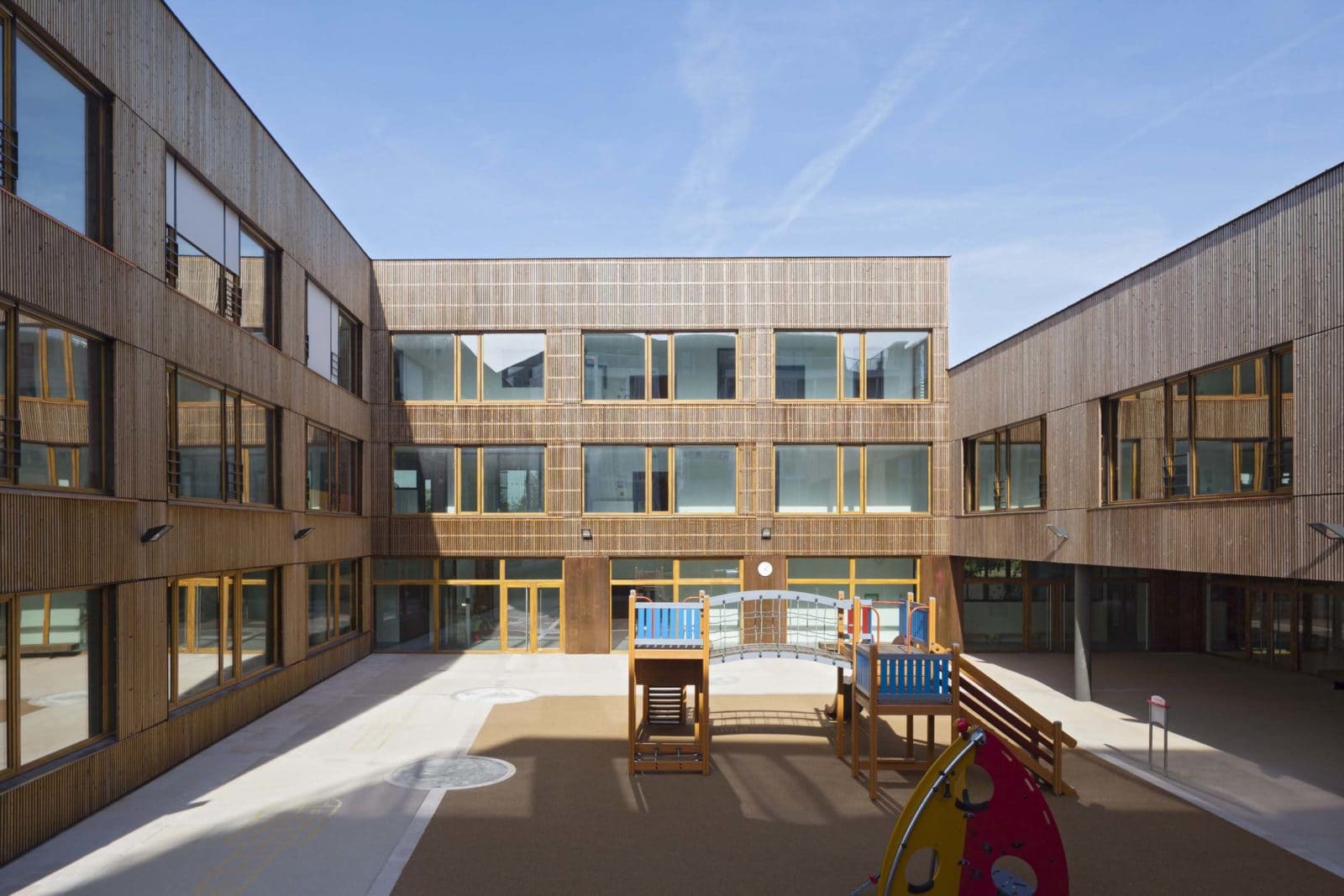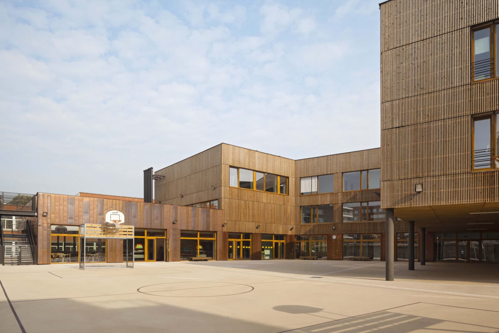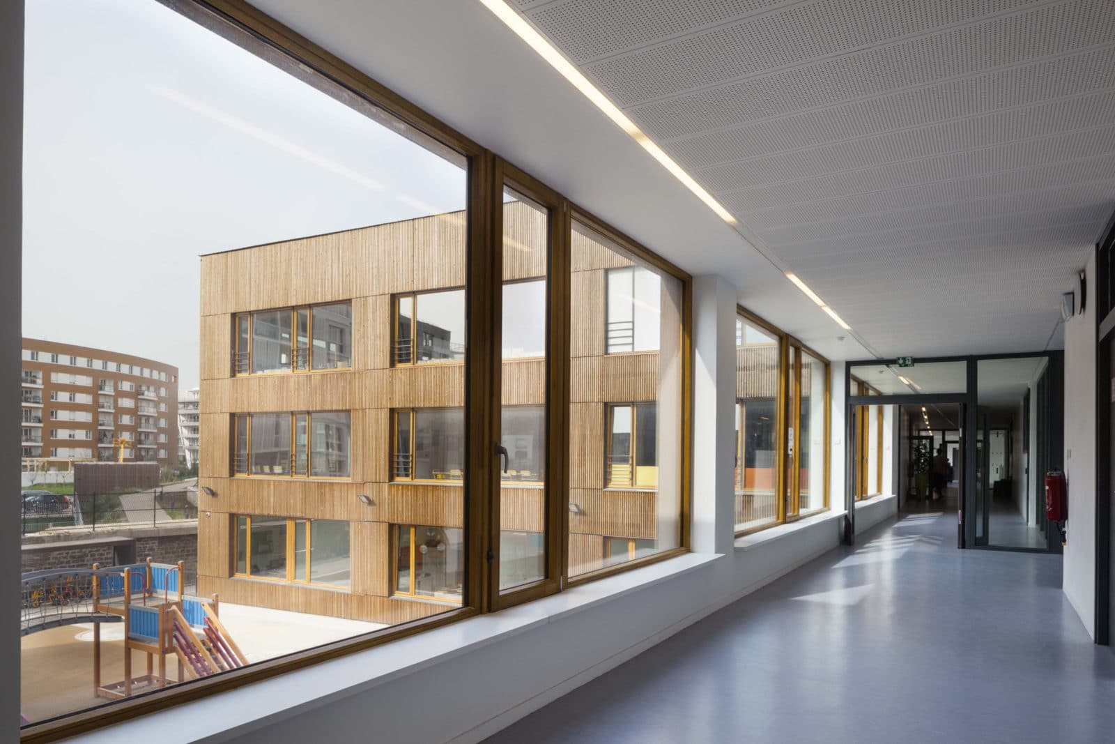 Les couloirs sont généreusement éclairés par la lumière naturelle grâce à de grandes surfaces vitrées ouvertes sur les deux cours de récréation. Depuis le premier étage, des parois intérieures vitrées ouvrent des vues sur les deux halls d’entrée et sur la salle d’évolution de l’école maternelle. Les deux bâtiments – école maternelle et élémentaire – se déploient autour d’un atrium central, source de lumière naturelle pour les espaces de circulations et de second jour pour les salles de classe dont l’éclairage naturel équilibré, offre aux élèves les conditions d’apprentissage les plus favorables. En effet, selon des études réalisées en Californie auprès de 21 000 élèves, la quantité et la qualité de la lumière naturelle ont une réelle influence sur la capacité d’apprentissage des élèves. Le troisième bâtiment, le long de la rue du Fort, abrite au rez-de-chaussée la cuisine et les cantines des écoles maternelle et élémentaire et au premier étage le gymnase. Largement éclairé – tant par les fenêtres sud, est ouest, que par les sheds orientés au nord pour éviter l’éblouissement – le gymnase est relié à la cours de récréation de l’école élémentaire par une terrasse à laquelle conduit un escalier extérieur.