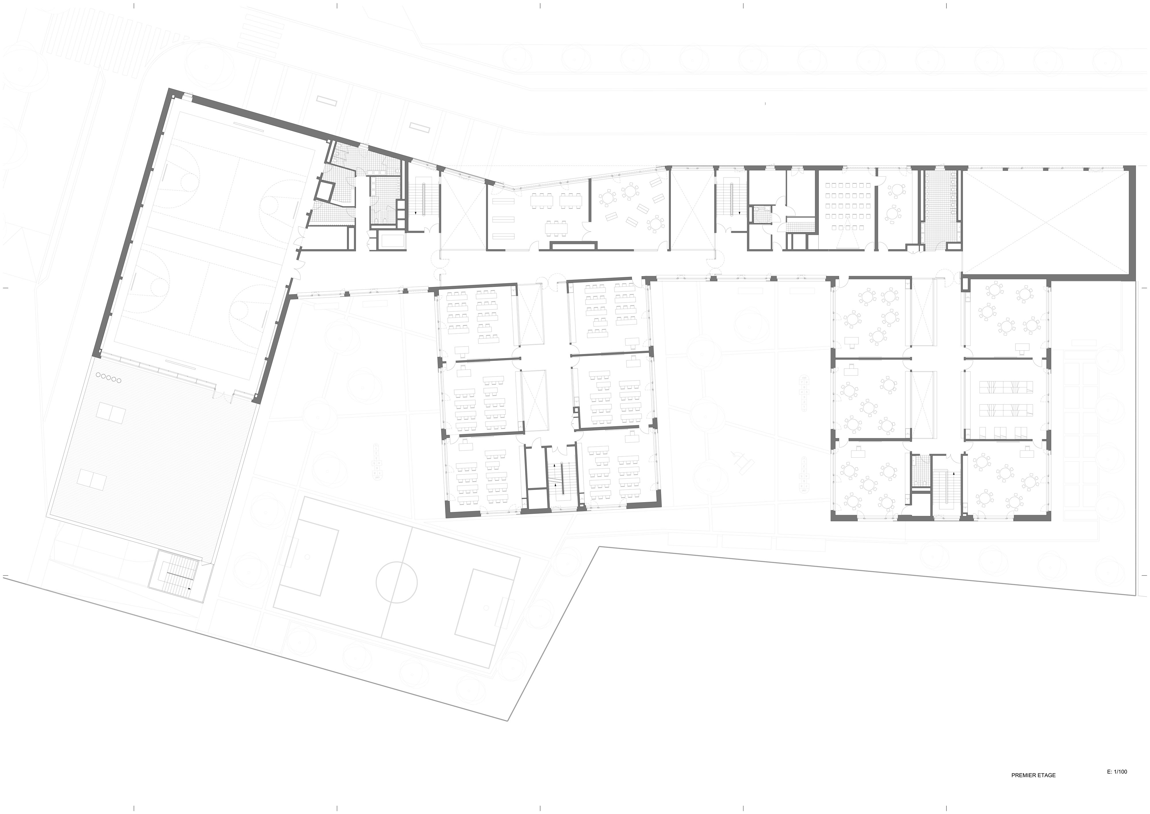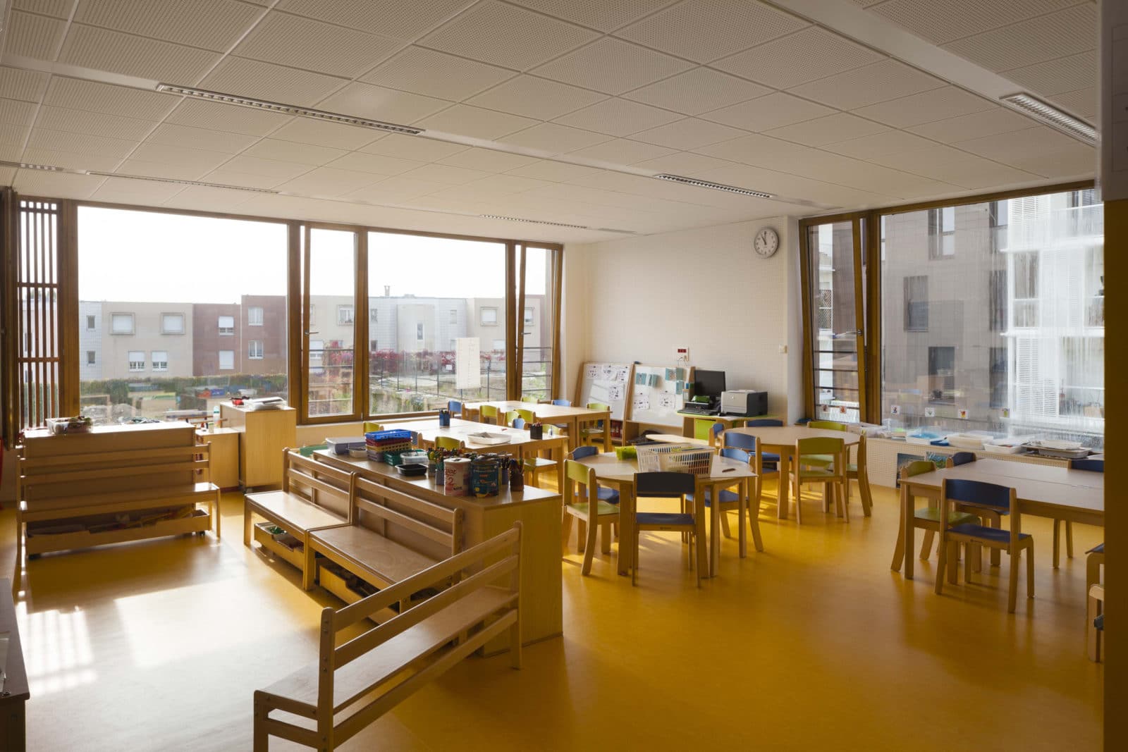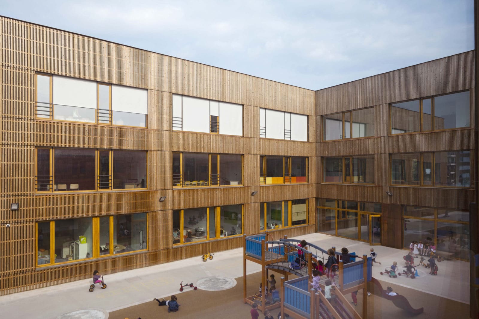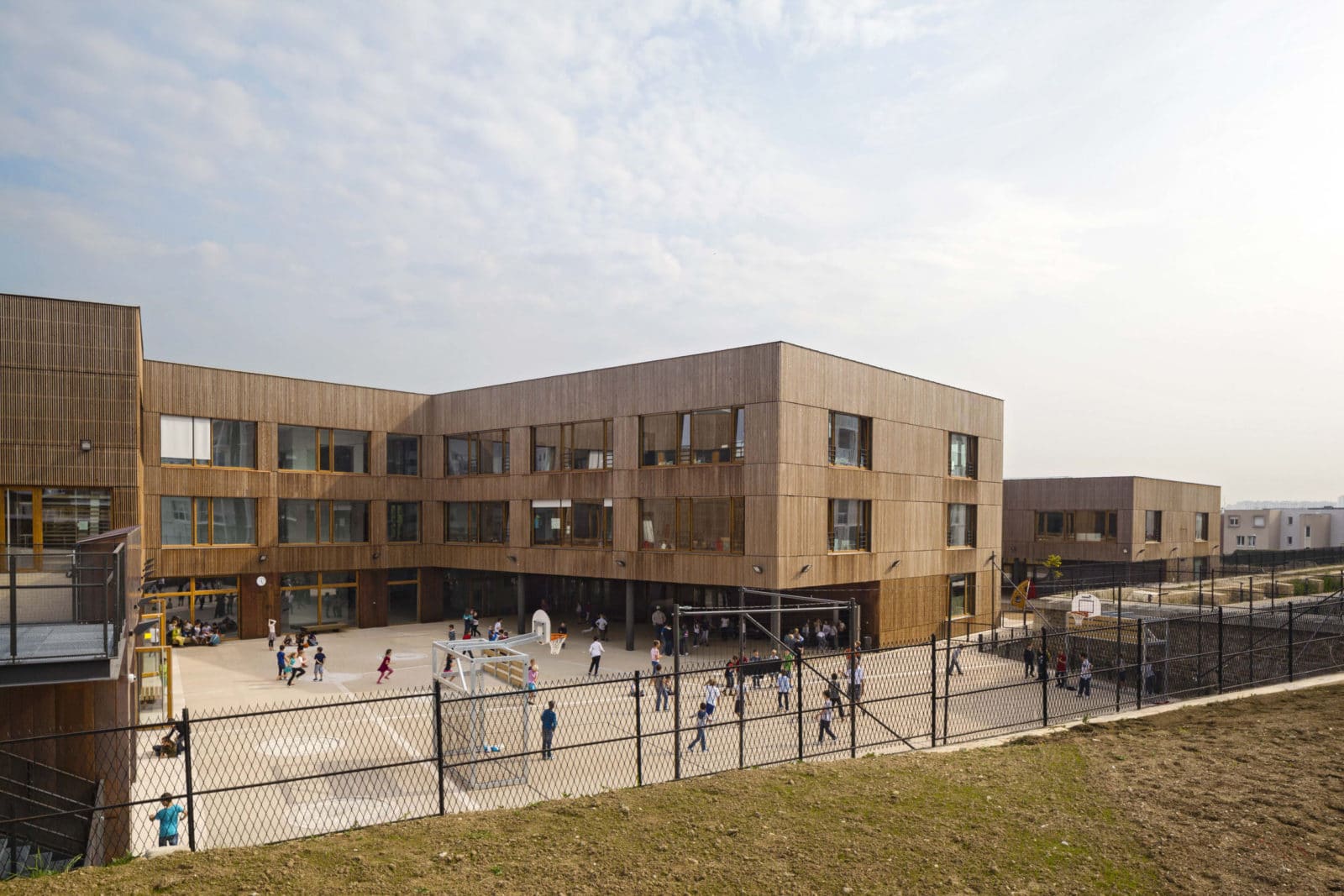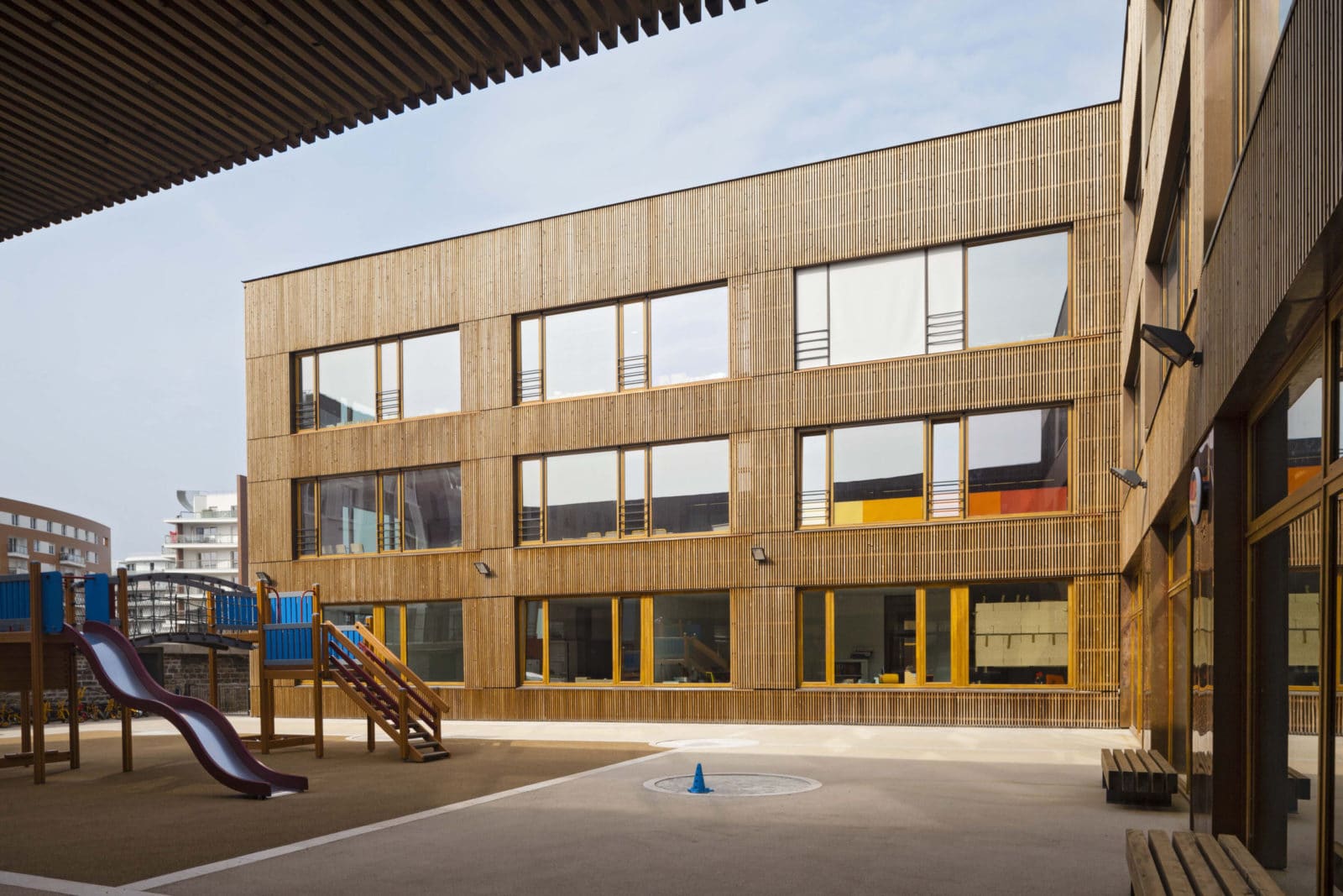 Les couloirs sont généreusement éclairés par la lumière naturelle grâce à de grandes surfaces vitrées ouvertes sur les deux cours de récréation. Depuis le premier étage, des parois intérieures vitrées ouvrent des vues sur les deux halls d’entrée et sur la salle d’évolution de l’école maternelle. Les deux bâtiments – école maternelle et élémentaire – se déploient autour d’un atrium central, source de lumière naturelle pour les espaces de circulations et de second jour pour les salles de classe dont l’éclairage naturel équilibré, offre aux élèves les conditions d’apprentissage les plus favorables. En effet, selon des études réalisées en Californie auprès de 21 000 élèves, la quantité et la qualité de la lumière naturelle ont une réelle influence sur la capacité d’apprentissage des élèves. Le troisième bâtiment, le long de la rue du Fort, abrite au rez-de-chaussée la cuisine et les cantines des écoles maternelle et élémentaire et au premier étage le gymnase. Largement éclairé – tant par les fenêtres sud, est ouest, que par les sheds orientés au nord pour éviter l’éblouissement – le gymnase est relié à la cours de récréation de l’école élémentaire par une terrasse à laquelle conduit un escalier extérieur.