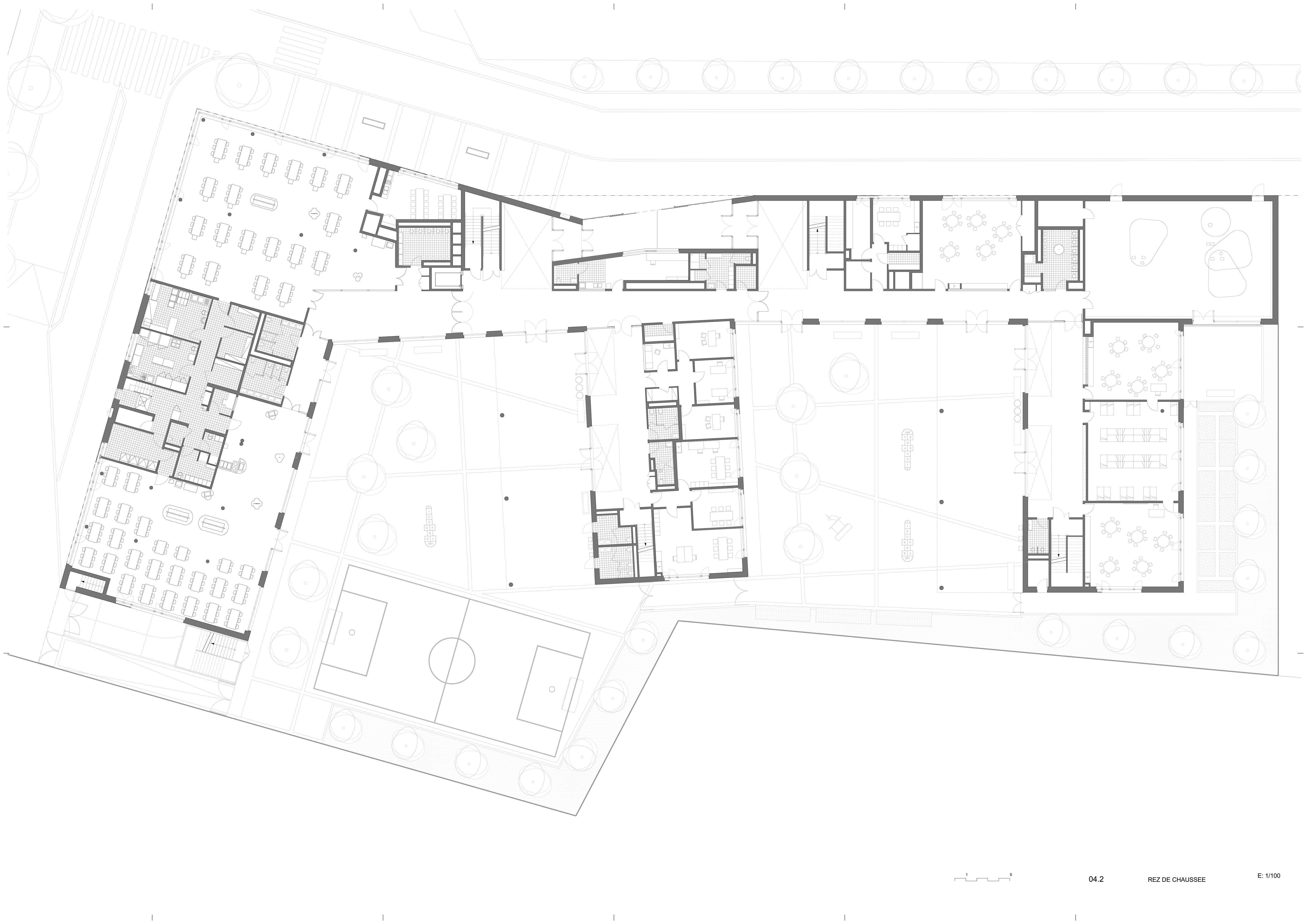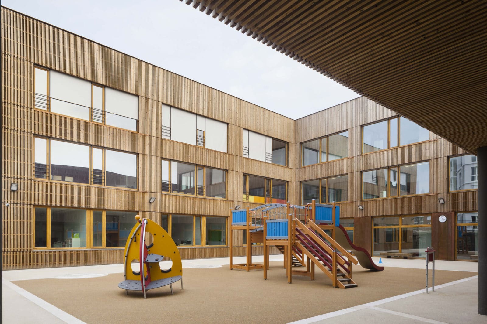 Le projet s’organise en trois corps de bâtiments distincts, chacun avec son identité particulière, reliés par une galerie large et lumineuse. Cette organisation spatiale fragmentée favorise la lisibilité des espaces, la fluidité des circulations et l’éclairage naturel dans tous les lieux de l’école. Chaque bâtiment correspond à une entité programmatique : l’école maternelle, l’école élémentaire, et les locaux communs aux deux écoles. Entre les bâtiments, les espaces extérieurs sont affectés aux cours de récréation des deux écoles ainsi qu’au jardin potager.
