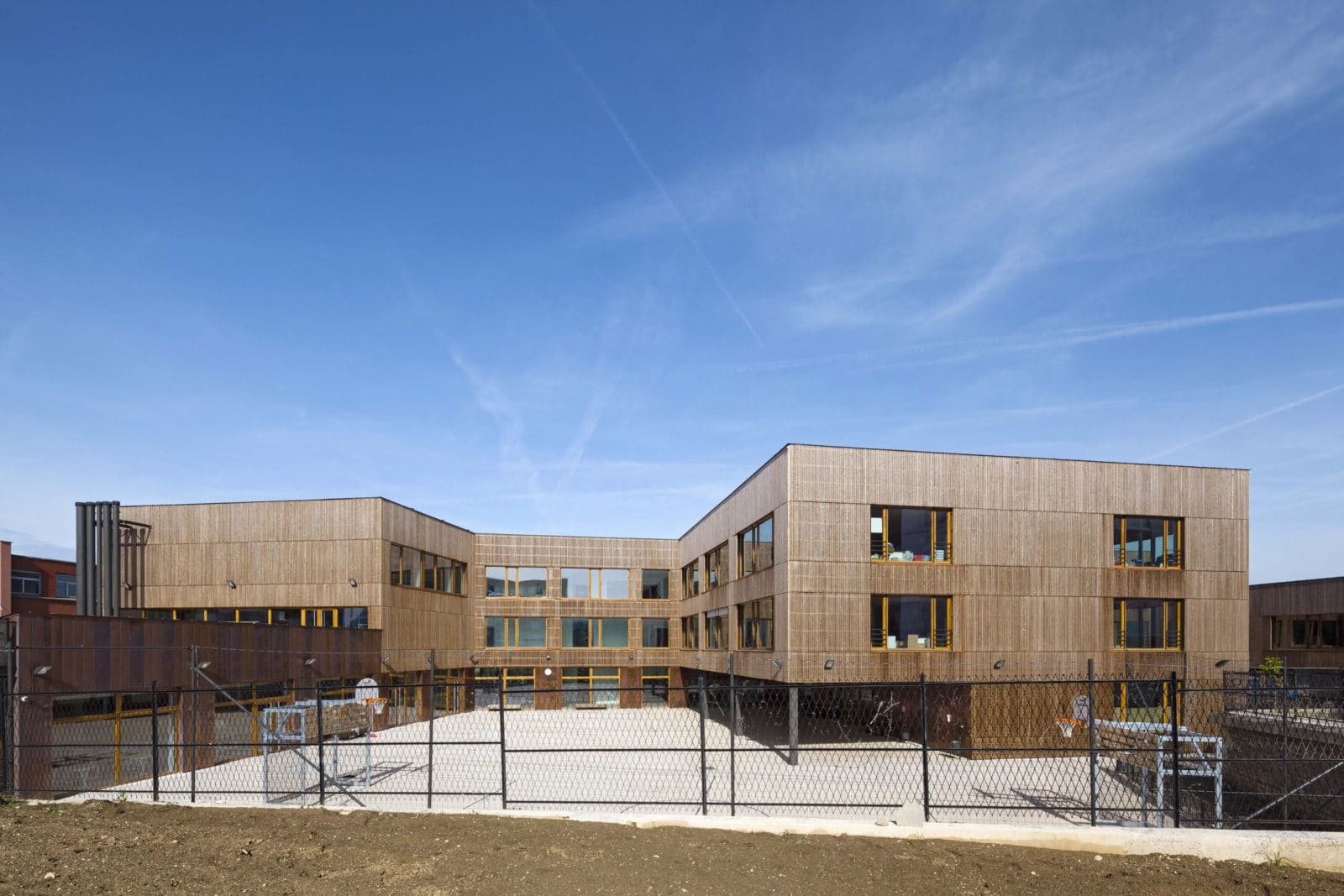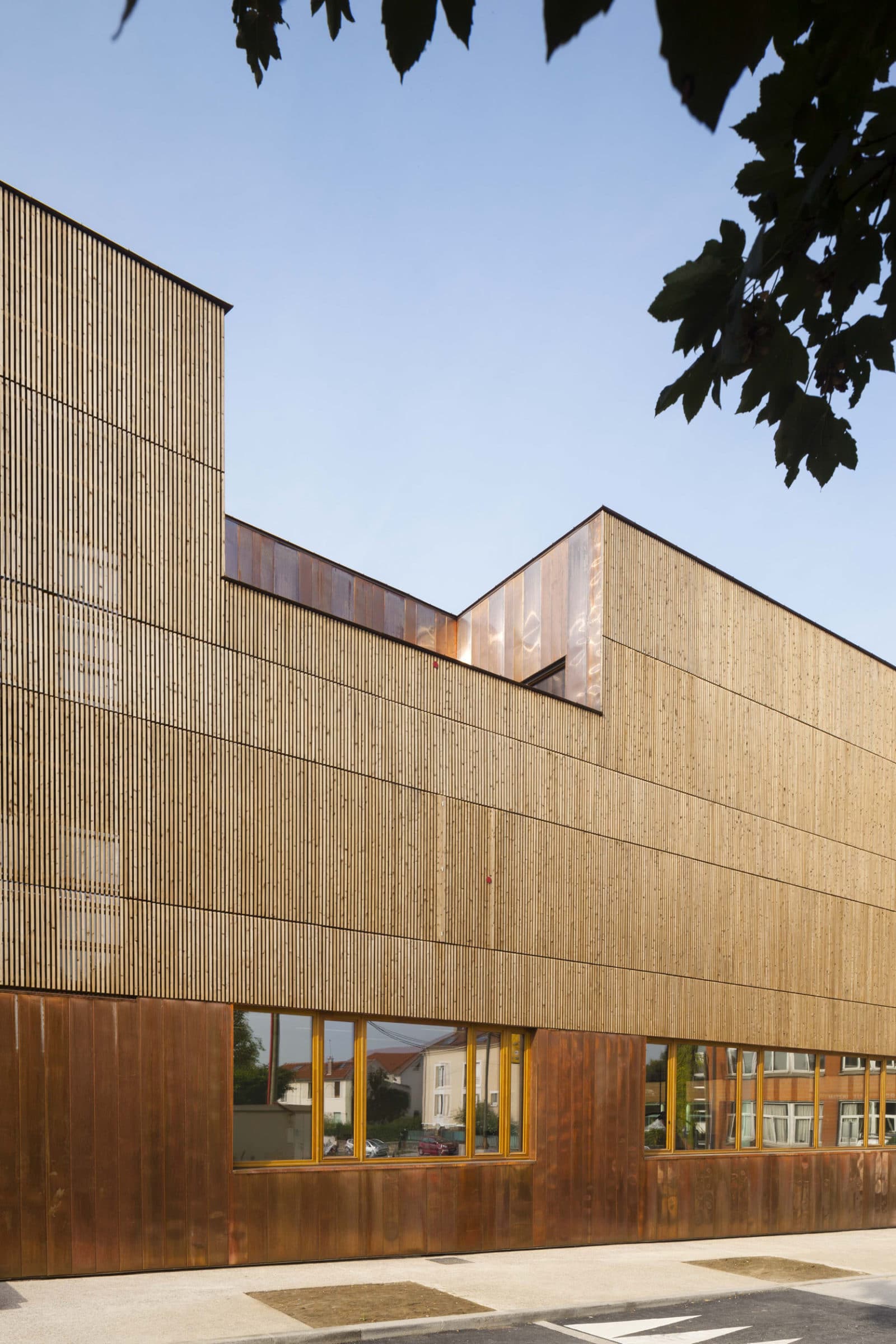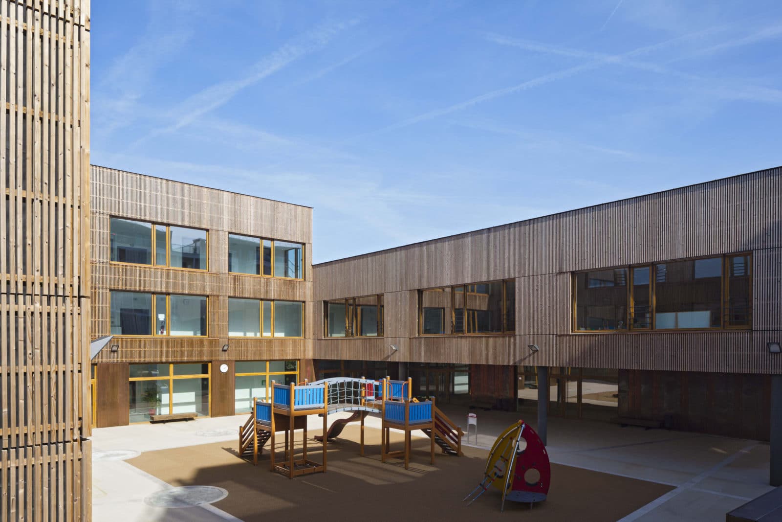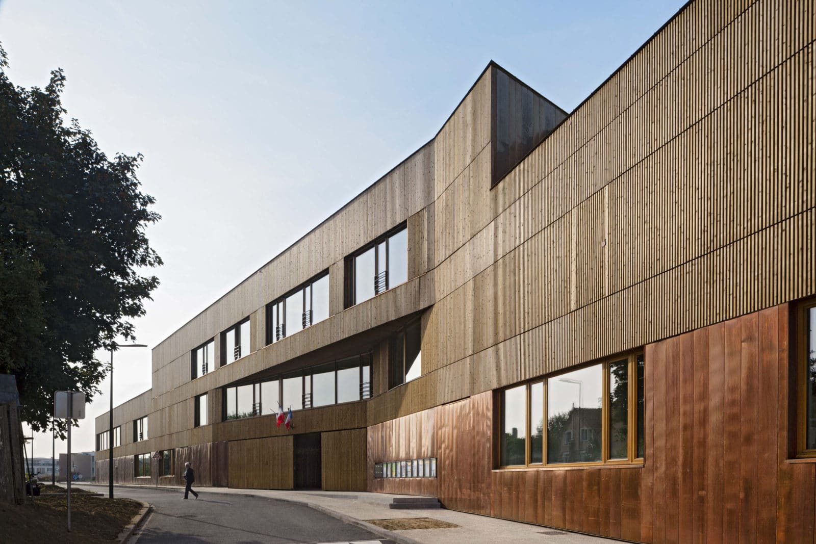 Cette disposition spatiale n’est pas sans rappeler les « demies lunes », ouvrages de protection avancée des forteresses. Pourtant ici, le caractère militaire disparait complétement pour laisser place à une architecture destinée aux enfants, douce, marquée par le dialogue du bois et du cuivre, tous deux matériaux nobles. Le soubassement est revêtu d’une peau de cuivre lisse tandis que les parties courantes sont revêtues d’une peau en épicéa, ajourée et traitée thermiquement, se prolongeant sous forme de claustras au niveau de certains ouvrants des salles de classe et des circulations. Ainsi les espaces bénéficient d’une ventilation par ouverture des fenêtres tout en restant protégés vis-à-vis des intrusions.