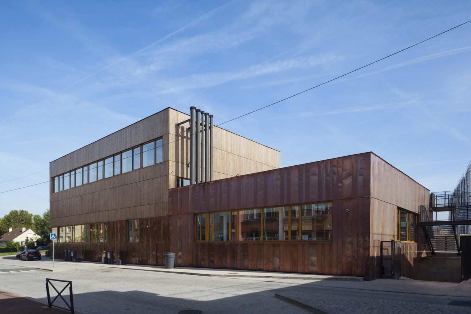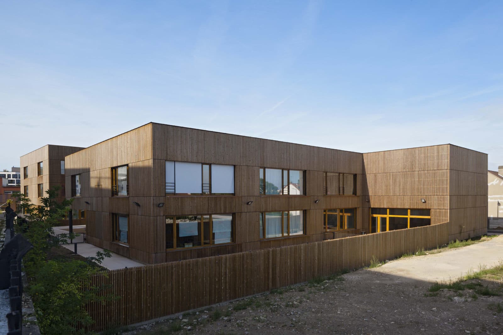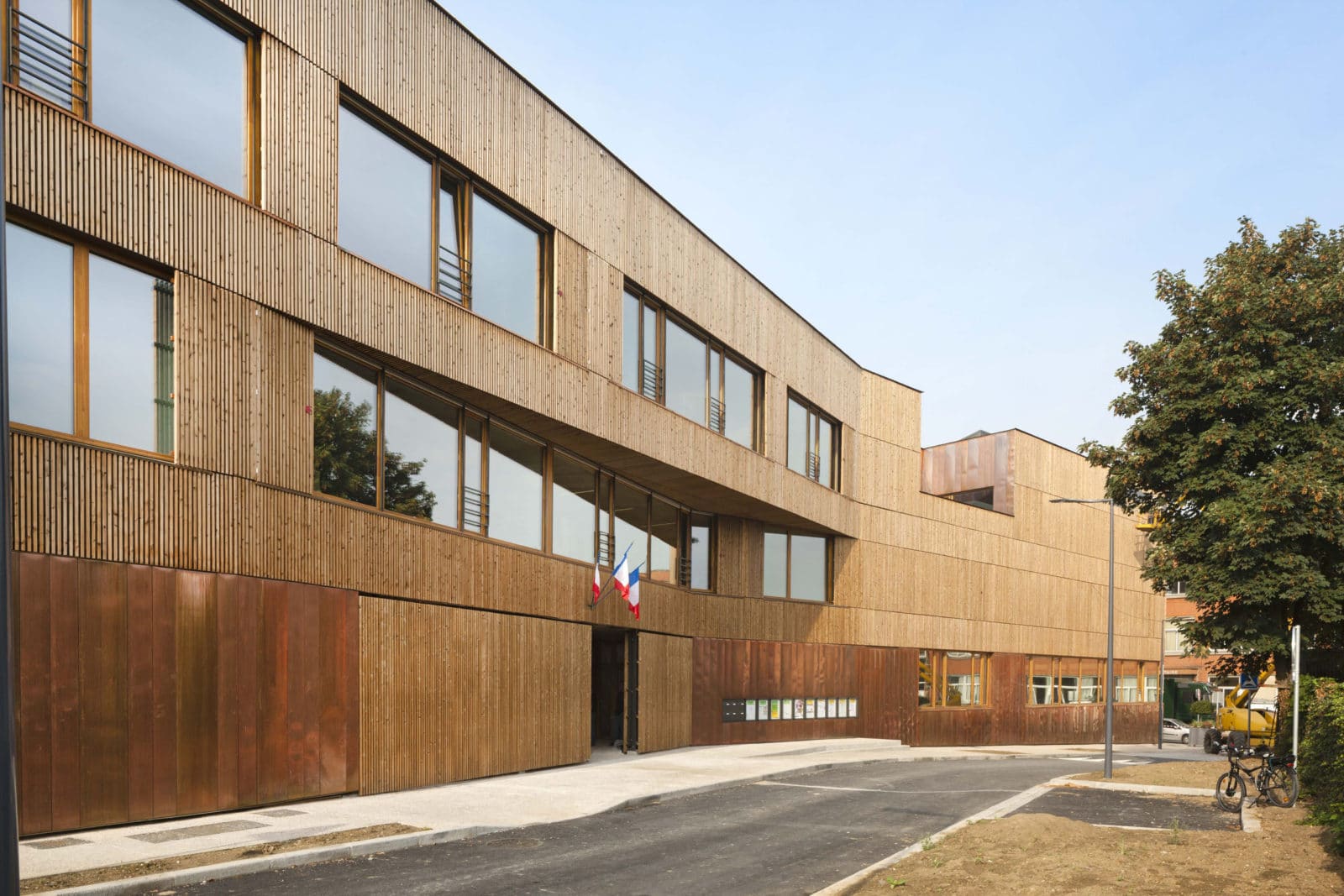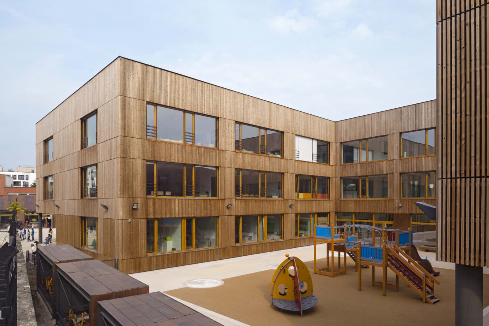 Cette disposition spatiale n’est pas sans rappeler les « demies lunes », ouvrages de protection avancée des forteresses. Pourtant ici, le caractère militaire disparait complétement pour laisser place à une architecture destinée aux enfants, douce, marquée par le dialogue du bois et du cuivre, tous deux matériaux nobles. Le soubassement est revêtu d’une peau de cuivre lisse tandis que les parties courantes sont revêtues d’une peau en épicéa, ajourée et traitée thermiquement, se prolongeant sous forme de claustras au niveau de certains ouvrants des salles de classe et des circulations. Ainsi les espaces bénéficient d’une ventilation par ouverture des fenêtres tout en restant protégés vis-à-vis des intrusions.
