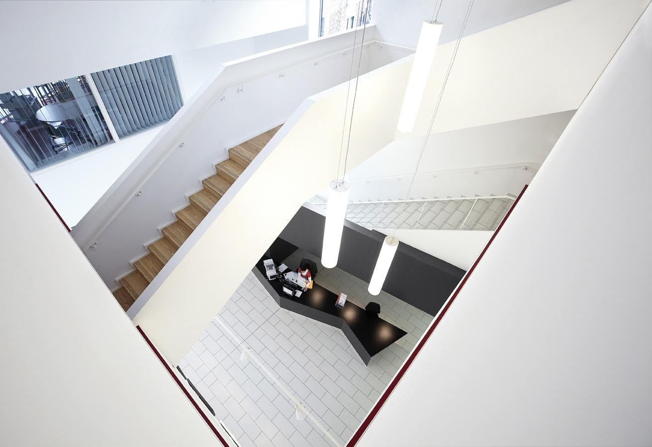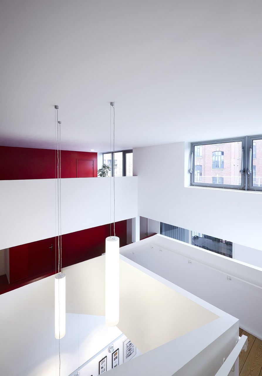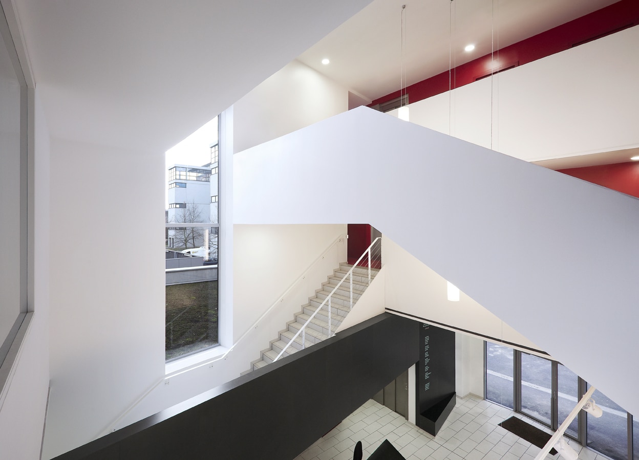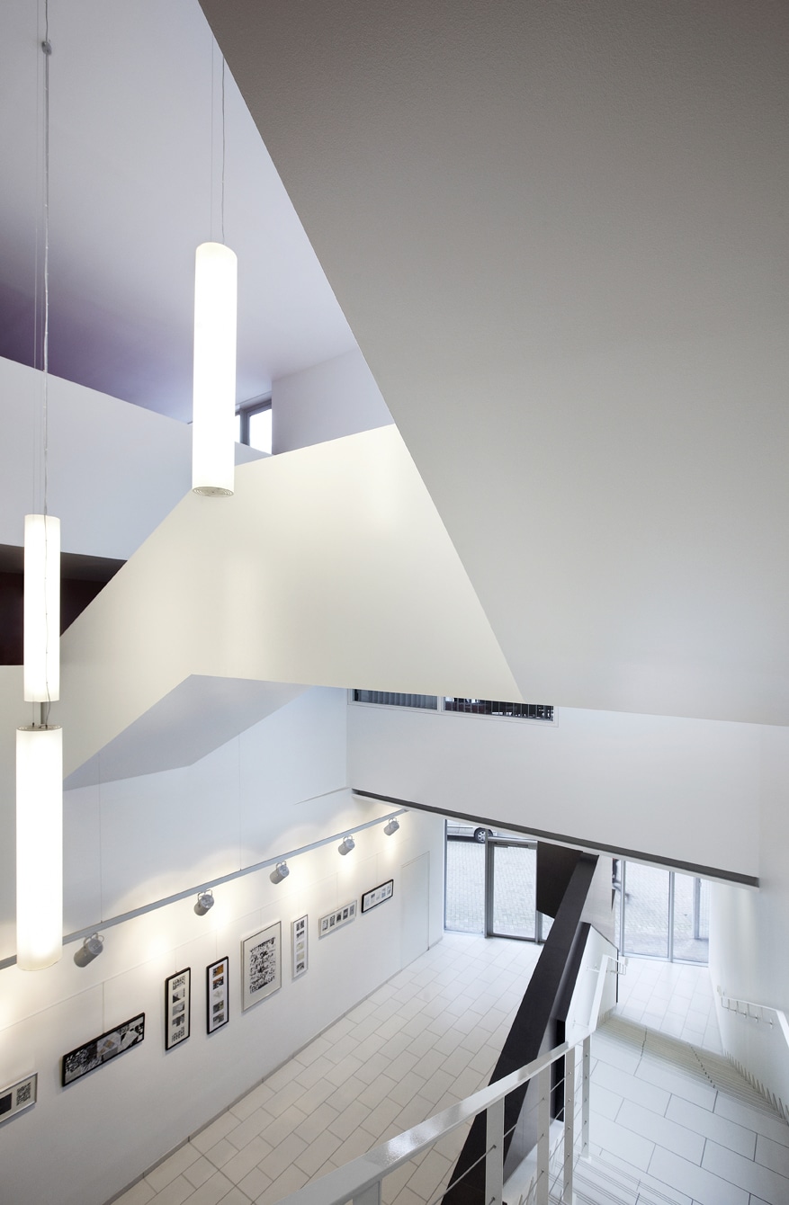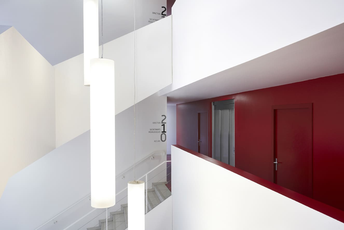 L’intérieur est traité de manière sobre avec une dominante de blanc. Des éléments structures comme la poutre ou le mur périphérique sont revêtues de peinture de couleur facilitant la lecture de l’équipement. Les escaliers prennent place dans le hall en s’entrecroisant.