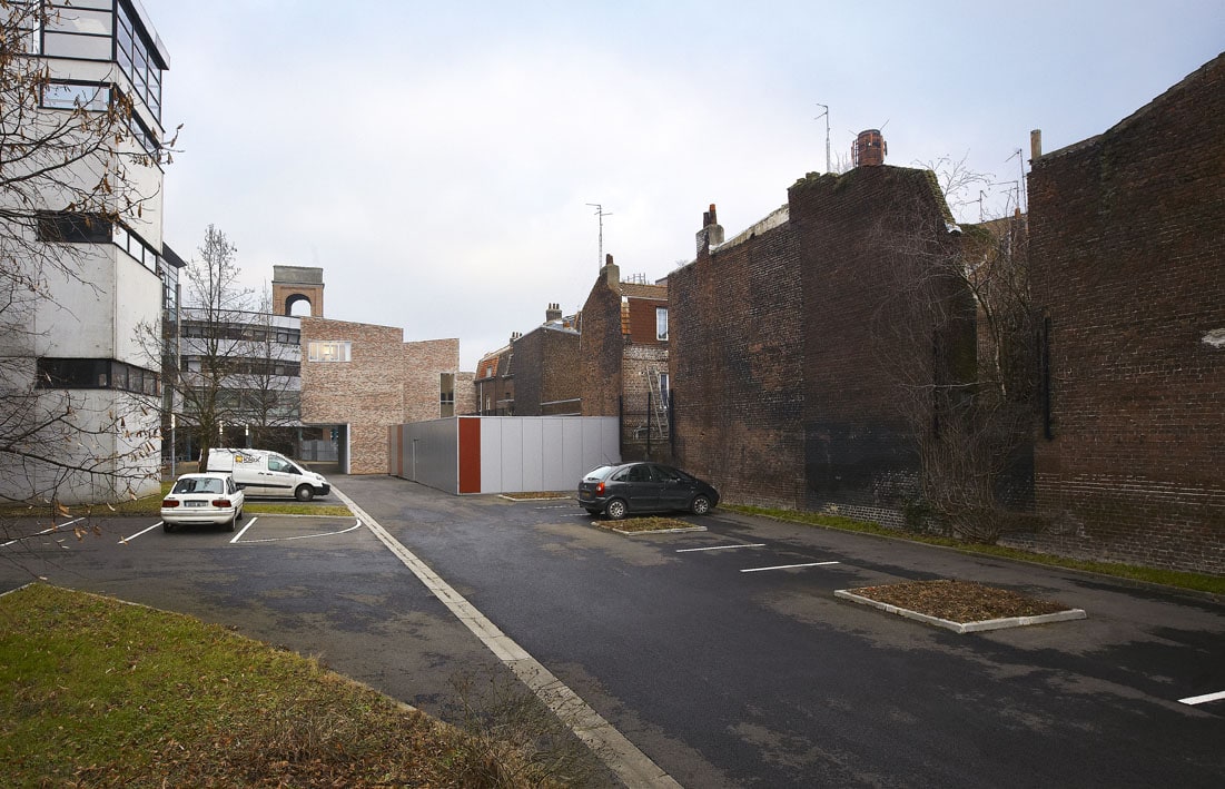 Sur cette étroite parcelle en continuité avec des maisons rue de Mulhouse et face aux bâtiments de la faculté d’une envergure plus importante. Les architectes ont donc cherché à lié le bâtiment avec les constructions hétéroclites avoisinantes.
