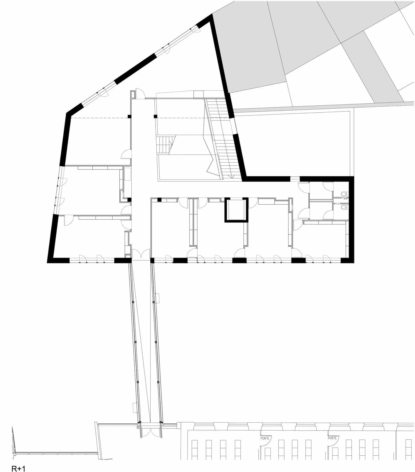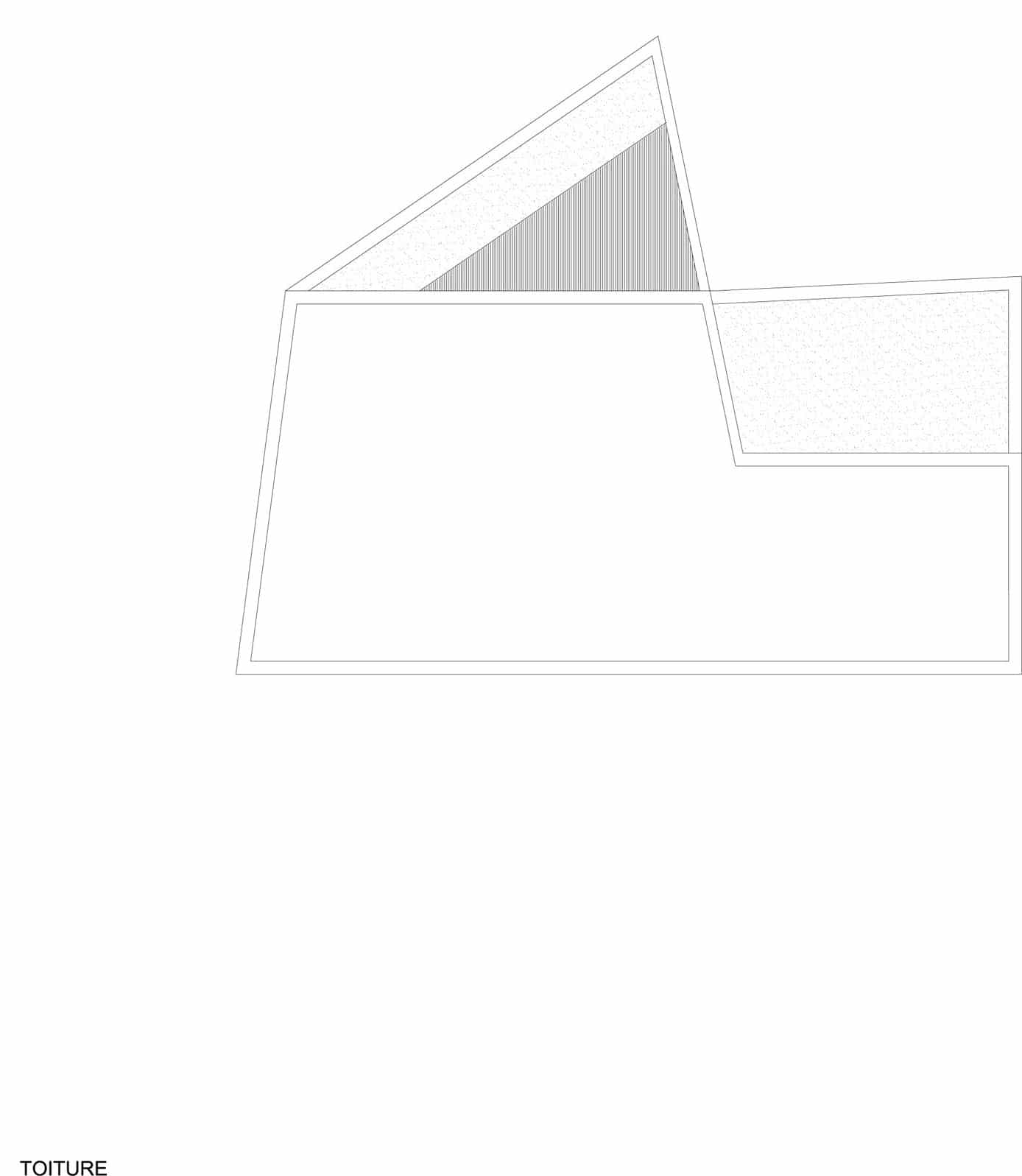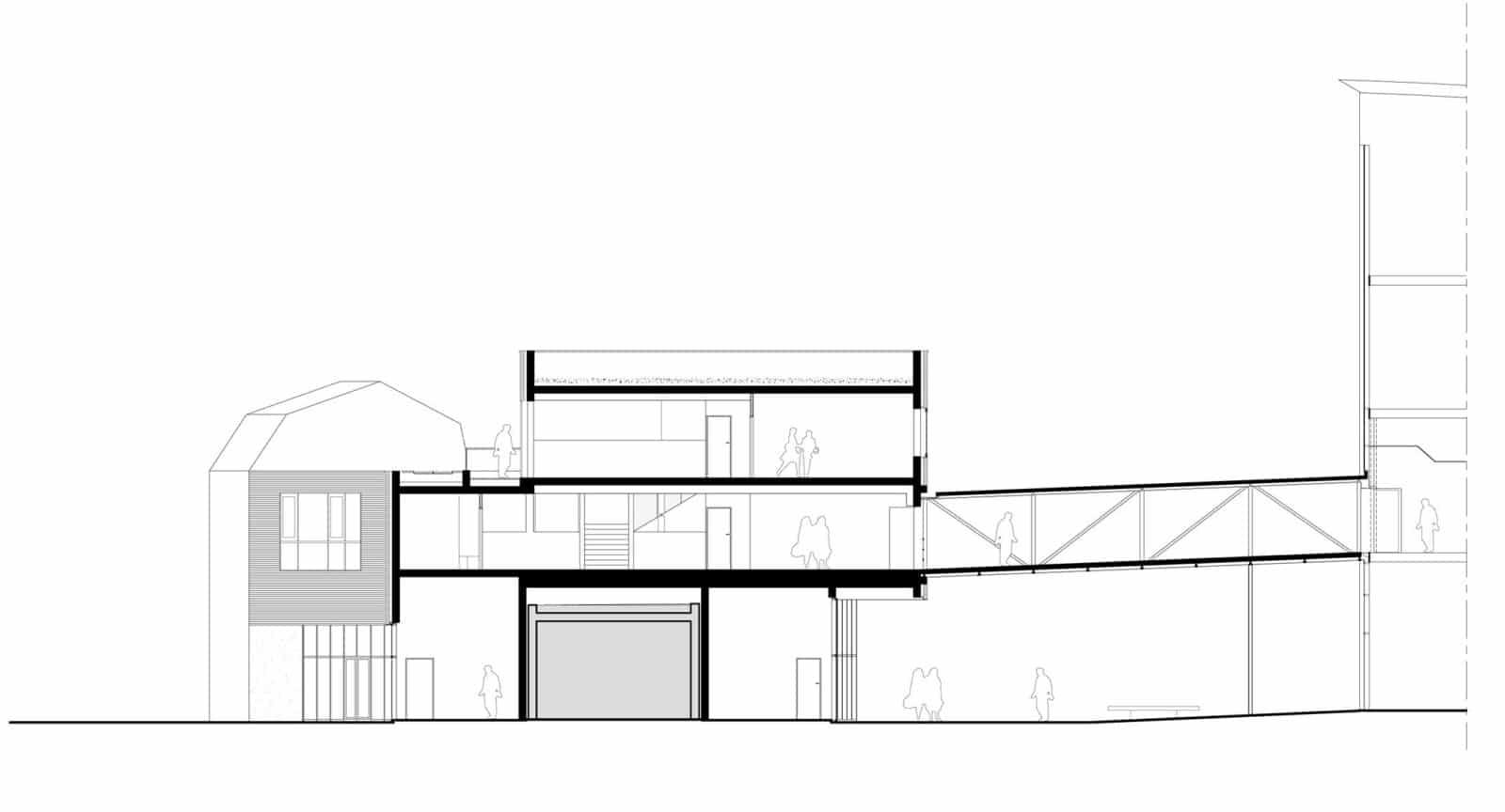 Le décrochement au R+2 laisse place à une terrasse accessible de forme triangulaire. Sa présence améliore la transition des hauteurs. Le bâtiment admet un léger porte-à-faux créant ainsi un préau sur la cour. Une passerelle métallique vitrée traverse la cour pour connecter l’édifice à l’existant.