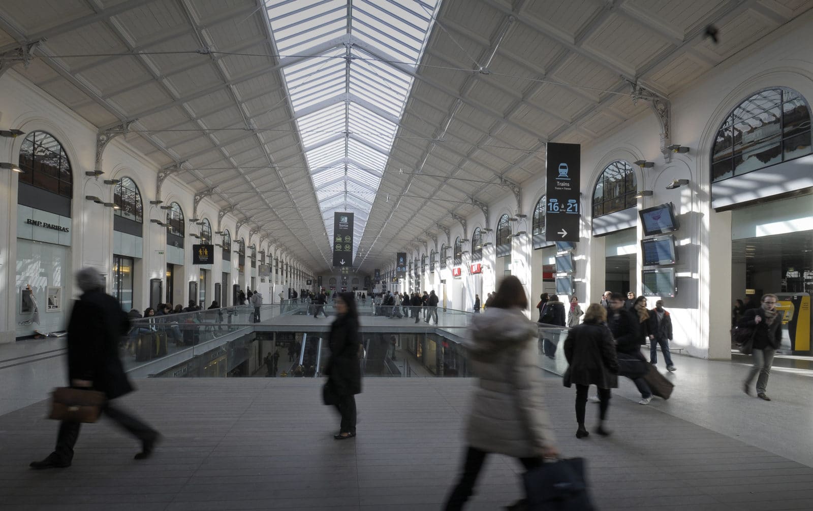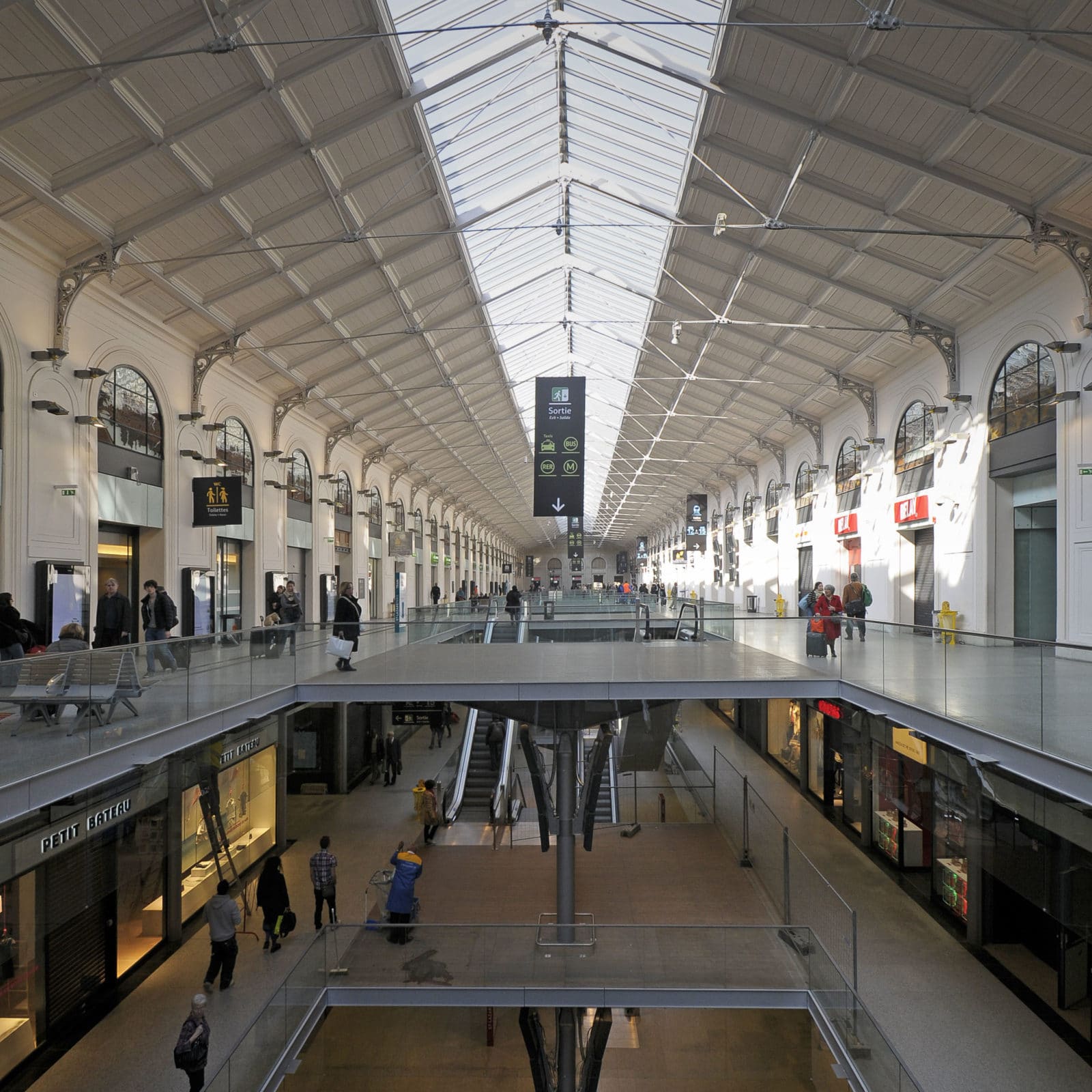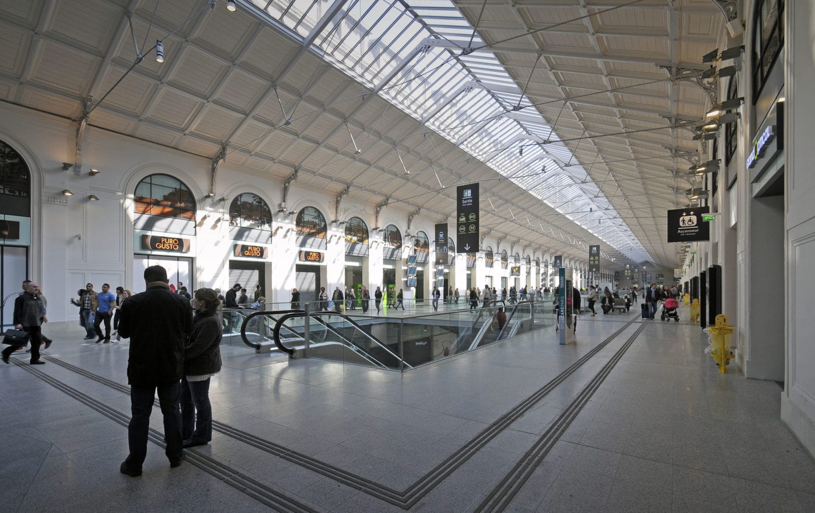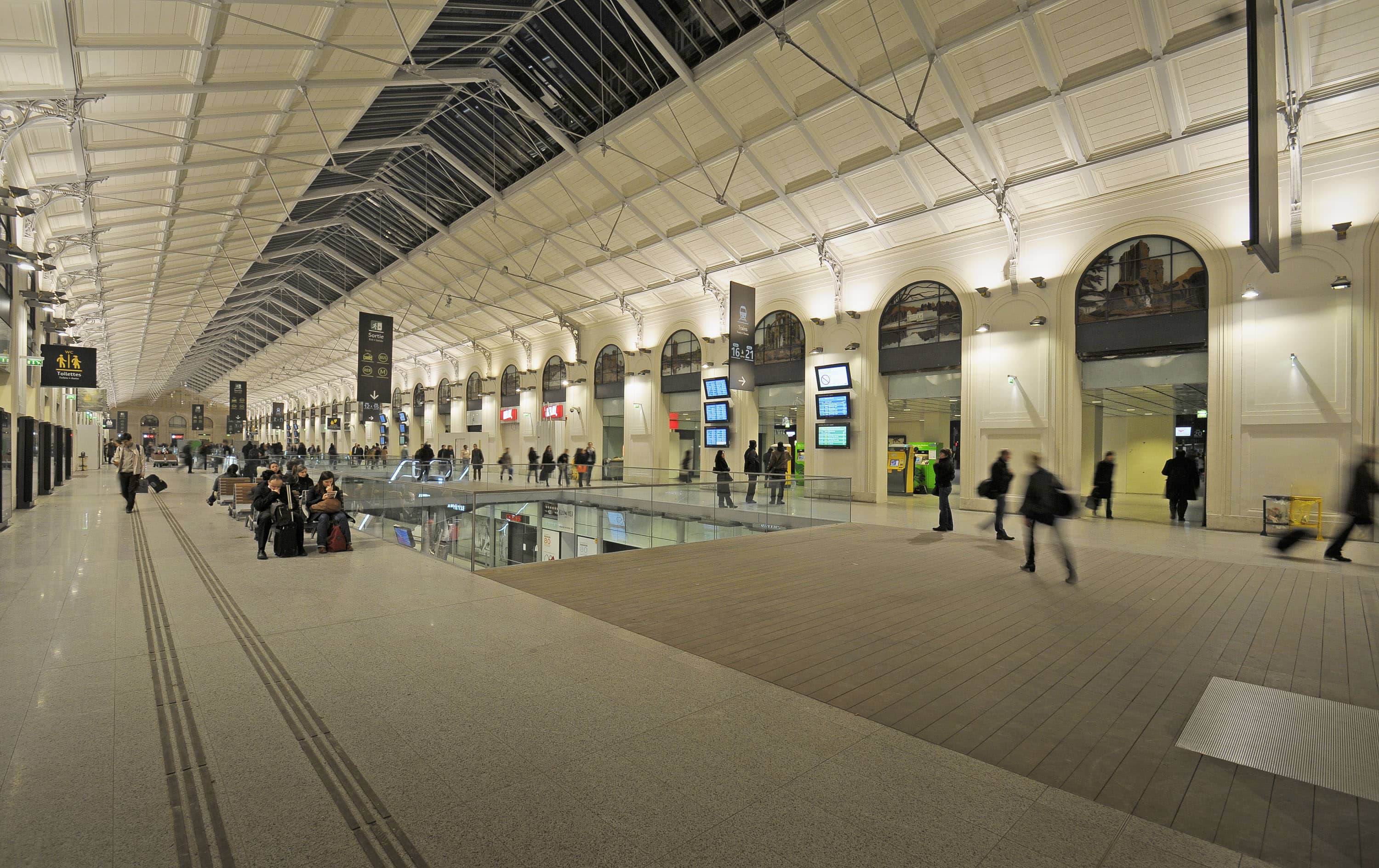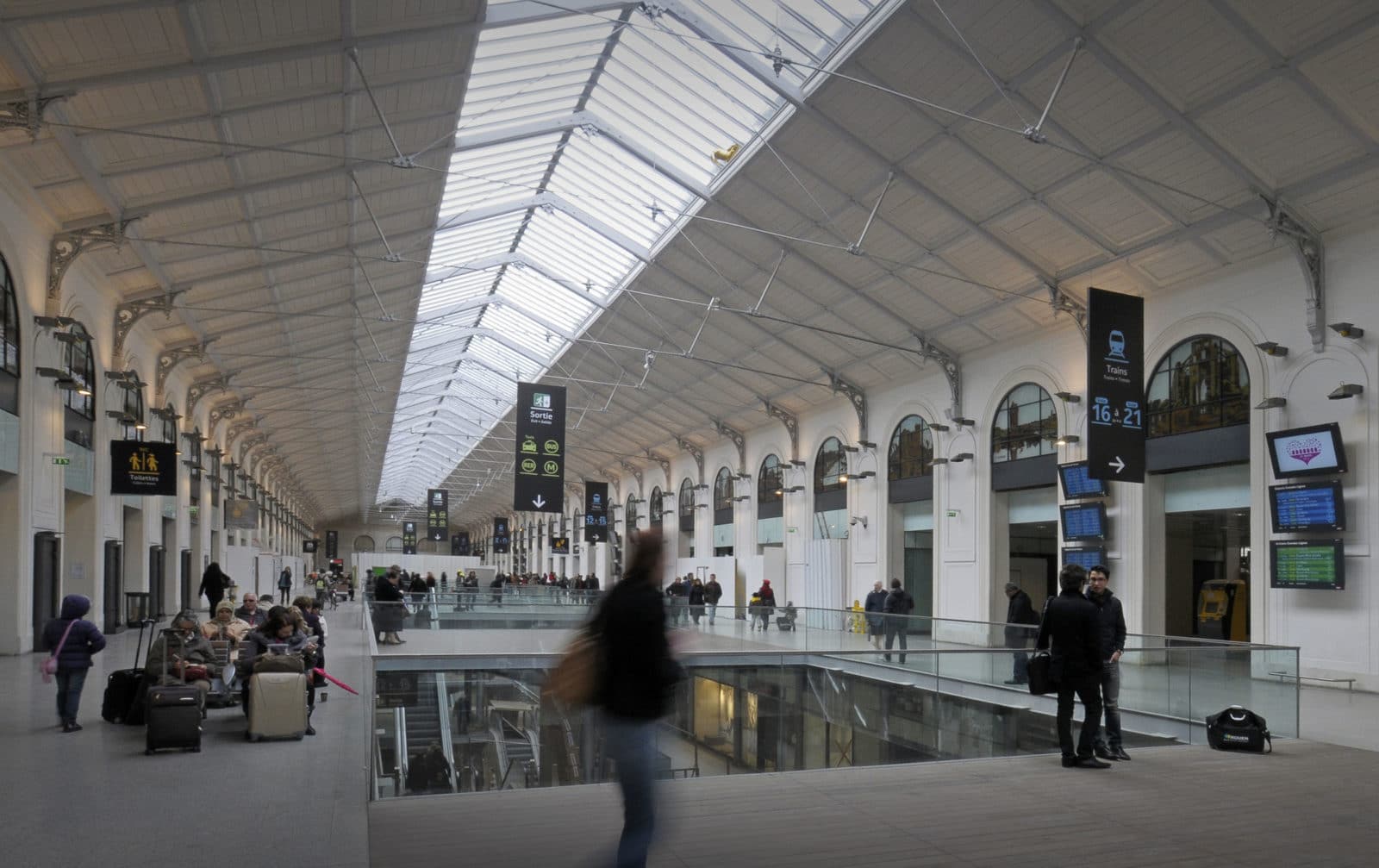 La salles des pas perdus s’illumine par la verrière du bâtiment historique long de 200 mètres et transmet sa clarté aux niveaux inférieurs par quatre failles où se logent les escaliers mécaniques. Les divers réseaux qui s’étaient greffés sur les façades ont disparus pour faire resurgir la pierre comme à l’origine. Granit clair pour le sol, verre pincé pour les garde-corps, la restauration se veut être sobre, claire et épurée. Le cloisonnement qui définissait le quai transversal et la salle des pas perdus a été supprimé, le voyageur peut ainsi choisir son lieu d’attente qui jusqu’à maintenant sous-utilisait la salle des pas perdus. L’enjeu de cette nouvelle galerie est double puisqu’il s’agit de répondre aux besoins des voyageurs mais également d’attirer un public non-voyageur dans les boutiques.