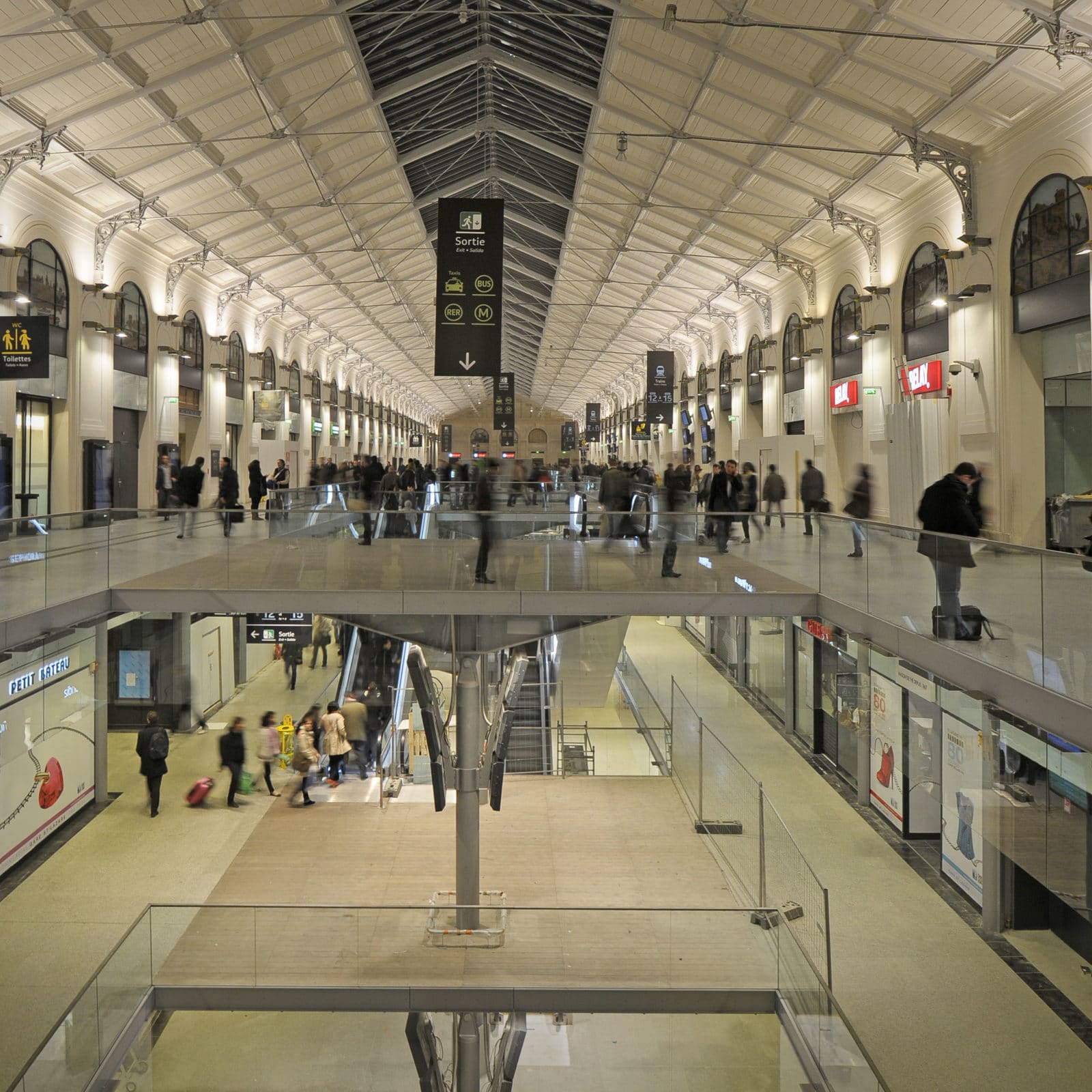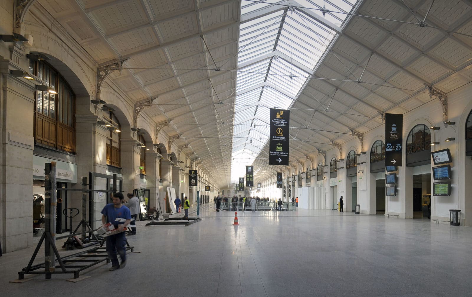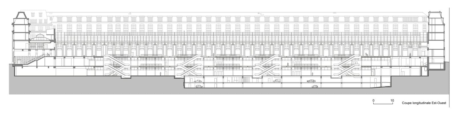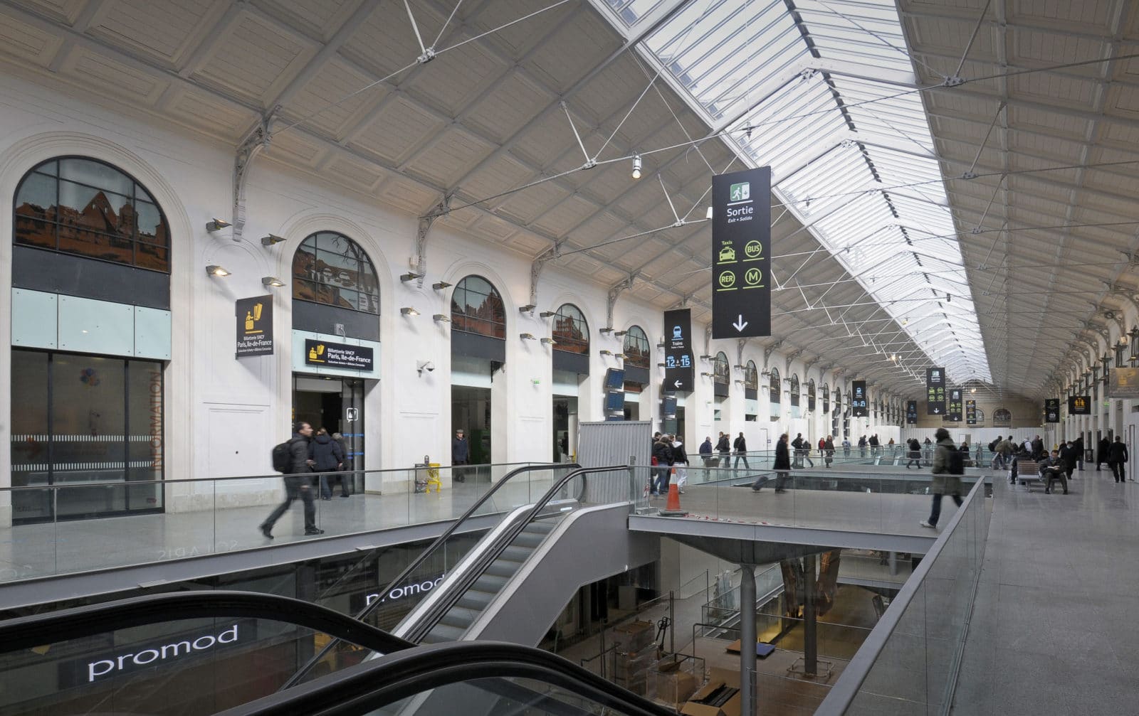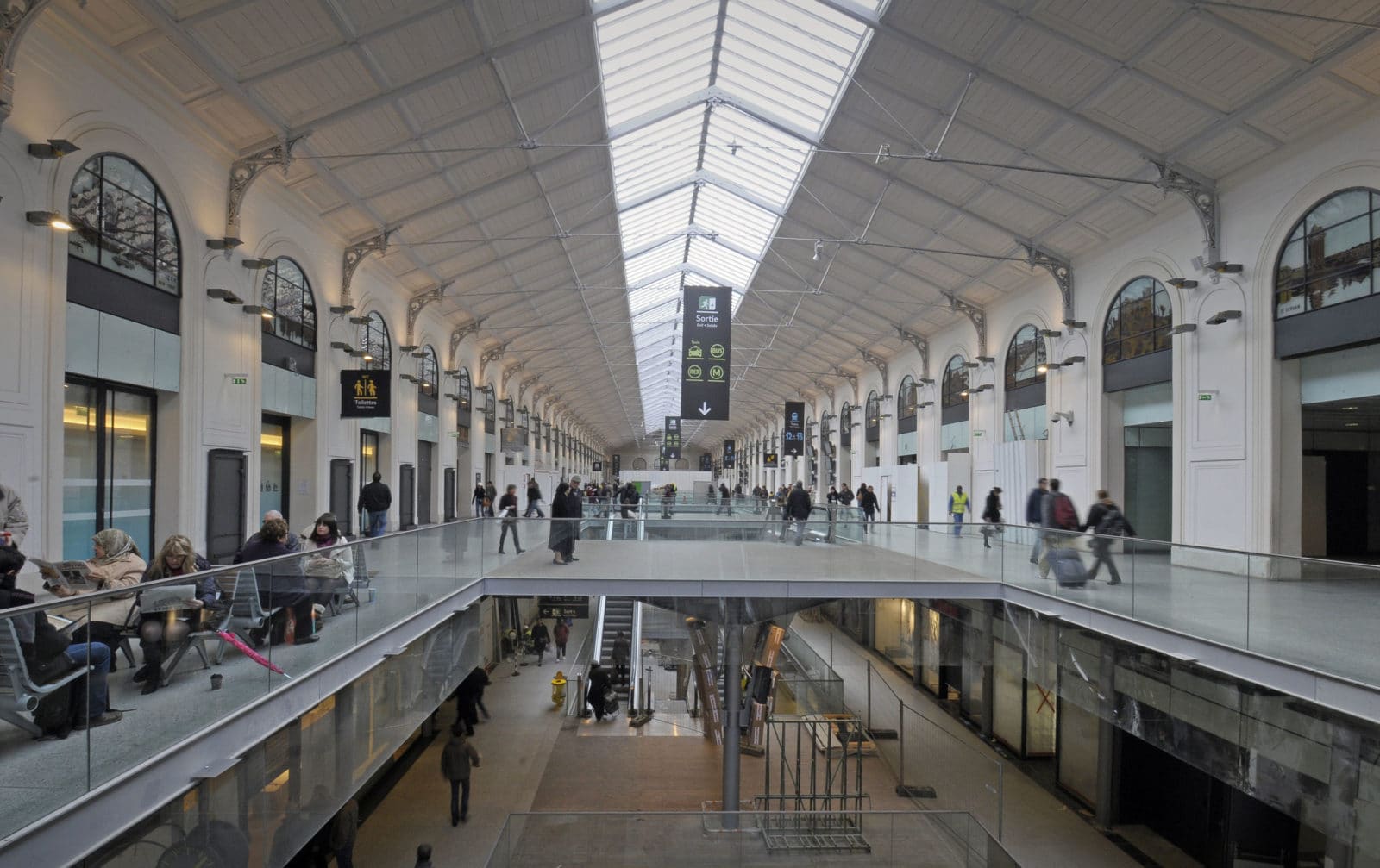 La salles des pas perdus s’illumine par la verrière du bâtiment historique long de 200 mètres et transmet sa clarté aux niveaux inférieurs par quatre failles où se logent les escaliers mécaniques. Les divers réseaux qui s’étaient greffés sur les façades ont disparus pour faire resurgir la pierre comme à l’origine. Granit clair pour le sol, verre pincé pour les garde-corps, la restauration se veut être sobre, claire et épurée. Le cloisonnement qui définissait le quai transversal et la salle des pas perdus a été supprimé, le voyageur peut ainsi choisir son lieu d’attente qui jusqu’à maintenant sous-utilisait la salle des pas perdus. L’enjeu de cette nouvelle galerie est double puisqu’il s’agit de répondre aux besoins des voyageurs mais également d’attirer un public non-voyageur dans les boutiques.