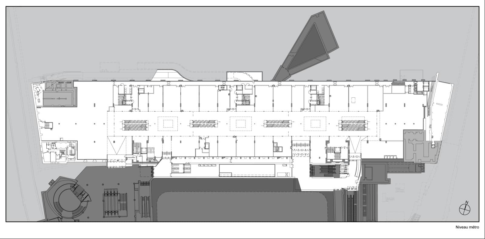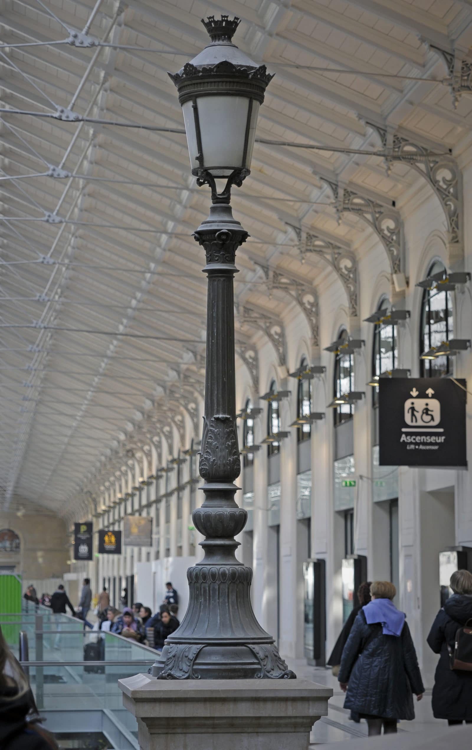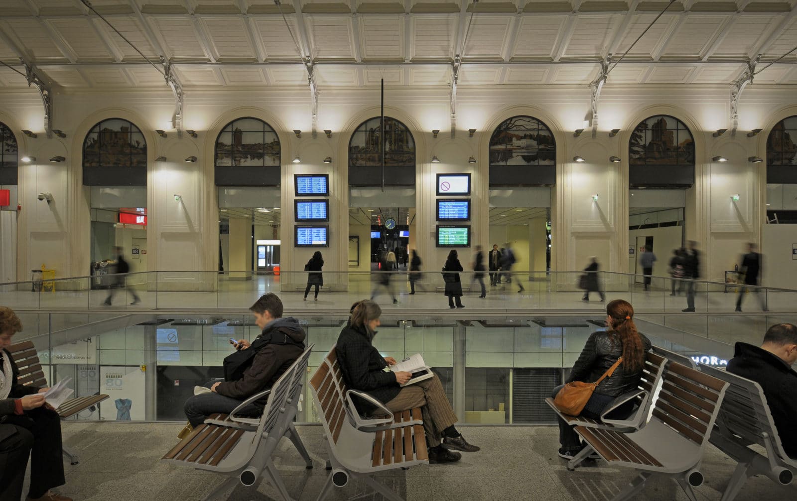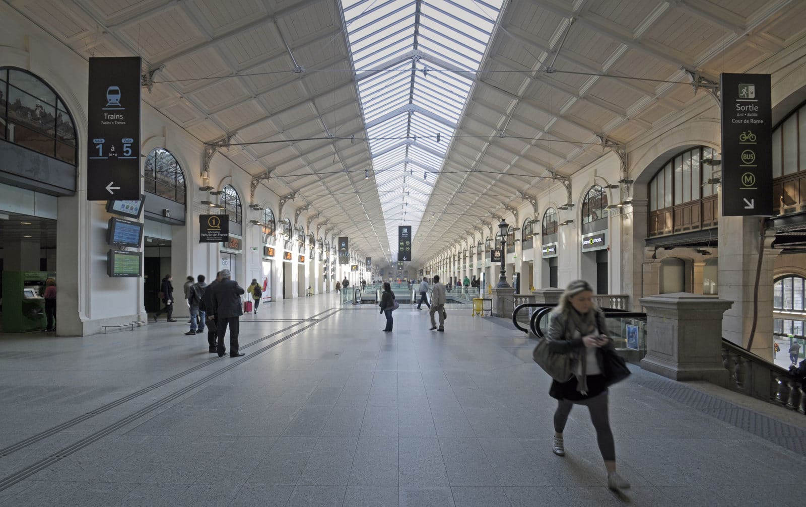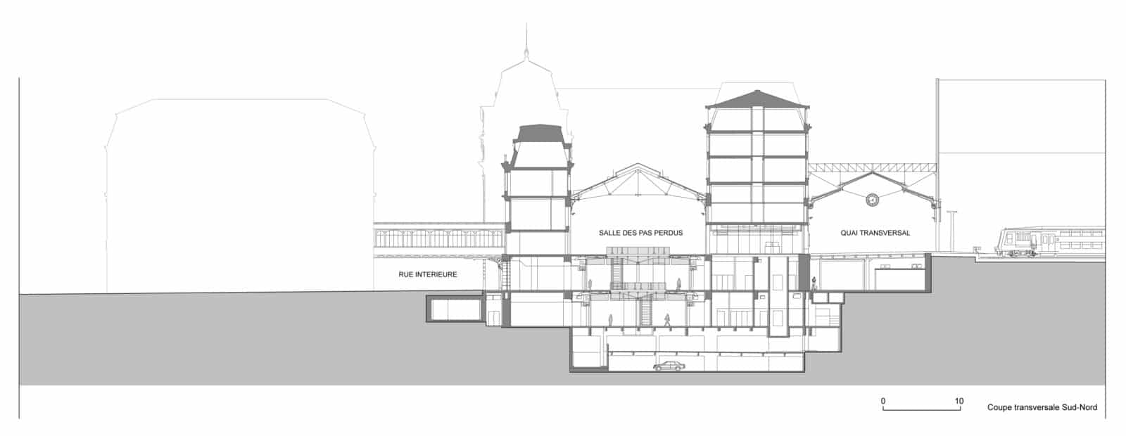 La salles des pas perdus s’illumine par la verrière du bâtiment historique long de 200 mètres et transmet sa clarté aux niveaux inférieurs par quatre failles où se logent les escaliers mécaniques. Les divers réseaux qui s’étaient greffés sur les façades ont disparus pour faire resurgir la pierre comme à l’origine. Granit clair pour le sol, verre pincé pour les garde-corps, la restauration se veut être sobre, claire et épurée. Le cloisonnement qui définissait le quai transversal et la salle des pas perdus a été supprimé, le voyageur peut ainsi choisir son lieu d’attente qui jusqu’à maintenant sous-utilisait la salle des pas perdus. L’enjeu de cette nouvelle galerie est double puisqu’il s’agit de répondre aux besoins des voyageurs mais également d’attirer un public non-voyageur dans les boutiques.