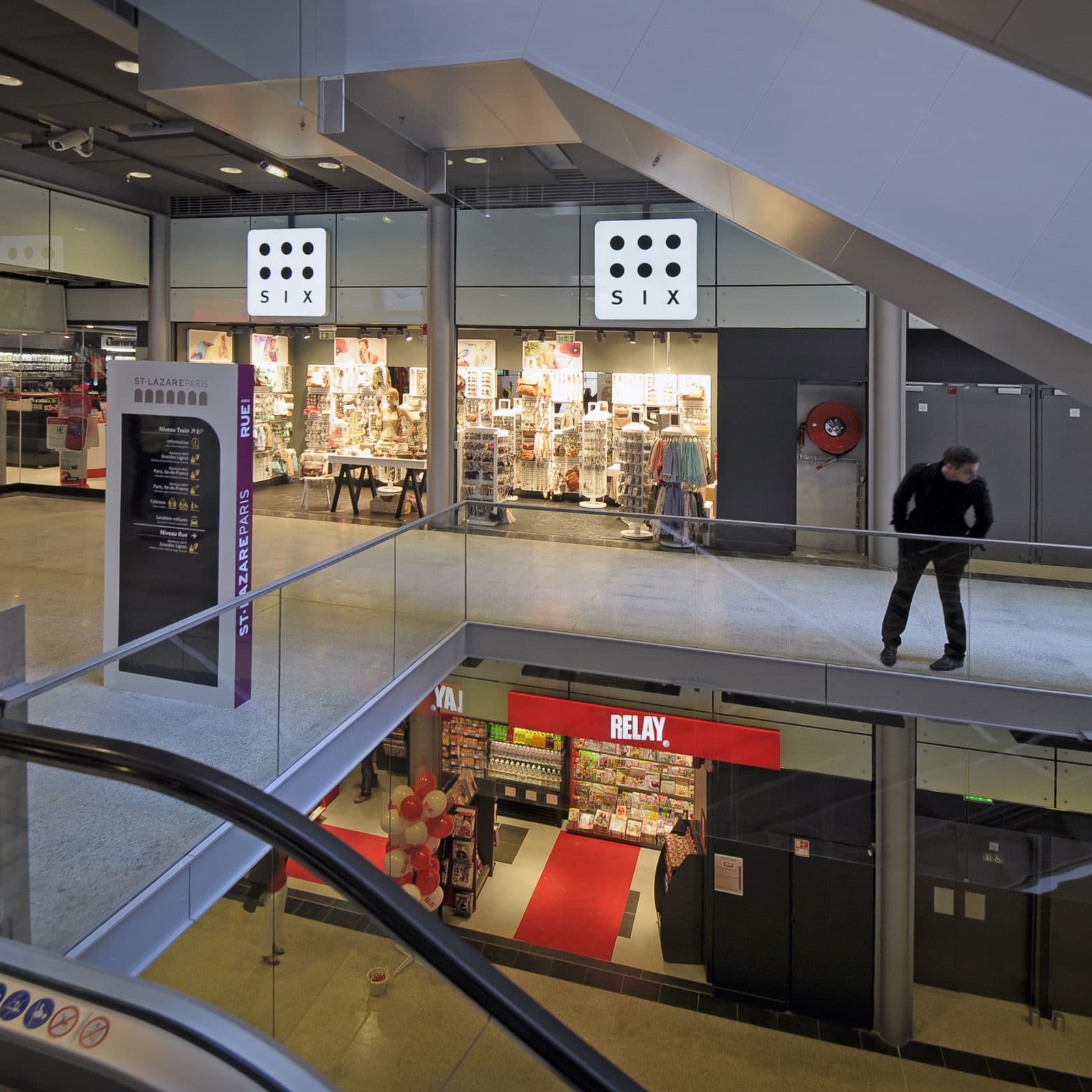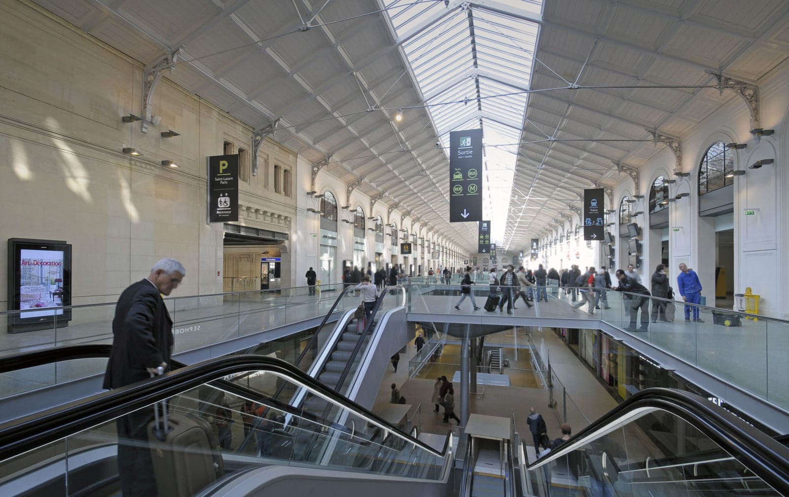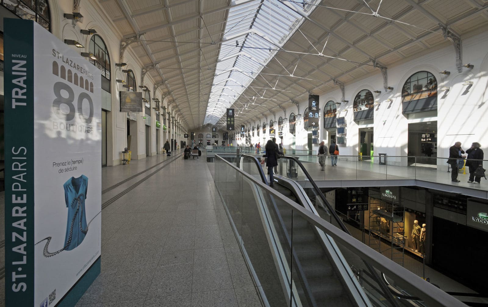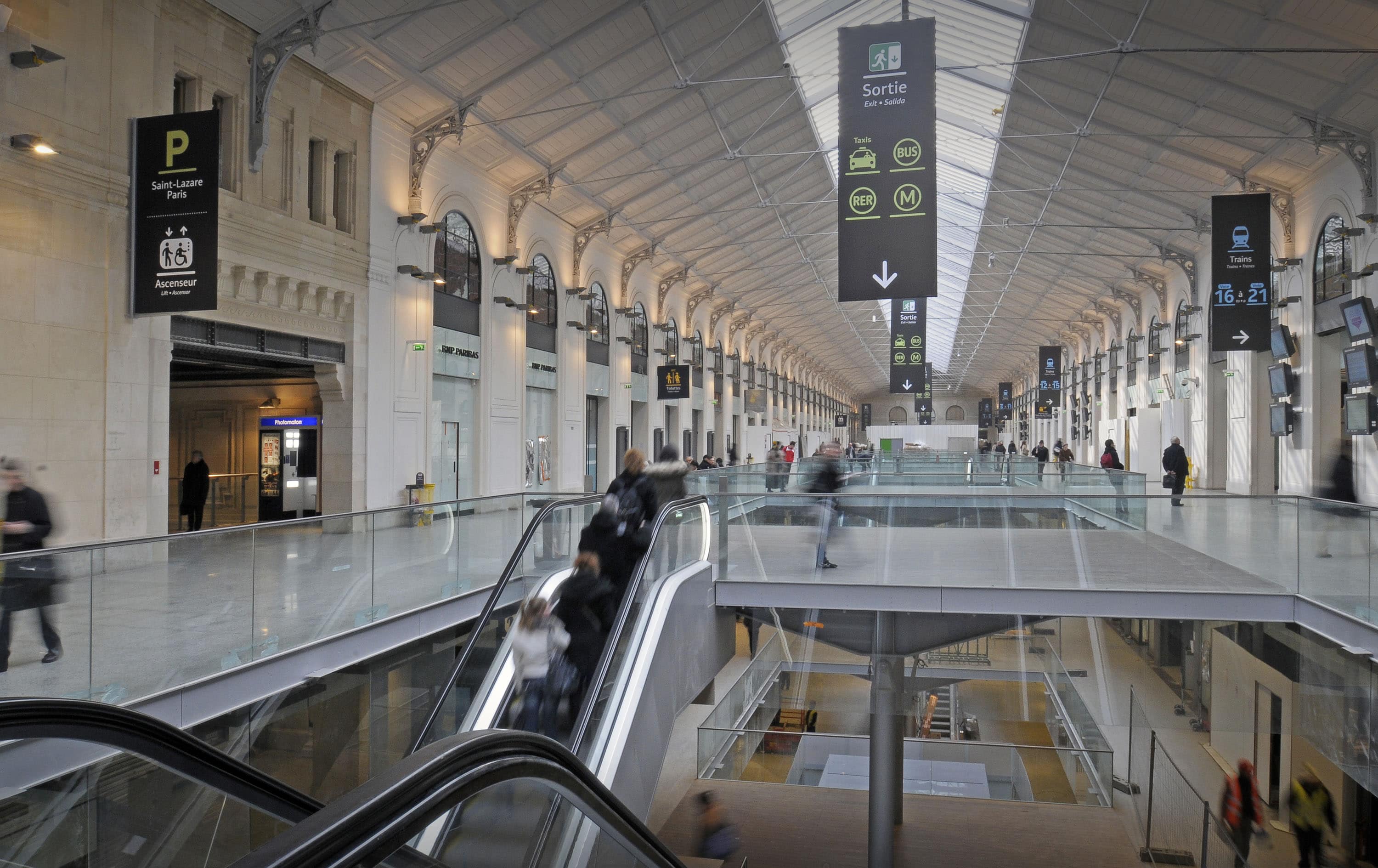 Desservie par 27 voies ferrées fréquentées par 84% des 450 000 visiteurs quotidiens connecté à deux lignes de RER, six de métro et vingt-sept de bus, la gare Saint-Lazare se place en deuxième marche des gares les plus fréquentées d’Europe totalisant une surface de 30 000 m². La phase de restauration concernait les 6 000 m² marchands de la gare qui sont portés à 10 000 m².