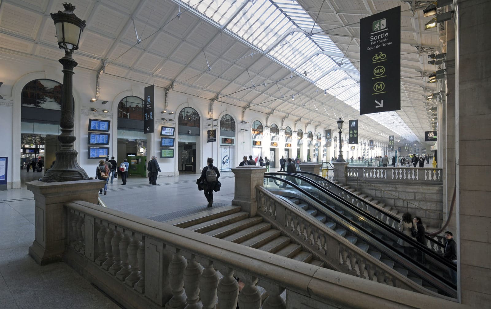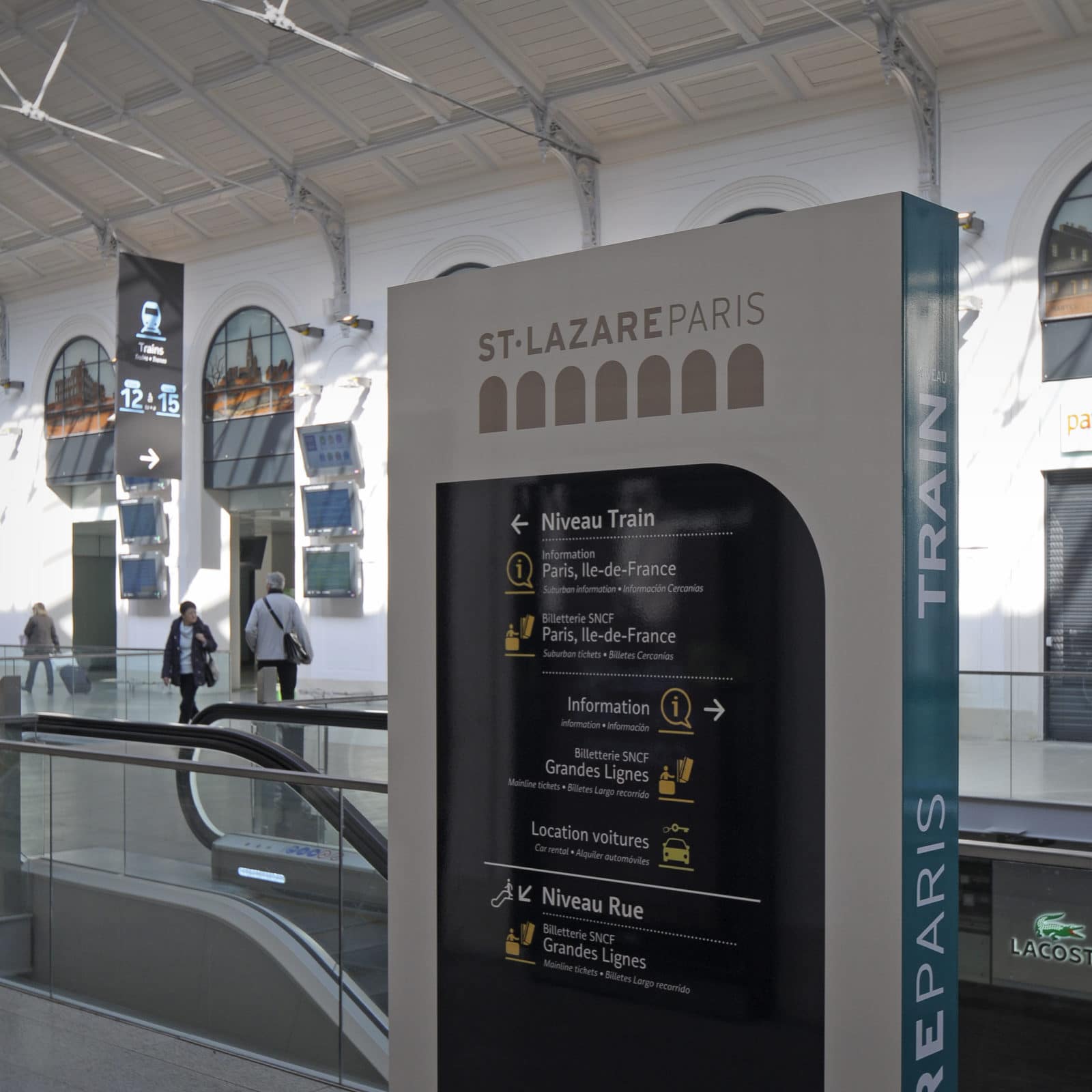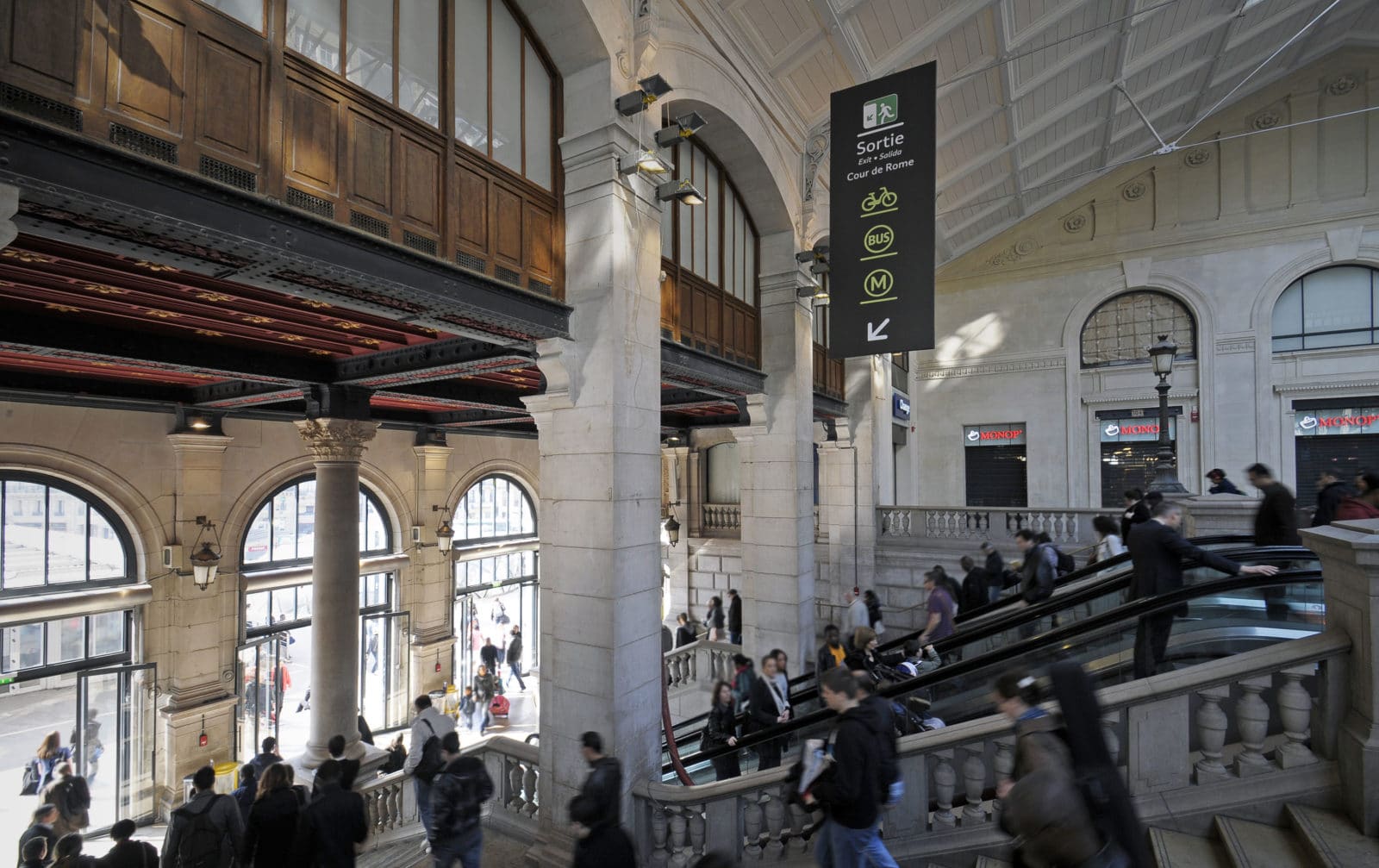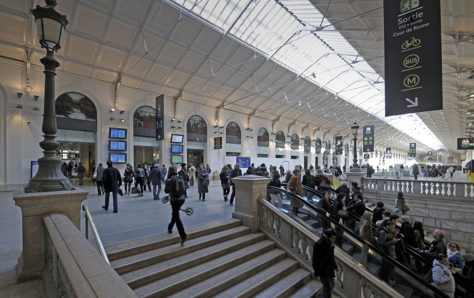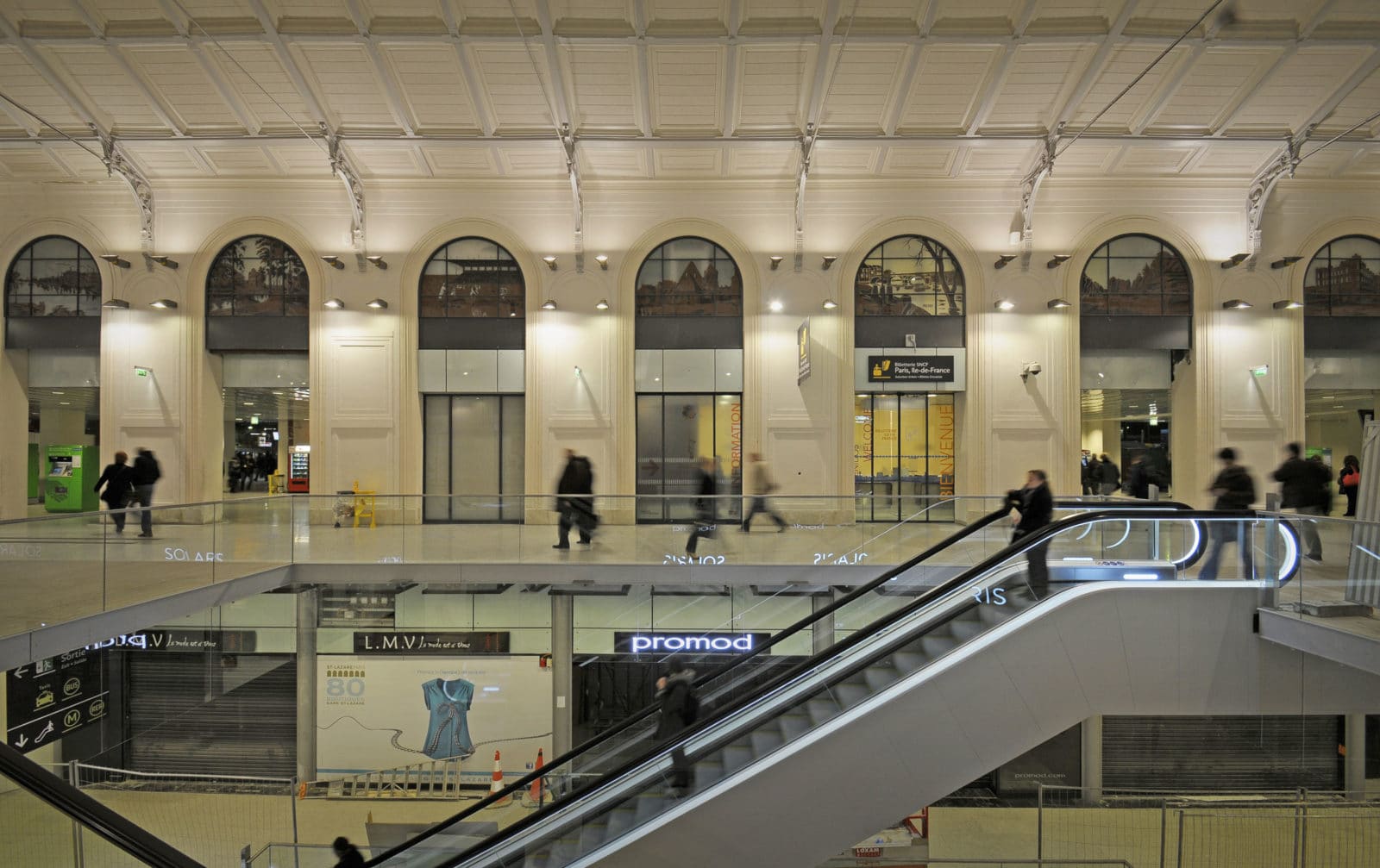 Desservie par 27 voies ferrées fréquentées par 84% des 450 000 visiteurs quotidiens connecté à deux lignes de RER, six de métro et vingt-sept de bus, la gare Saint-Lazare se place en deuxième marche des gares les plus fréquentées d’Europe totalisant une surface de 30 000 m². La phase de restauration concernait les 6 000 m² marchands de la gare qui sont portés à 10 000 m².