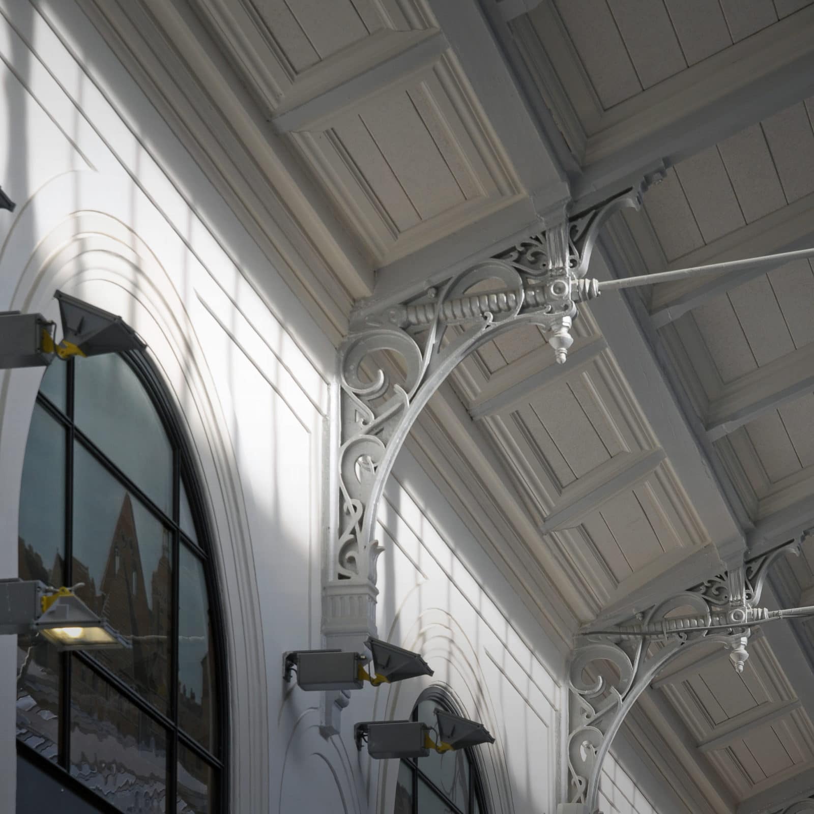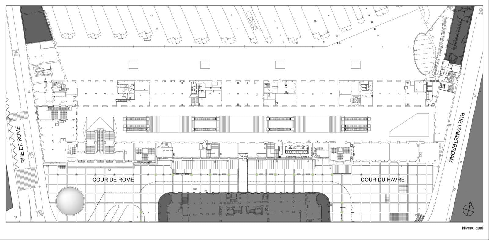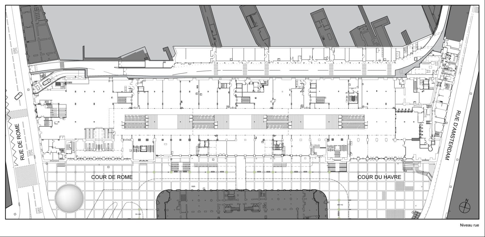 La charpente de fermes Polonceau mixant le bois et l’acier est révélée, la sous-face est traitée avec des caissons de bois qui dissimulent le zinc de la toiture posé sur un voligeage en bois. Des panneaux acoustiques viennent s’insérer derrière les caissons de bois. Les détails de la charpente sont restaurés et mis en avant. Deux niveaux de parkings sont créés sous le métro avec une jauge de 230 places et un accès par la rue de Rome. Durant les 33 mois de travaux, la gare n’a cessé de fonctionner, la création de trois tunnels piétons a donc diminuer cette contrainte.