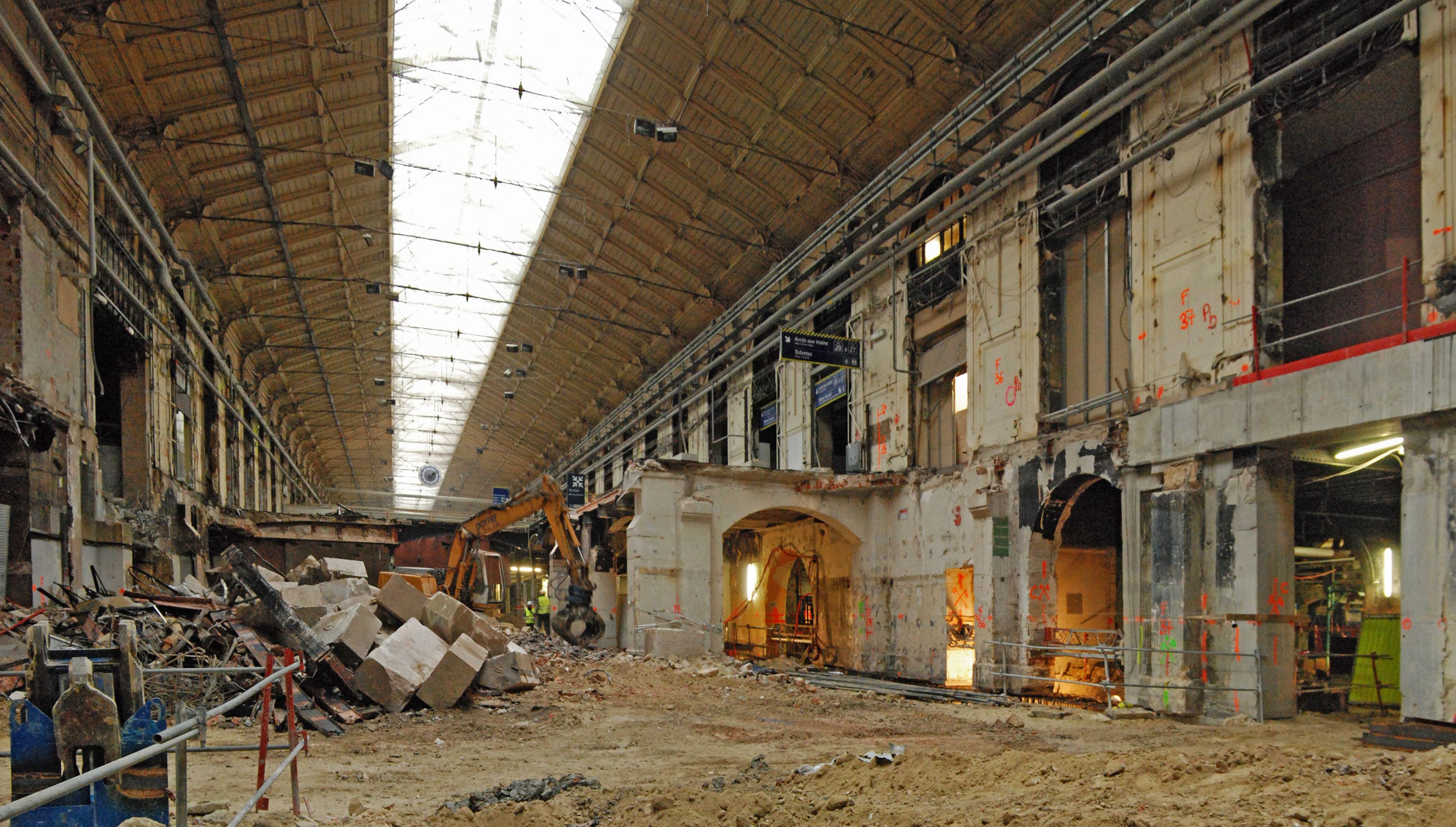 Après une consultation lancée par la SNCF et sa filiale AREP en 1996, c’est le groupement SPIE Batignolles, Klepierre et de l’agence d’architecture DGla (Thierry de Dinechin et Philippe Gorce). Cette opération constitue la troisième phase de travaux de la gare, la dernière s’achèvera l’année prochaine par la restauration des parvis. Les  principales directions de cette restructuration sont : une nouvelle circulation verticales reliant les divers services et moyens de transports ; l’amélioration de la signalétique, l’éclairage, les matériaux (pierre, bois, verre, métal) ; le respect du travail d’Alfred Armand et Juste Lisch ; la création de deux niveaux de parkings en sous-sols.