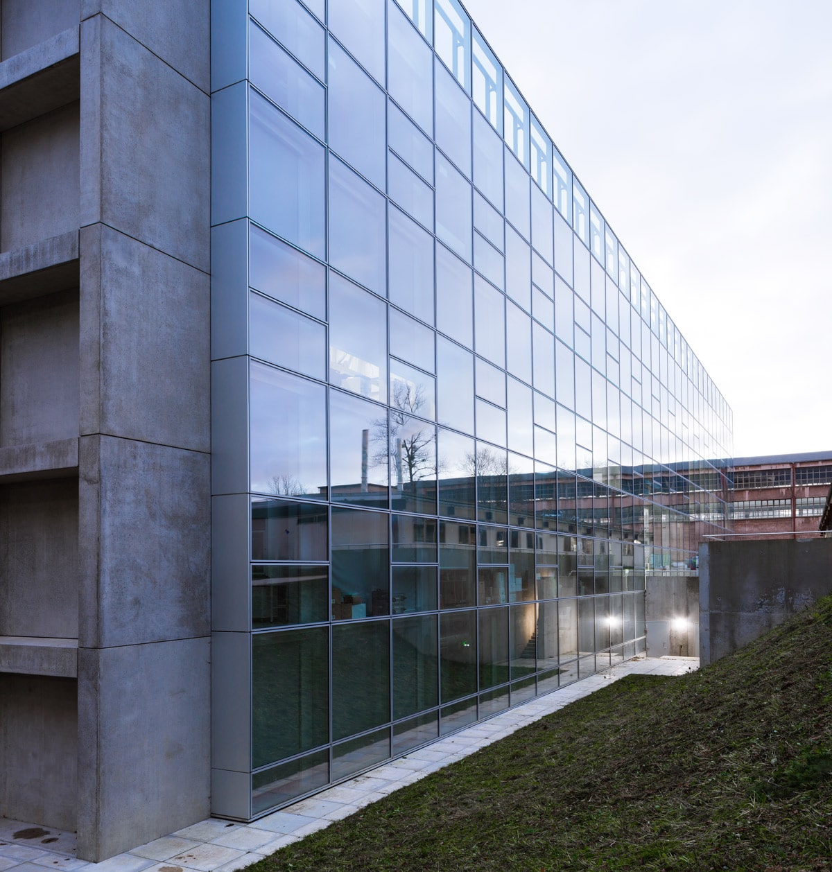 La façade nord, fait le choix inverse. La trame de béton est conservée mais c’est au tour du vitrage de se mettre au premier plan, dévoilant ainsi un grand mur-rideau. Il faut ainsi attendre la nuit tombée pour lire la structure qu’elle dissimule.