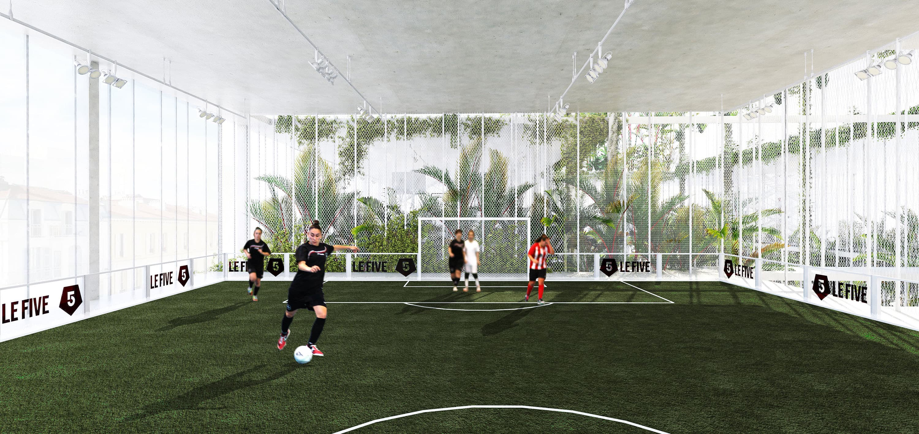 Le second et troisième niveau héberge les chambres de l’hôtel en périphérie tandis que le cœur du projet reçoit les vestiaires de l’équipement sportif. Les niveaux supérieurs abritent sur trois niveaux : quatre terrains de football, trois terrains de basket, quatre terrains de paddle, neuf salles de trampoline. On retrouve bien sûr deux terrains de pétanque, afin de se préparer aux visites des marseillais.