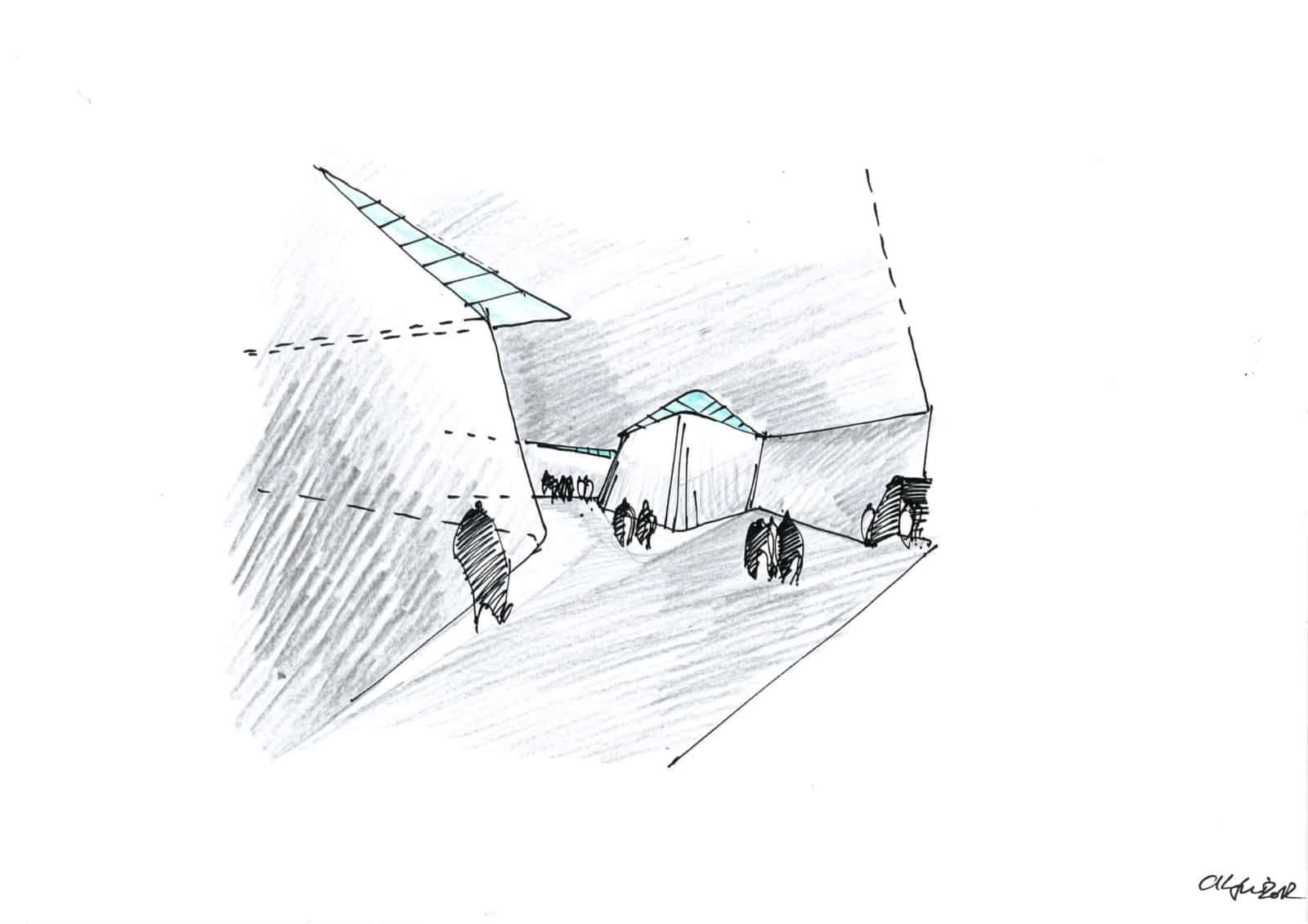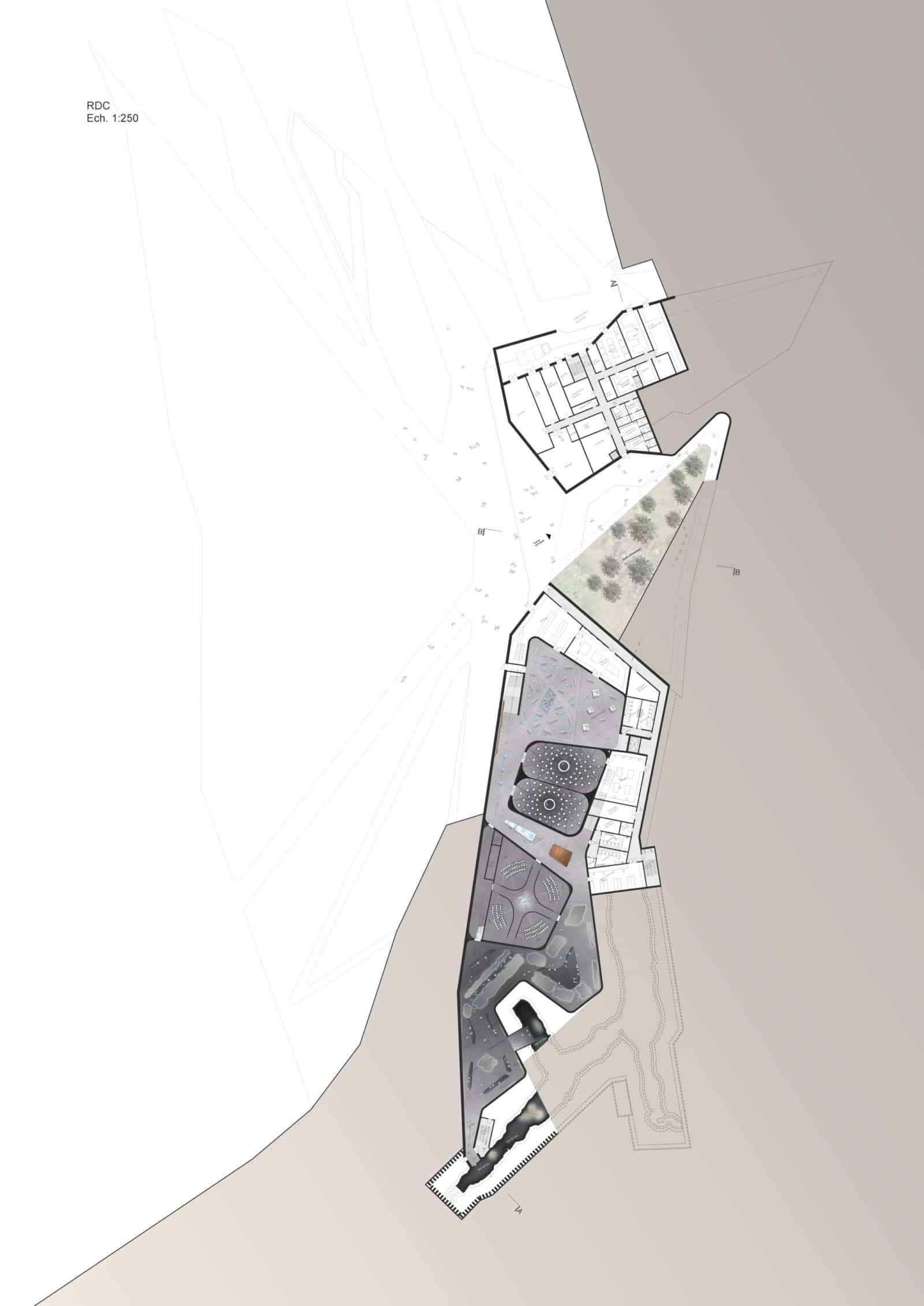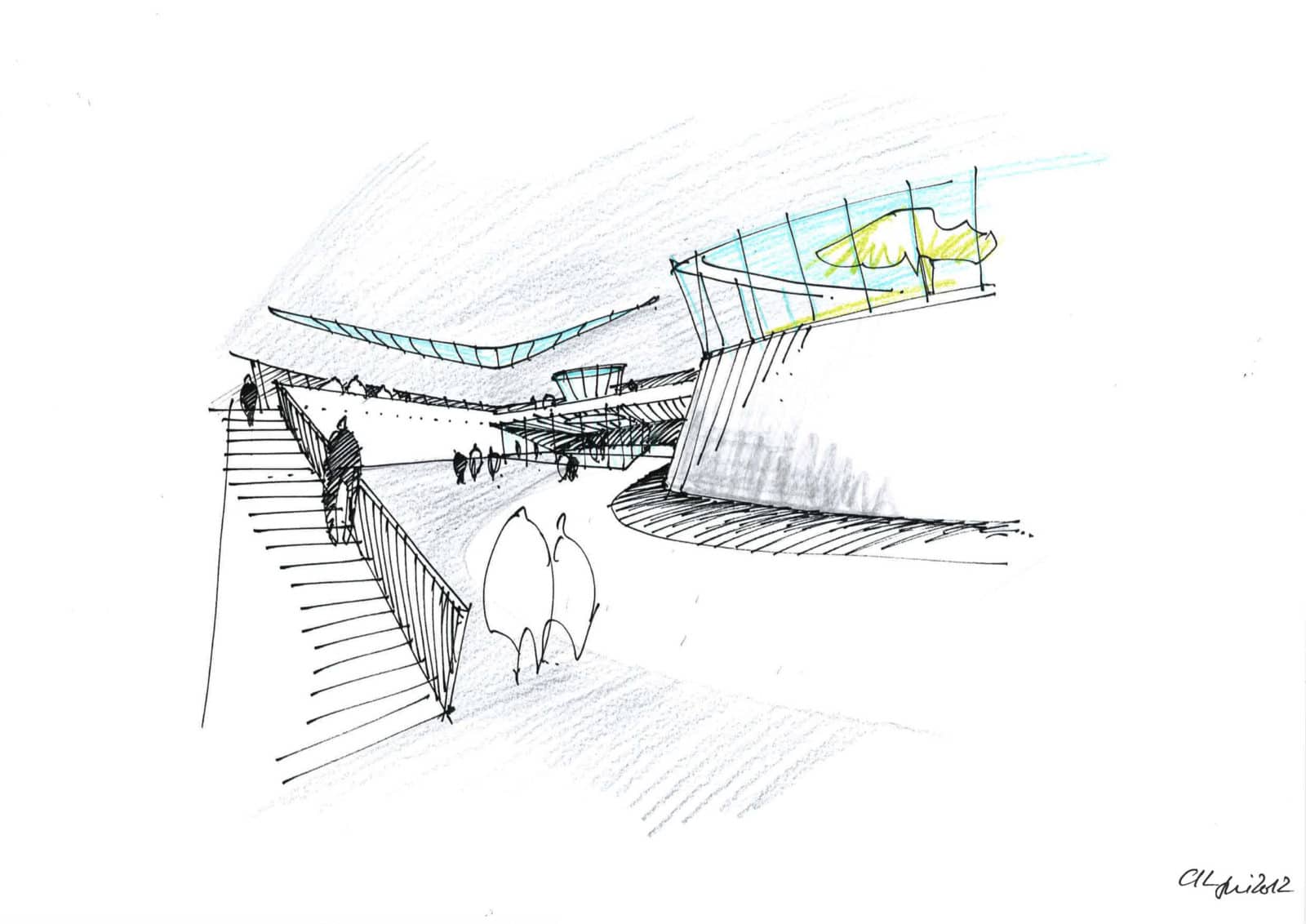 Reproduisant les falaises avoisinantes, les façades se plient et s’inclinent au gré de la pente. Vêtu d’une peau lamellée en calcaire, ce volume s’évide en son centre afin de former un patio où vient s’enrouler la rampe d’accès. L’accès est signalé par un soulèvement du soubassement qui permet d’aérer le patio. Une seconde rampe vient épouser la façade principale et mène le visiteur sur une toiture traitée en strates de calcaire et perforée par des puits de lumière.