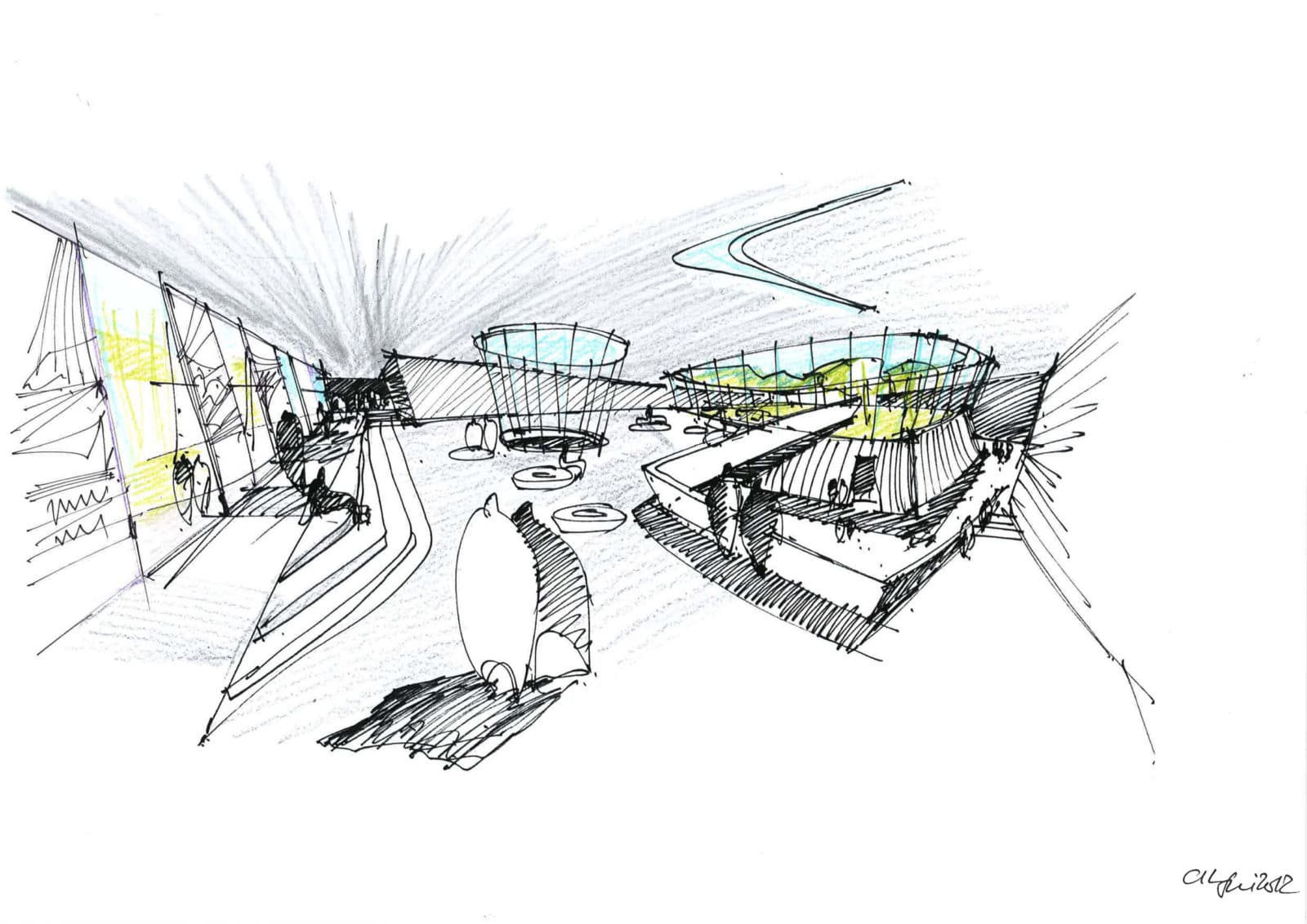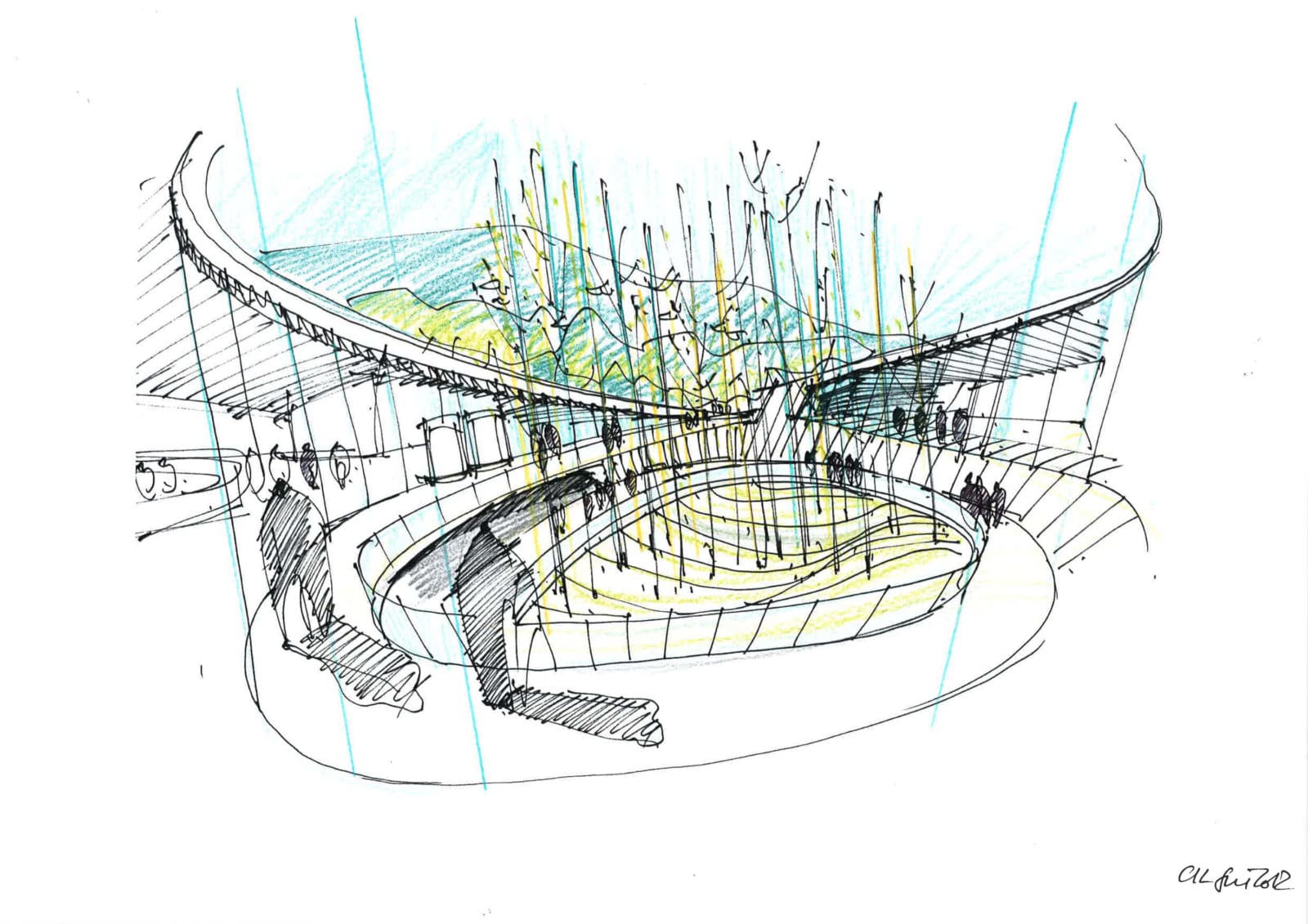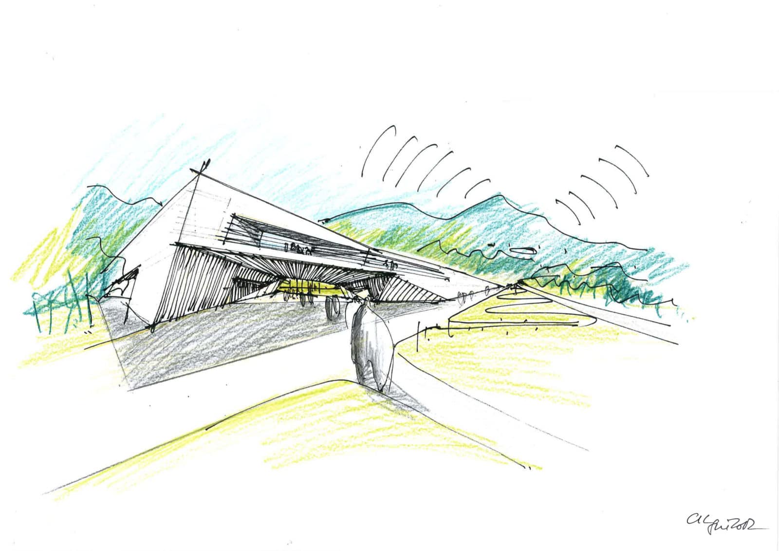 Reproduisant les falaises avoisinantes, les façades se plient et s’inclinent au gré de la pente. Vêtu d’une peau lamellée en calcaire, ce volume s’évide en son centre afin de former un patio où vient s’enrouler la rampe d’accès. L’accès est signalé par un soulèvement du soubassement qui permet d’aérer le patio. Une seconde rampe vient épouser la façade principale et mène le visiteur sur une toiture traitée en strates de calcaire et perforée par des puits de lumière.