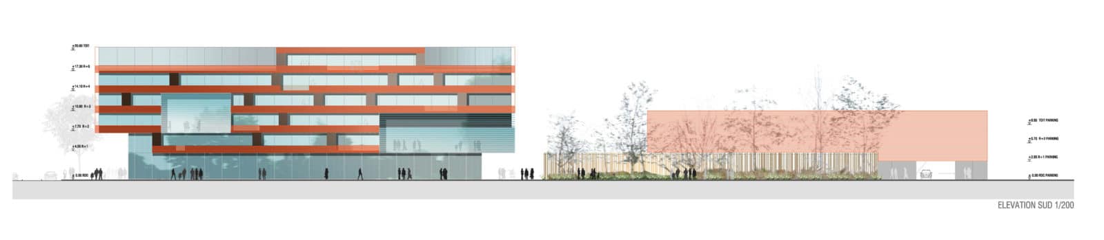 Ce bâtiment de par ses qualités environnementales labellisées HQE lie le patrimoine en utilisant la brique comme matériau pour les lamelles de façades disposées à 60 cm de la structure. Entre ces deux parois, des passerelles techniques seront installées. L’isolation extérieure sera revêtue de feuilles d’aciers plissées. Plusieurs serres de deux niveaux arborées de végétations rythment la périphérie, équipées de lamelles mobiles, elles faciliteront la circulation de l’air depuis l’extérieur.