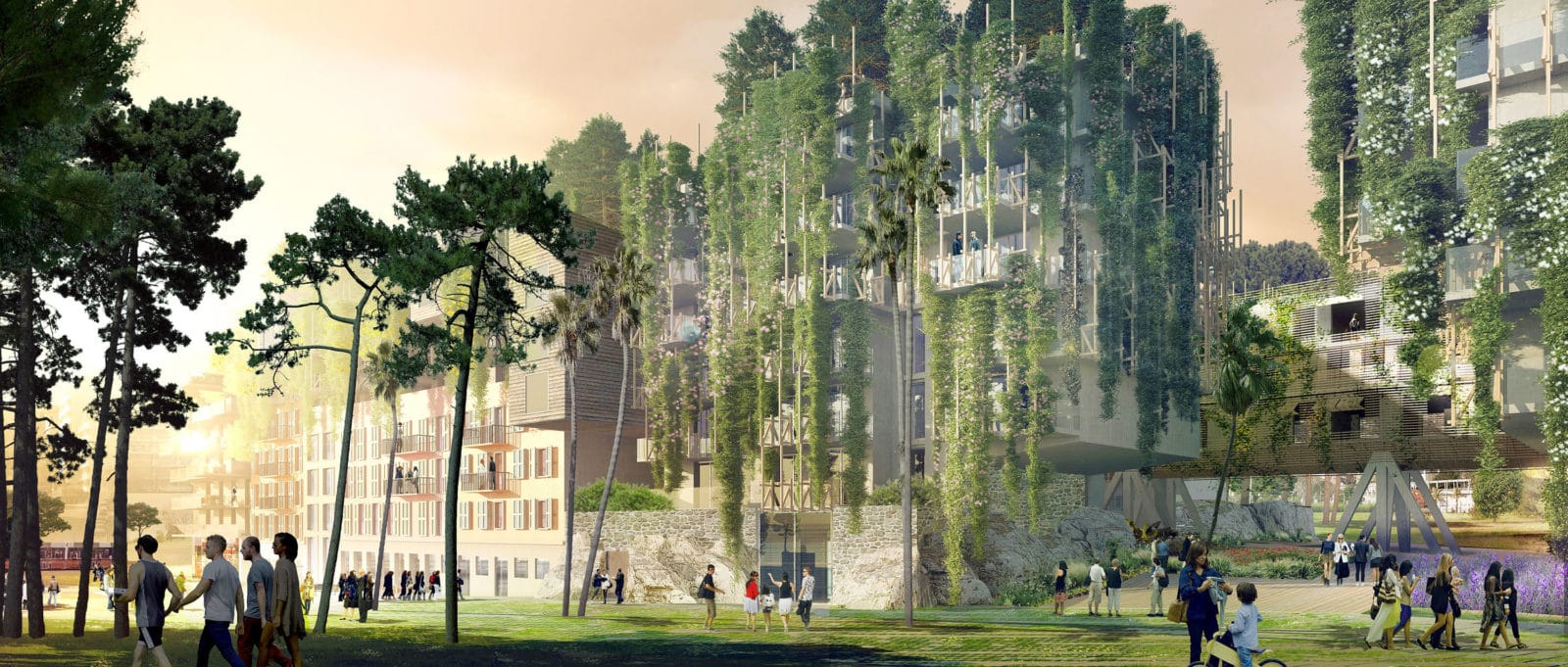 Les architectes se sont « inspirés de la topographie du paysage niçois, où les rochers blancs font écho aux soubassements de pierre des villas perchées au milieu d’une végétation dense, il recrée une forme de mont verdoyant où la végétation côtoie le minéral et le bois ».