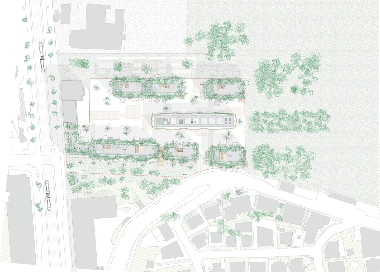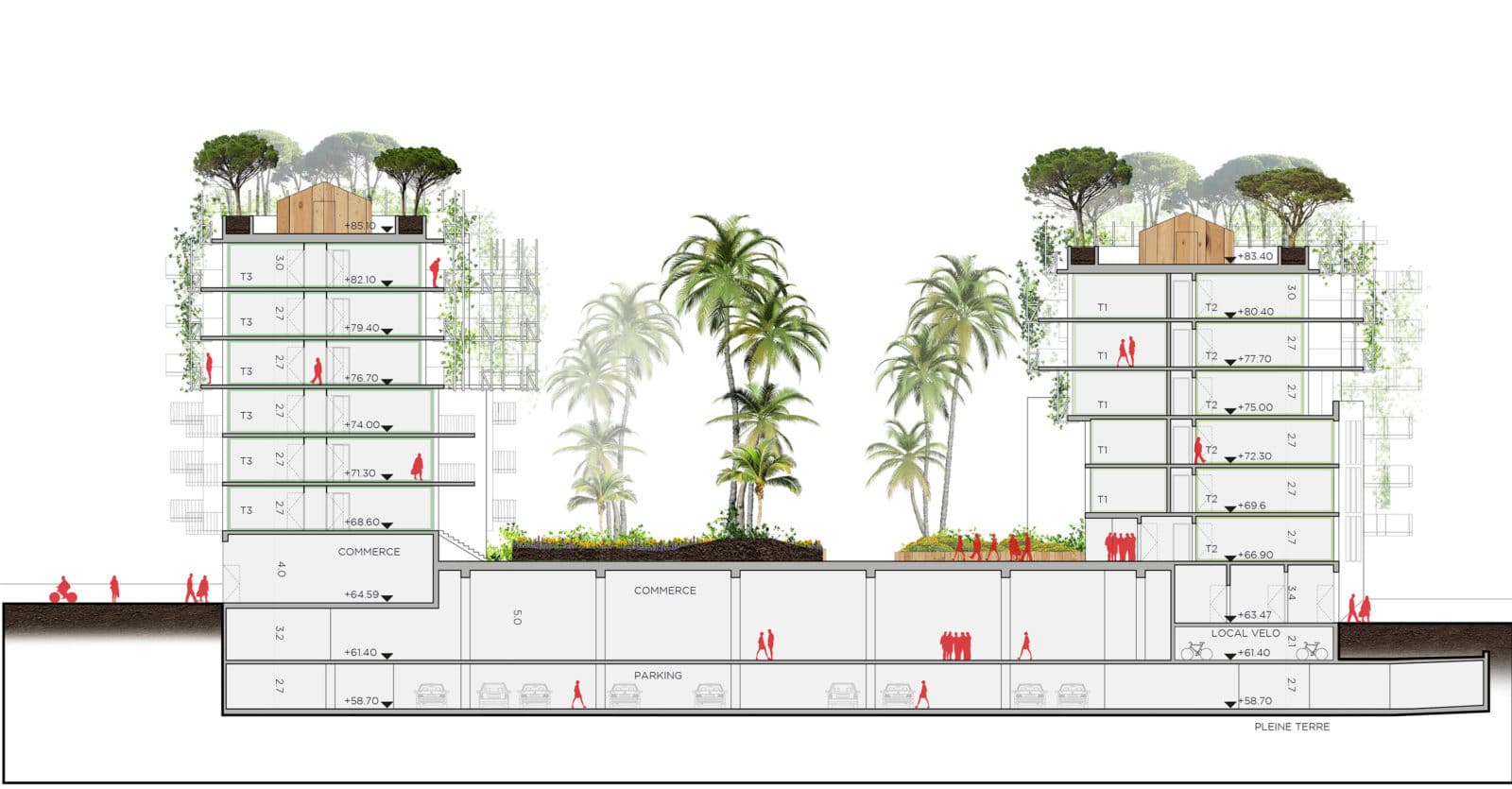 Le projet se compose de deux ensembles parallèles en R+5 et R+6 en bordure Sud et Nord de parcelle, à cela, vient s’insérer R+3 largement décollé du sol afin d’assurer une parfaite continuité des espaces verts intérieurs. Les architectes ont laissé la nature entrer dans le projet, la liaison entre le parc et le projet sans aucune discontinuité.