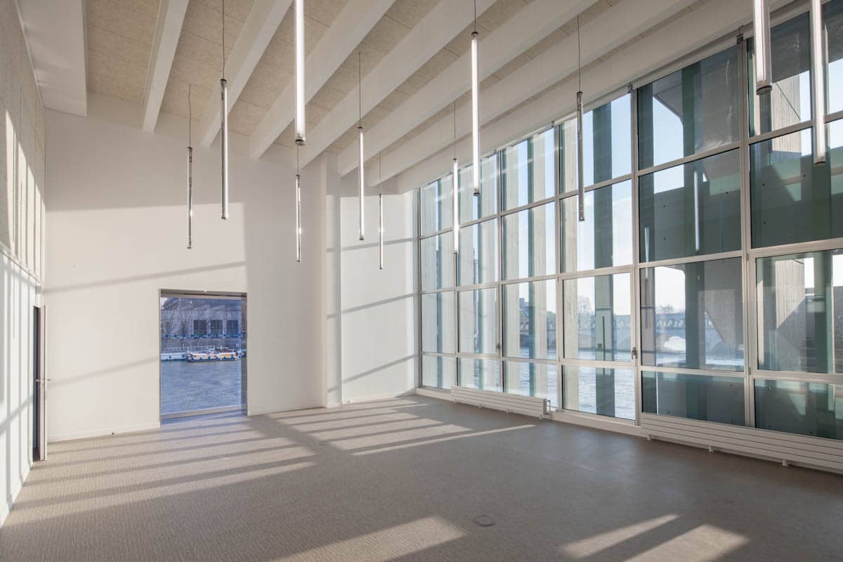 Libres de toutes contingences techniques, les plateaux de bureaux sont de grands espaces d’environ 300 m2. Les sanitaires et les escaliers de secours sont rejetés à chaque extrémité. Les solutions de plafonds rayonnants acoustiques hybrides s’intègrent entre les poutres à la manière de tapis, sans gêner les cloisonnements ultérieurs.