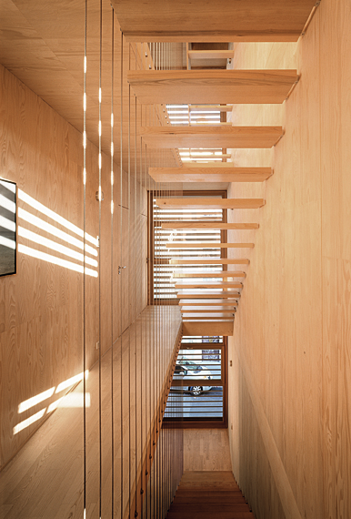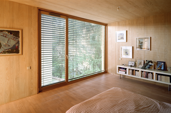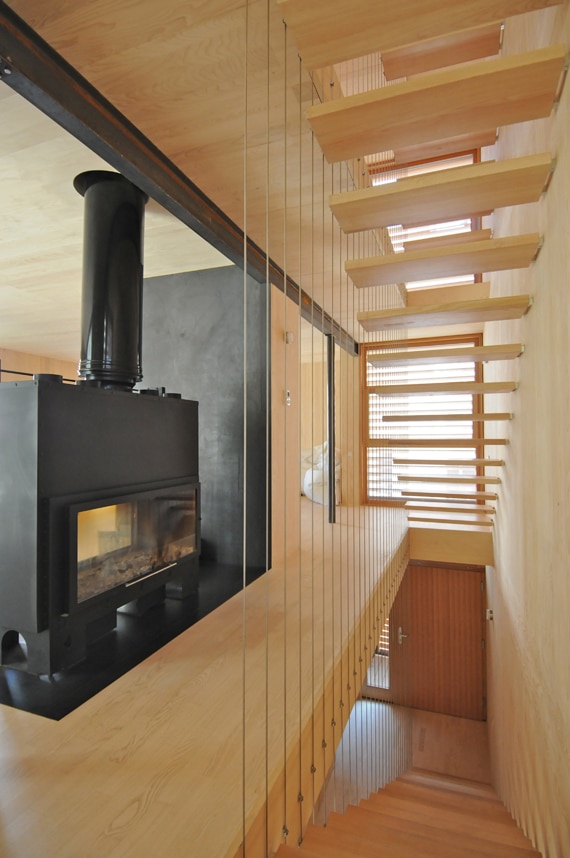 L’écriture est systématique. Tous les intérieurs, plafonds et cloisons compris, sont traités en panneaux massifs en multiplis de sapin blanc. Aucun placage ni peinture ne vient perturber cette mise en œuvre. A l’extérieur, les panneaux bakélisés noirs enveloppent tout le volume, mais conservent leur statut d’habillage et de vêture légère, comme un manteau. Ce contraste, choisi dans les extrêmes, explique le procédé constructif : une structure intérieure, habillée et isolée par l’extérieur. Elle est le résultat d’une volonté scénographique, où cet effet de Ying et de Yang crée des tableaux très graphiques dans la mise en perspective des deux mondes. Àcertaines heures, au moment où la lumière du jour est plus faible, le noir du dehors vient doper et stimuler les lumières boisées émanant de l’intérieur. L’un éclaire l’autre, l’adoucit et le réchauffe. Une seule matière, utilisée en totalité et exclusivement, sans effet décoratif ou vocabulaire superflu, laisse la part belle à l’architecture.