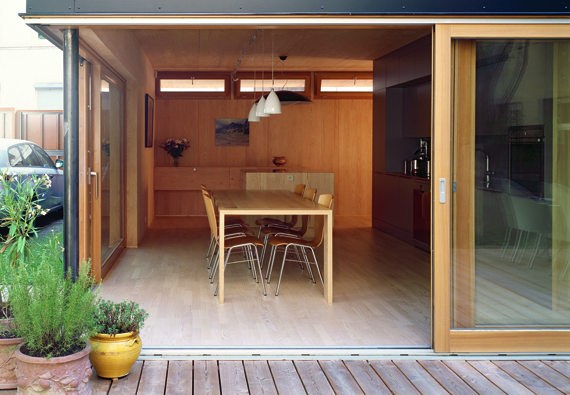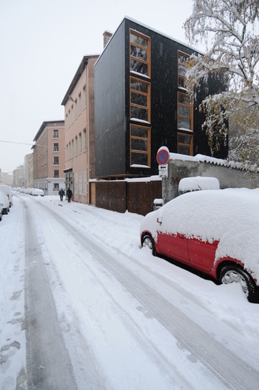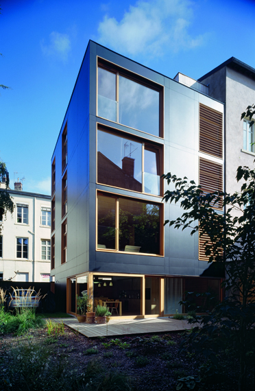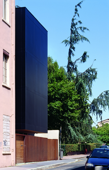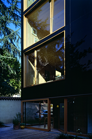 Face à l’exiguïté de la parcelle et aux multiples vis-à-vis, les architectes de Tectoniques ont adopté une stratégie de judoka. La maison s’adosse et se tourne, en évitant la confrontation frontale. Elle exploite les quelques failles du paysage qui libèrent de furtives perspectives, pour alimenter les vues et les ambiances de la maison. Entièrement préfabriquée, la maison a été construite en moins de huit jours, engendrant un bel effet de surprise, et du coup des réactions assez contrastées du voisinage au moment de son “apparition”. Malgré sa couleur noire et sa forme sans concession, elle n’affiche aucune agressivité. Elle s’inscrit au contraire en douceur dans le paysage de la rue, avec une présence paisible et une relative discrétion.